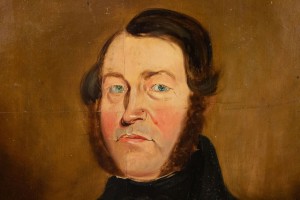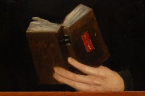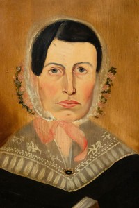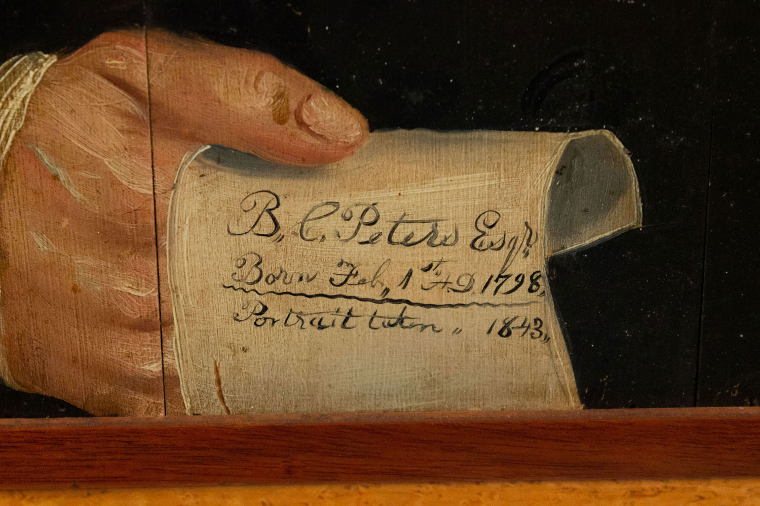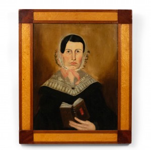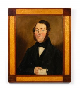 PAIR of American Country (19th Cent) mahogany and birdseye maple framed oil painting portraits of man with paper and lady with book (signed)