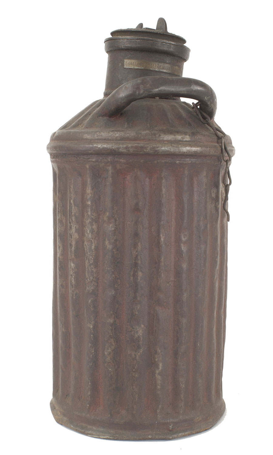 American Country-style (19/20th Century) cylindrical patinated metal fire can with ribbed sides and a molded handle