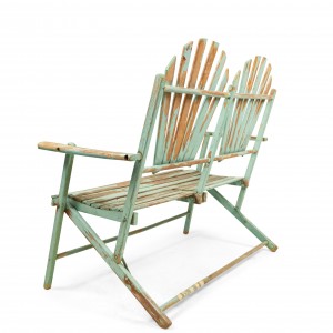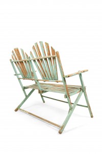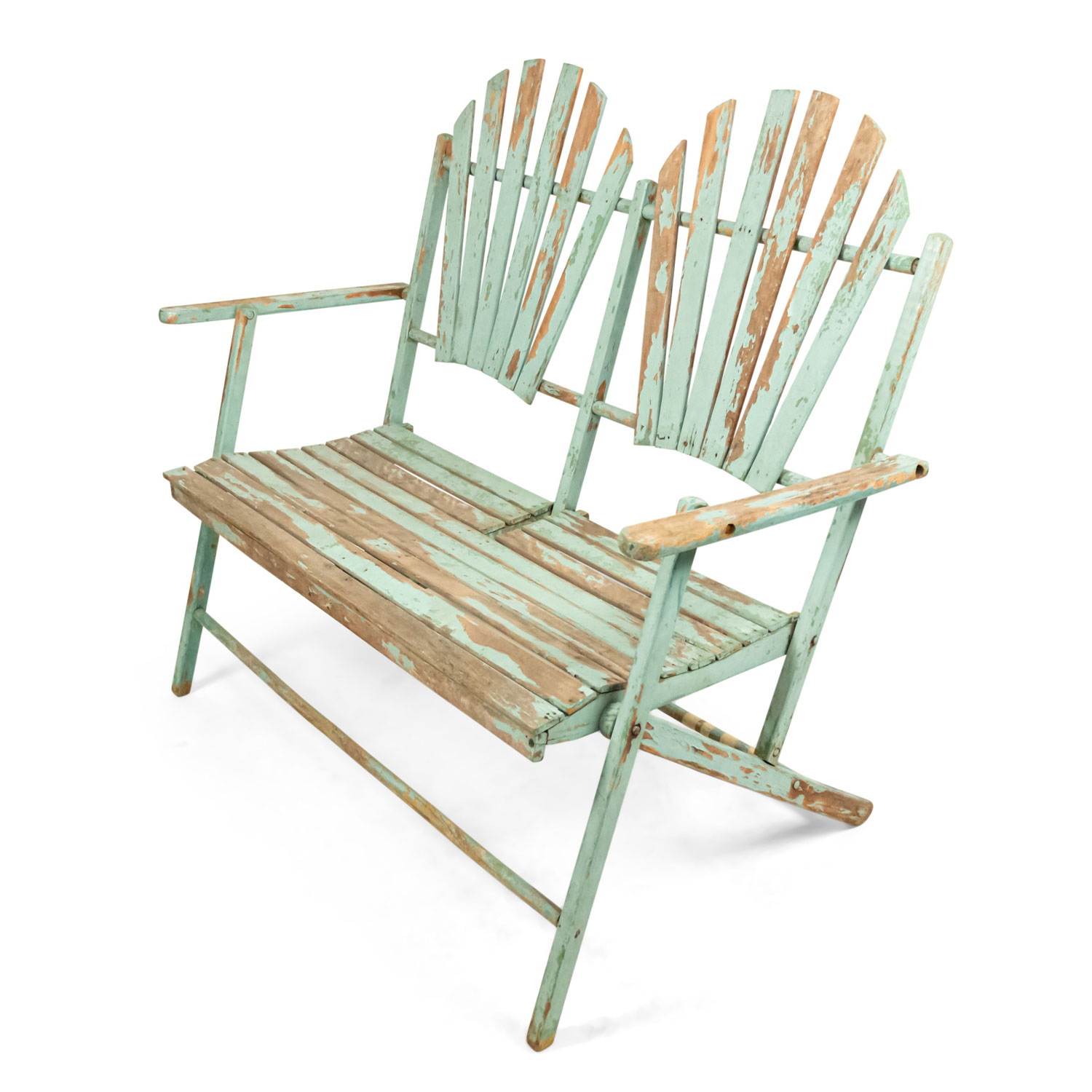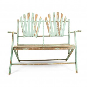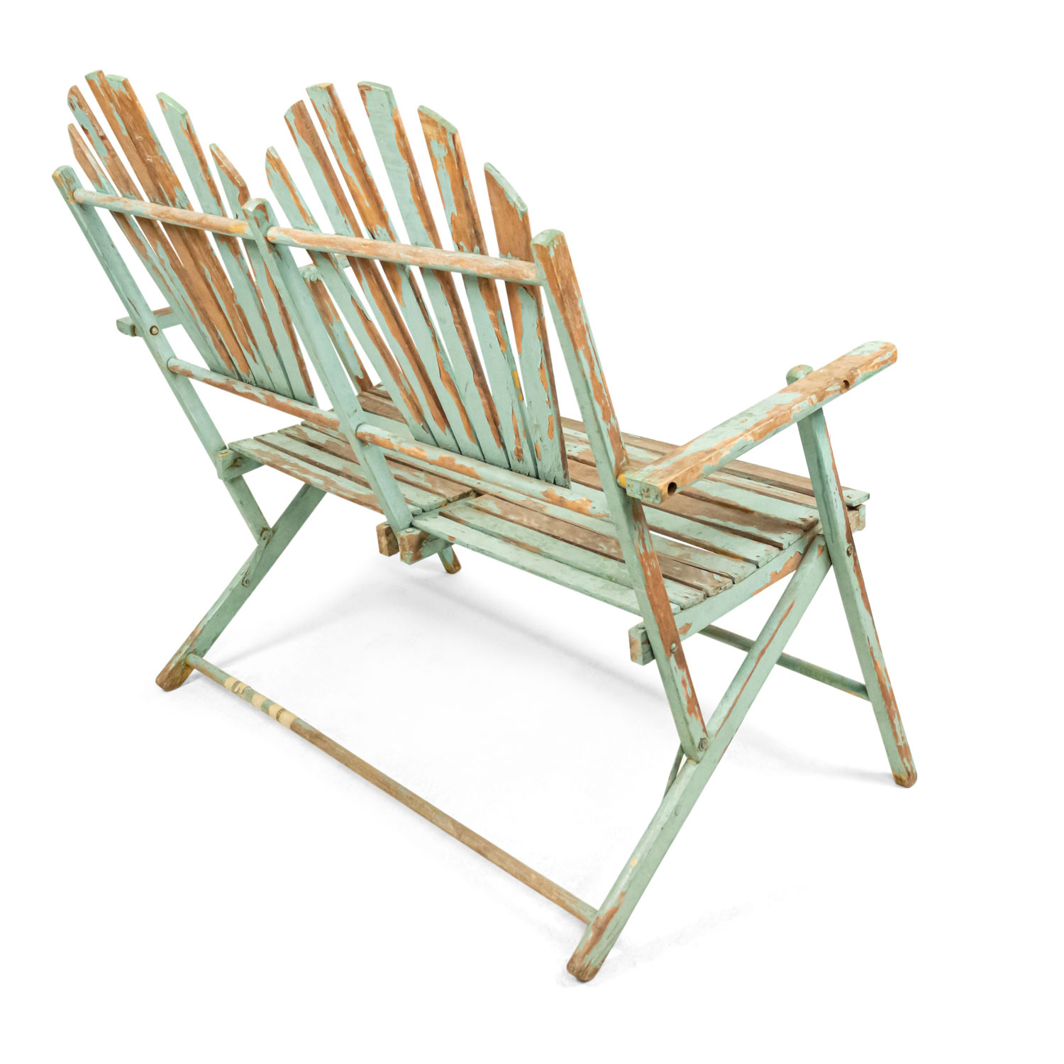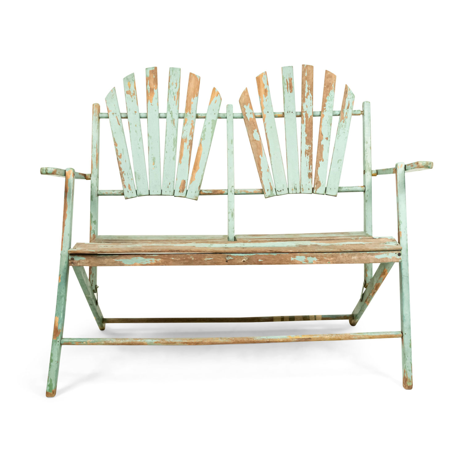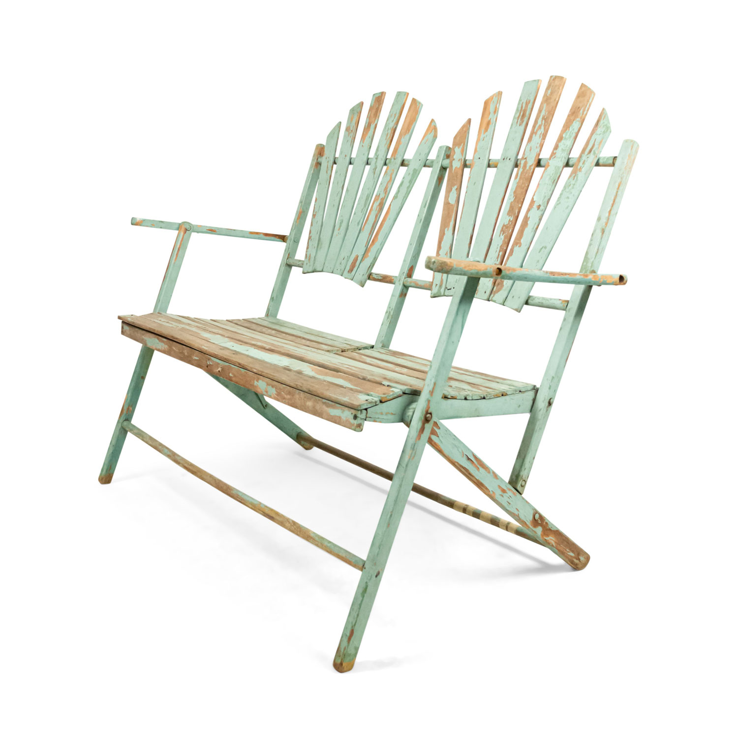 American Country style (19/20th Century) Outdoor folding loveseat with a weathered green painted slat design seat and double fan back back