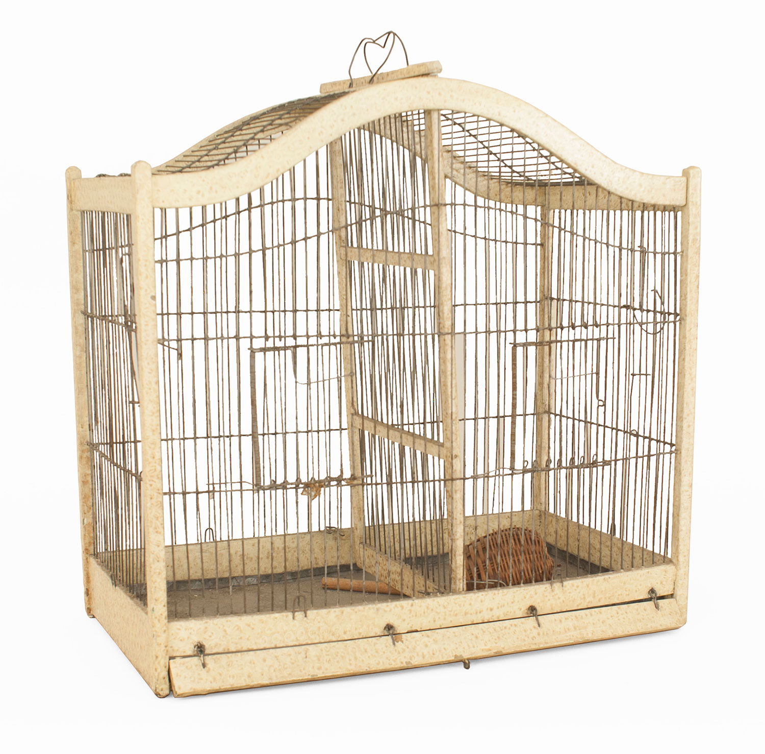 American Country (19/20th Cent) cream painted wood and wire bird cage with a shaped top and 2 separate chambers
