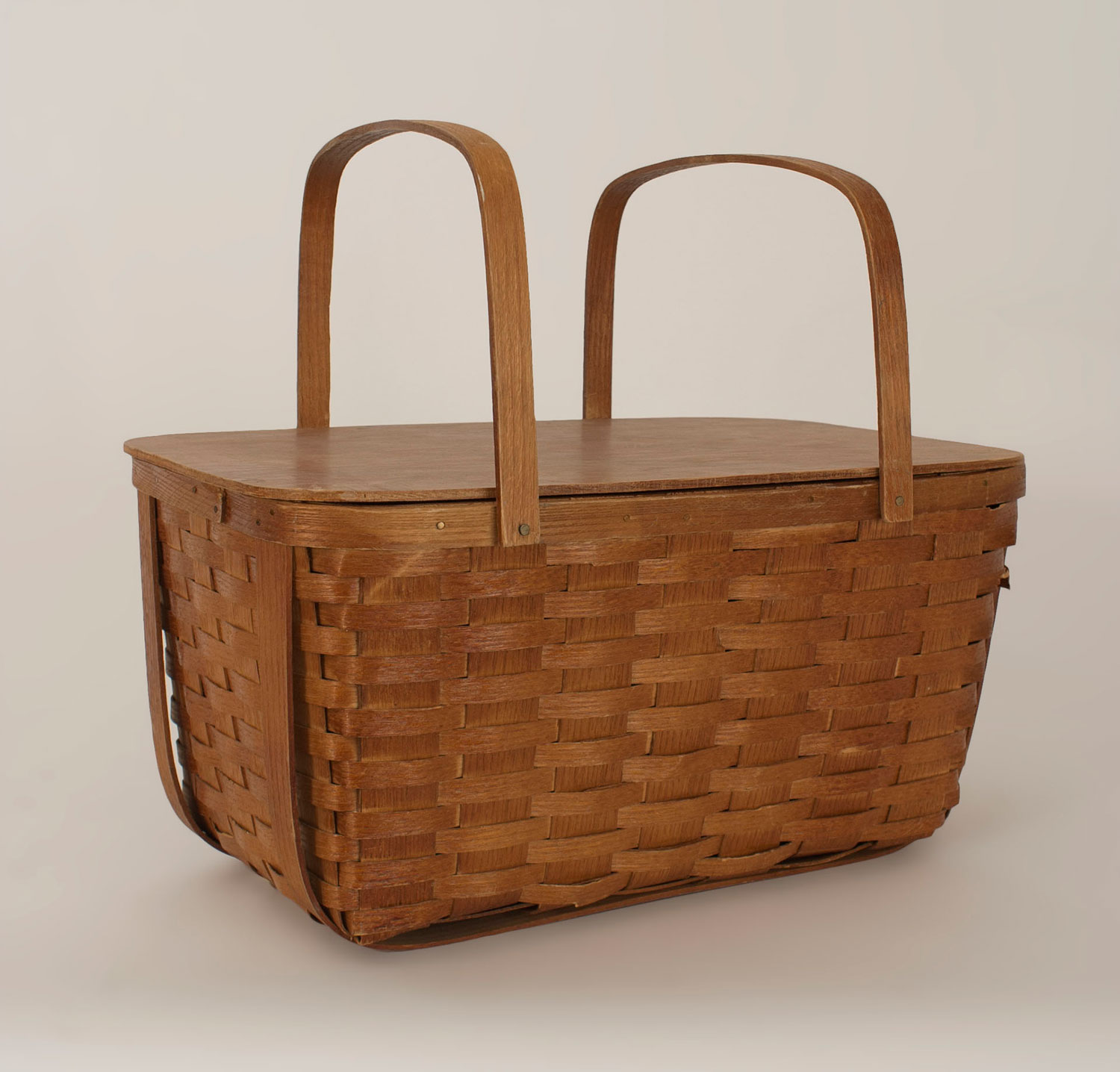 American Country natural splint wood picnic basket with a plywood lift top and handles