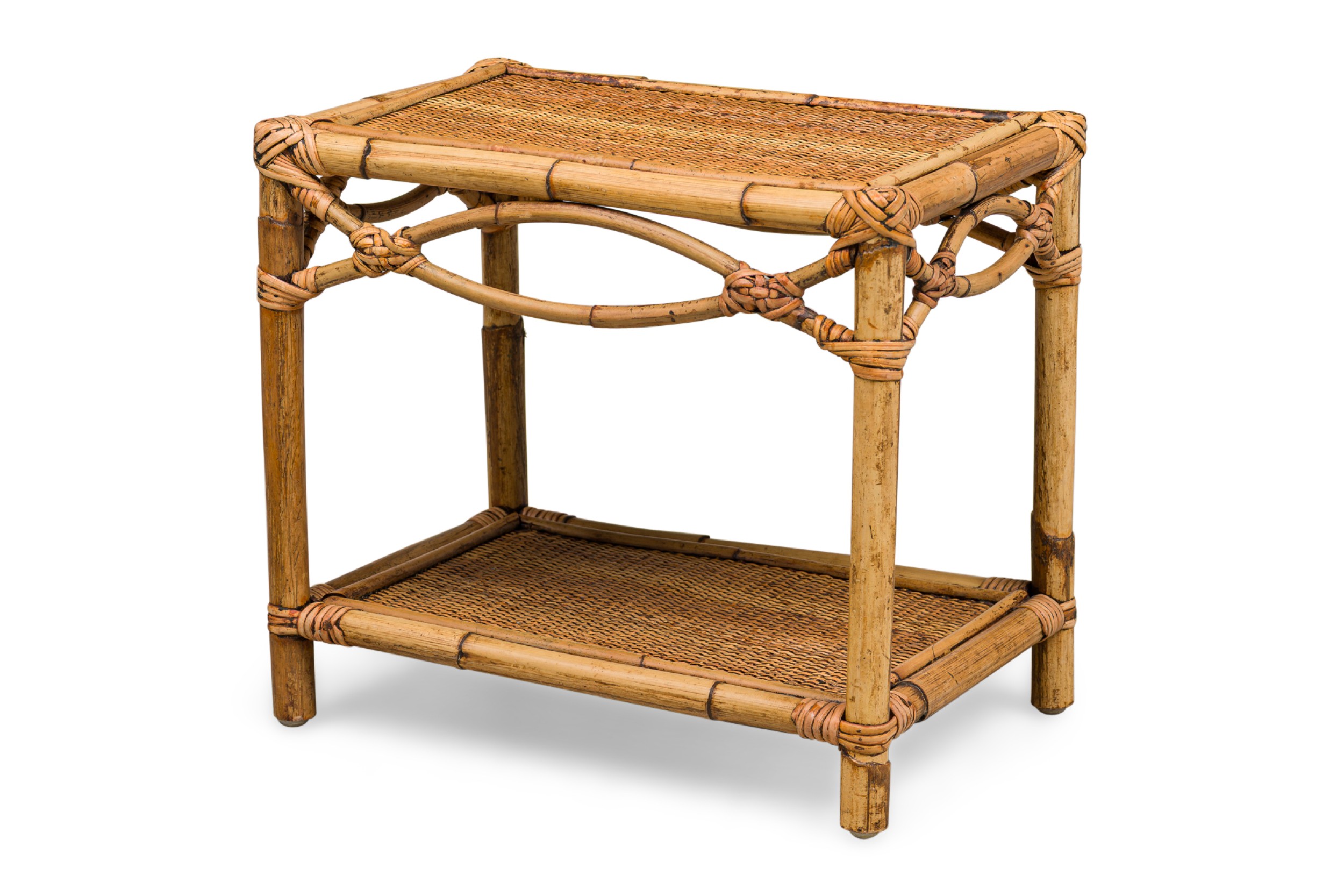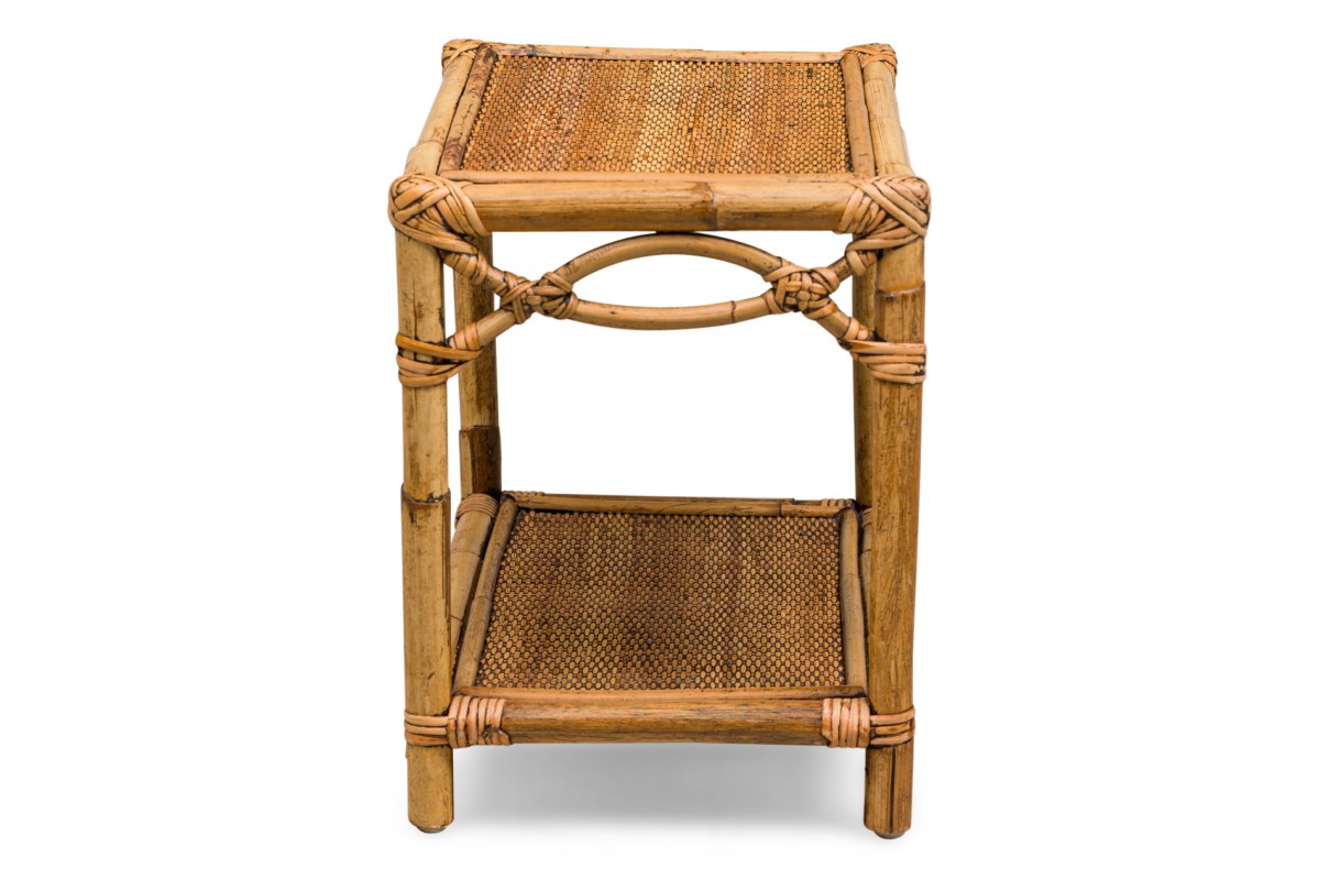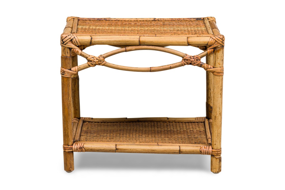 Bamboo Mid-Century small rectangular end / occasional table having a rattan top and shelf with a double helix apron