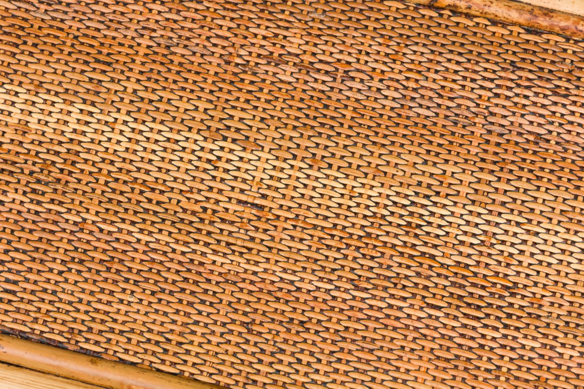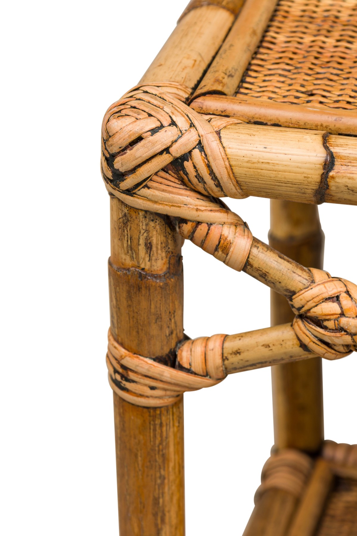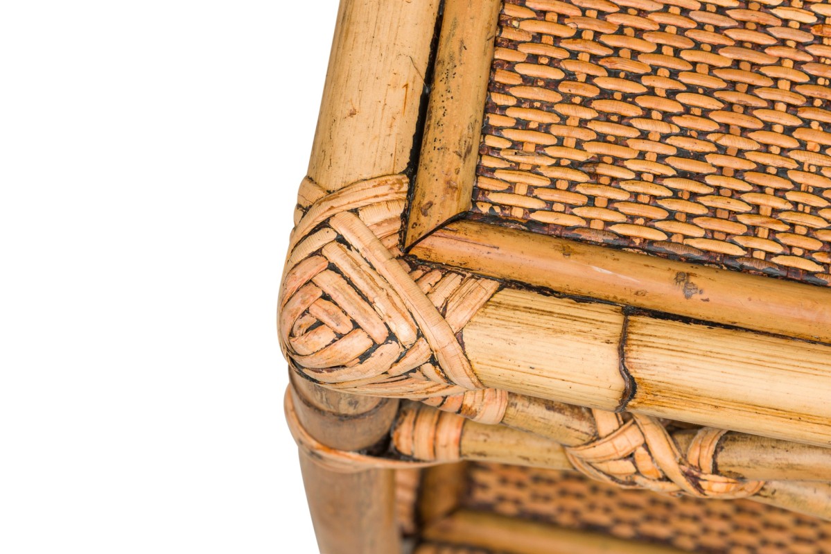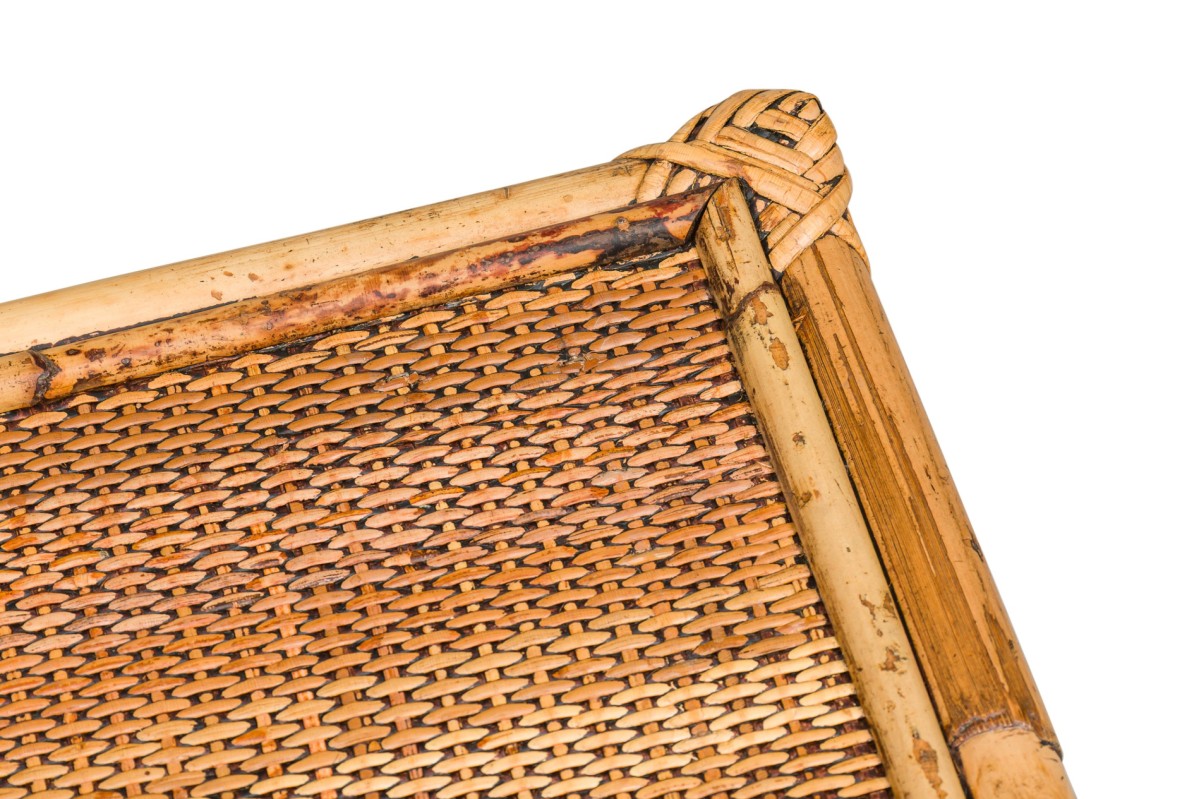Bamboo Mid-Century small rectangular end / occasional table having a rattan top and shelf with a double helix apron