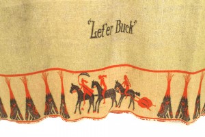 American Country Rustic Western style green wall hanging with a scene of a cowboy riding a horse with Indian and other Western motifs titled "Let r buck" (top of hanging is ripped)