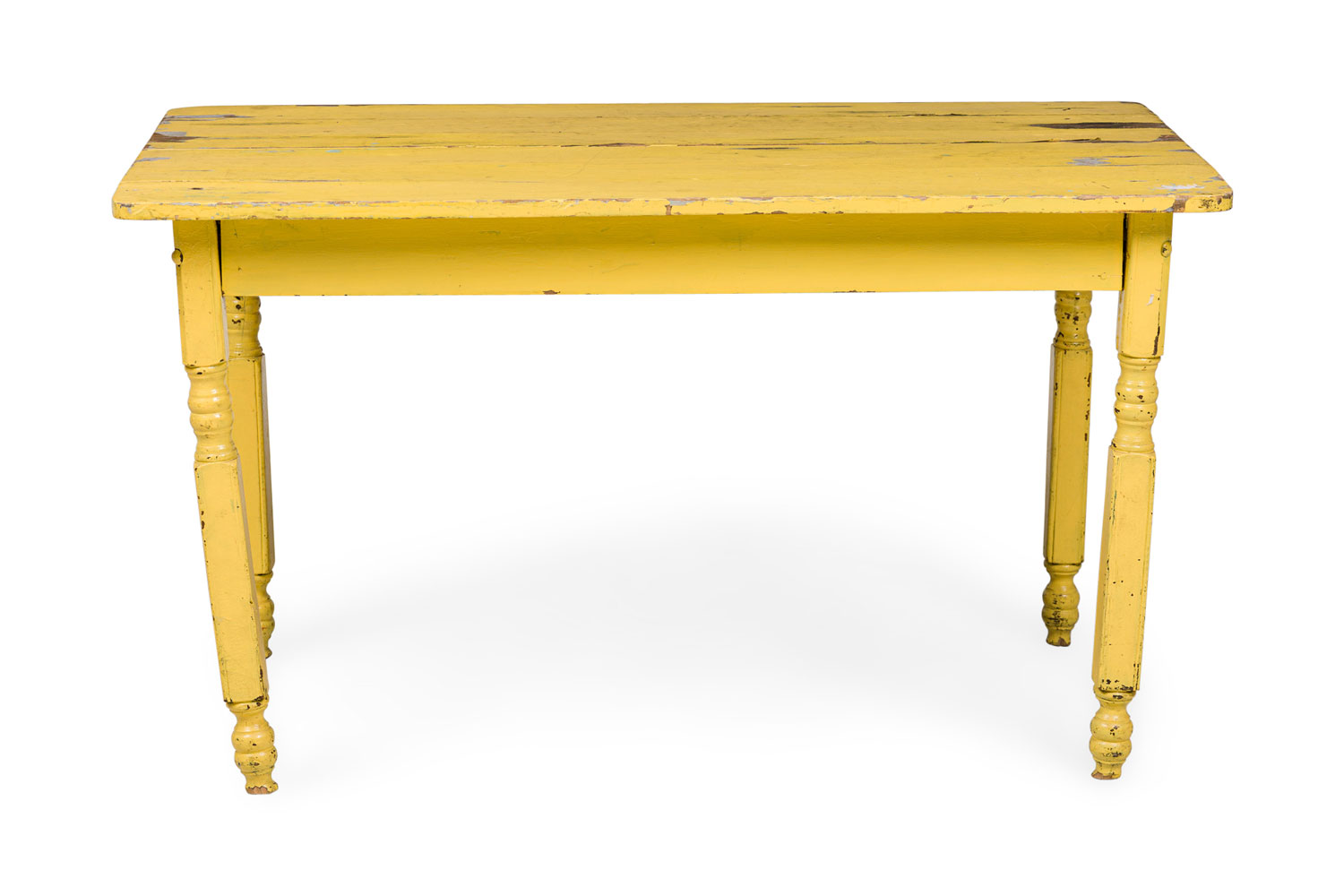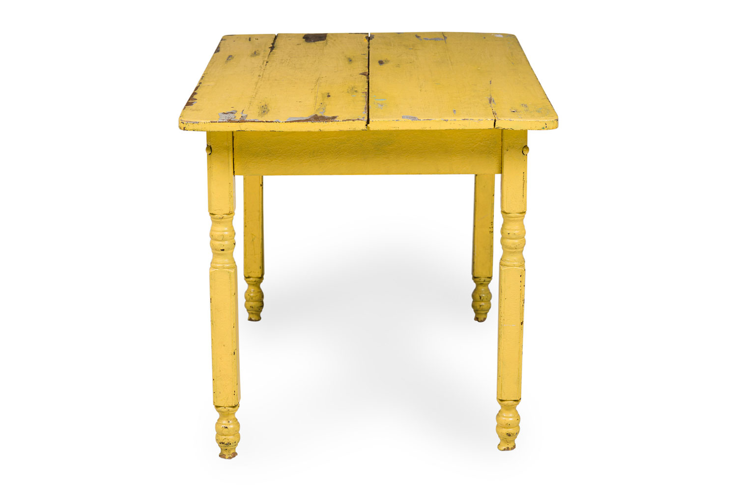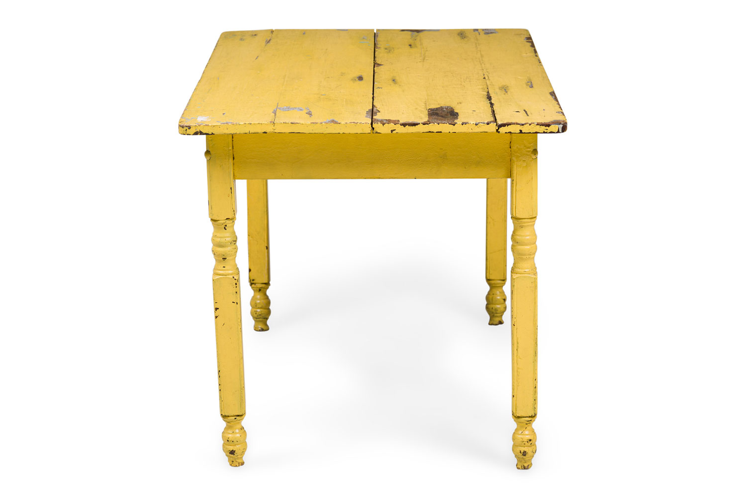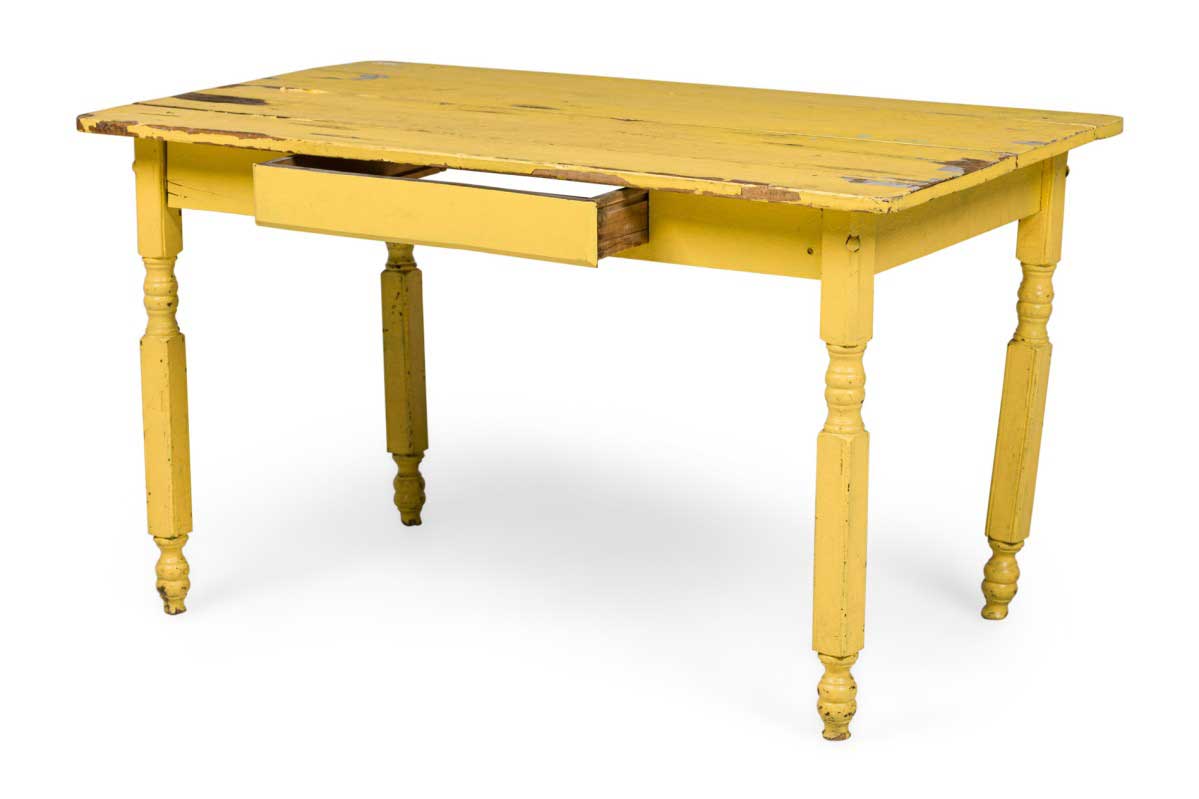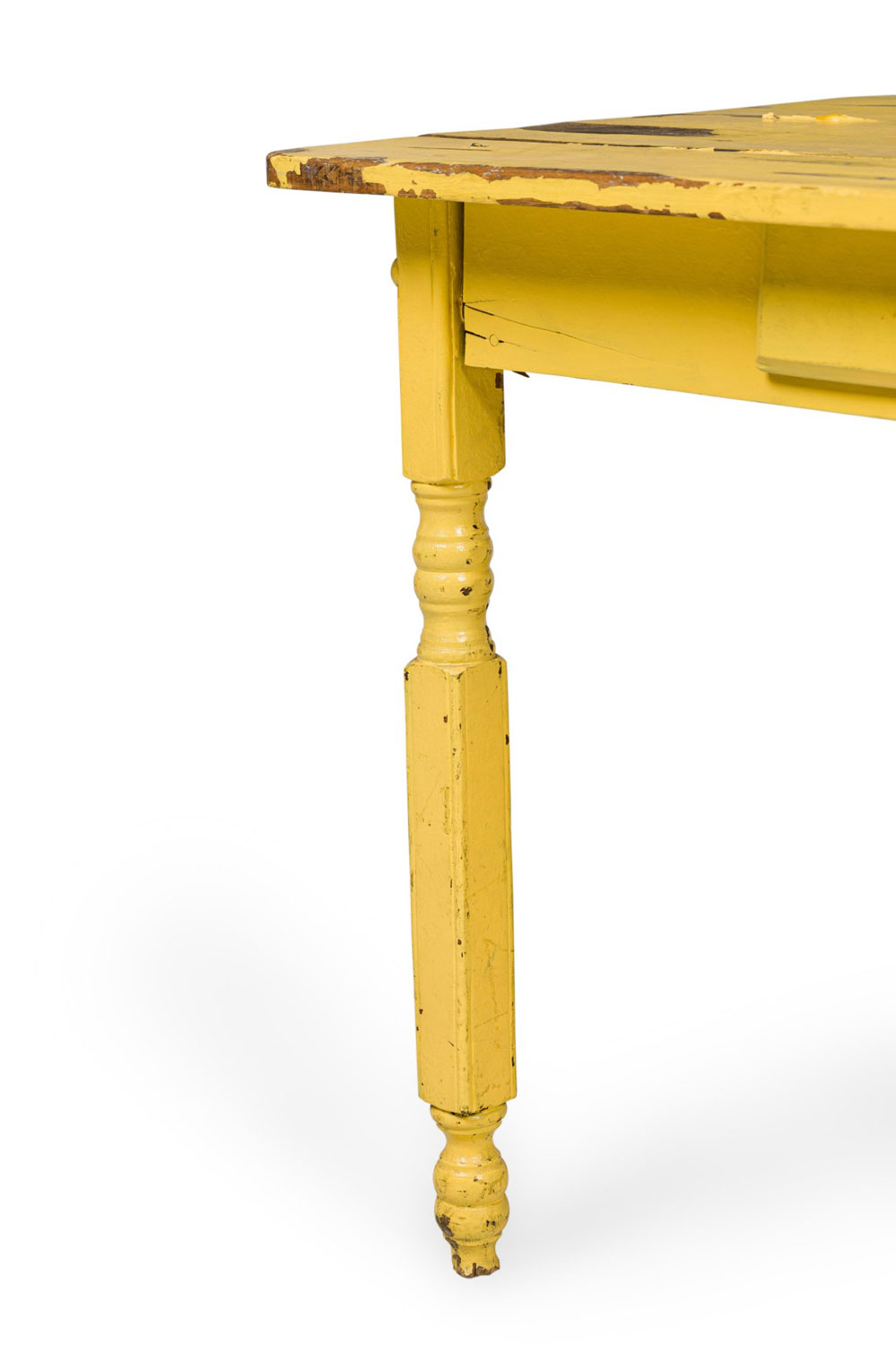 American Country Rustic-style (19th Century) rectangular yellow painted work /dining table with square and turned legs having a single drawer.