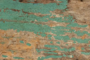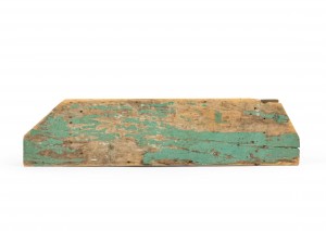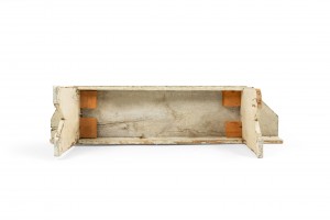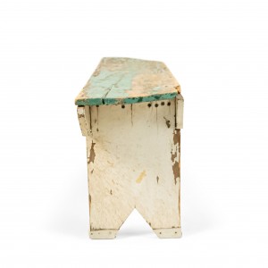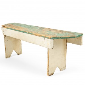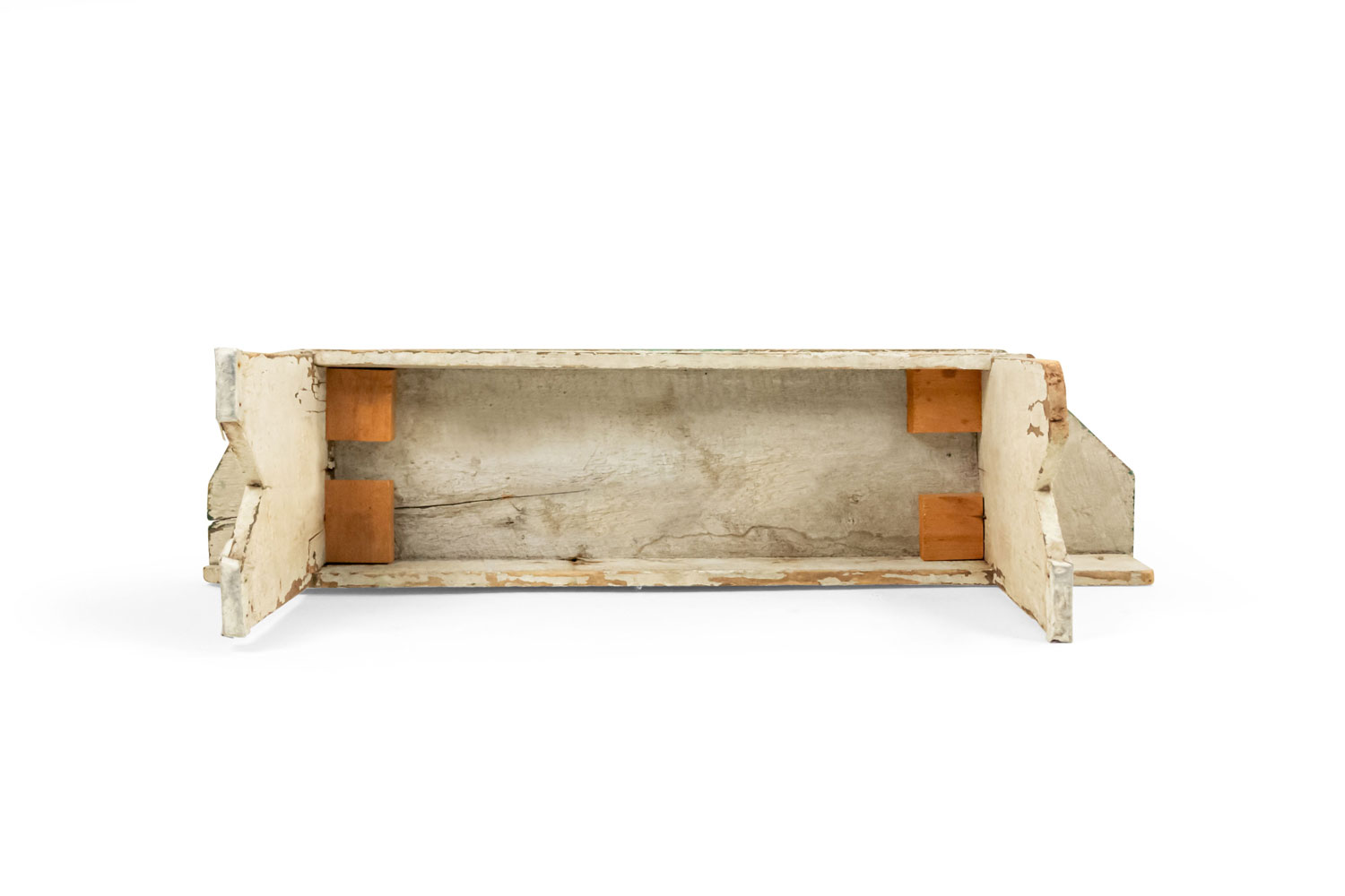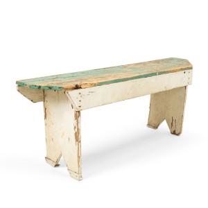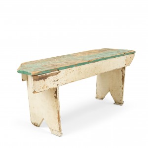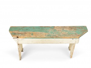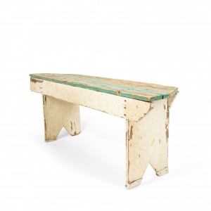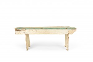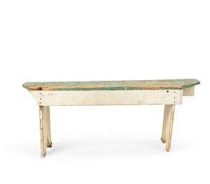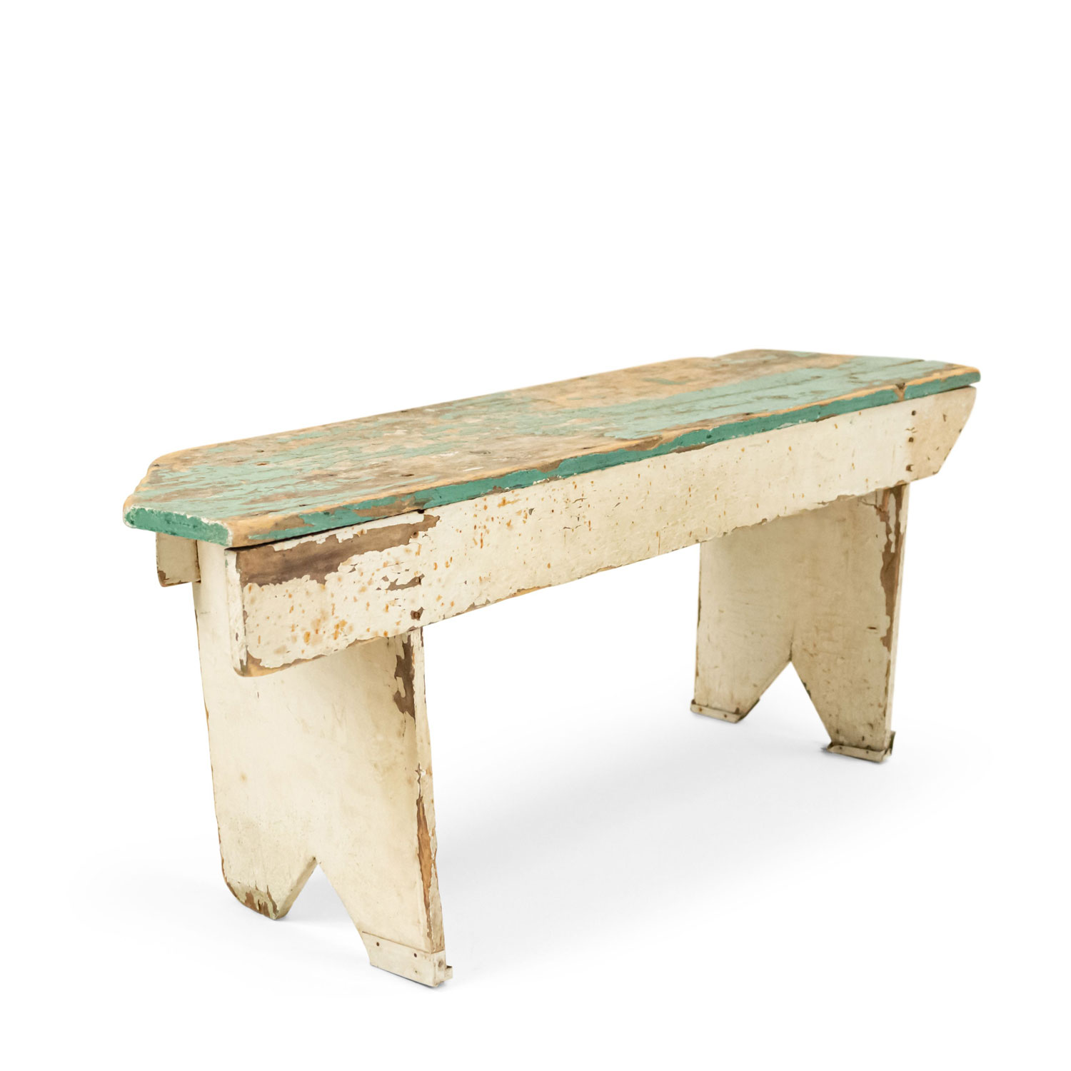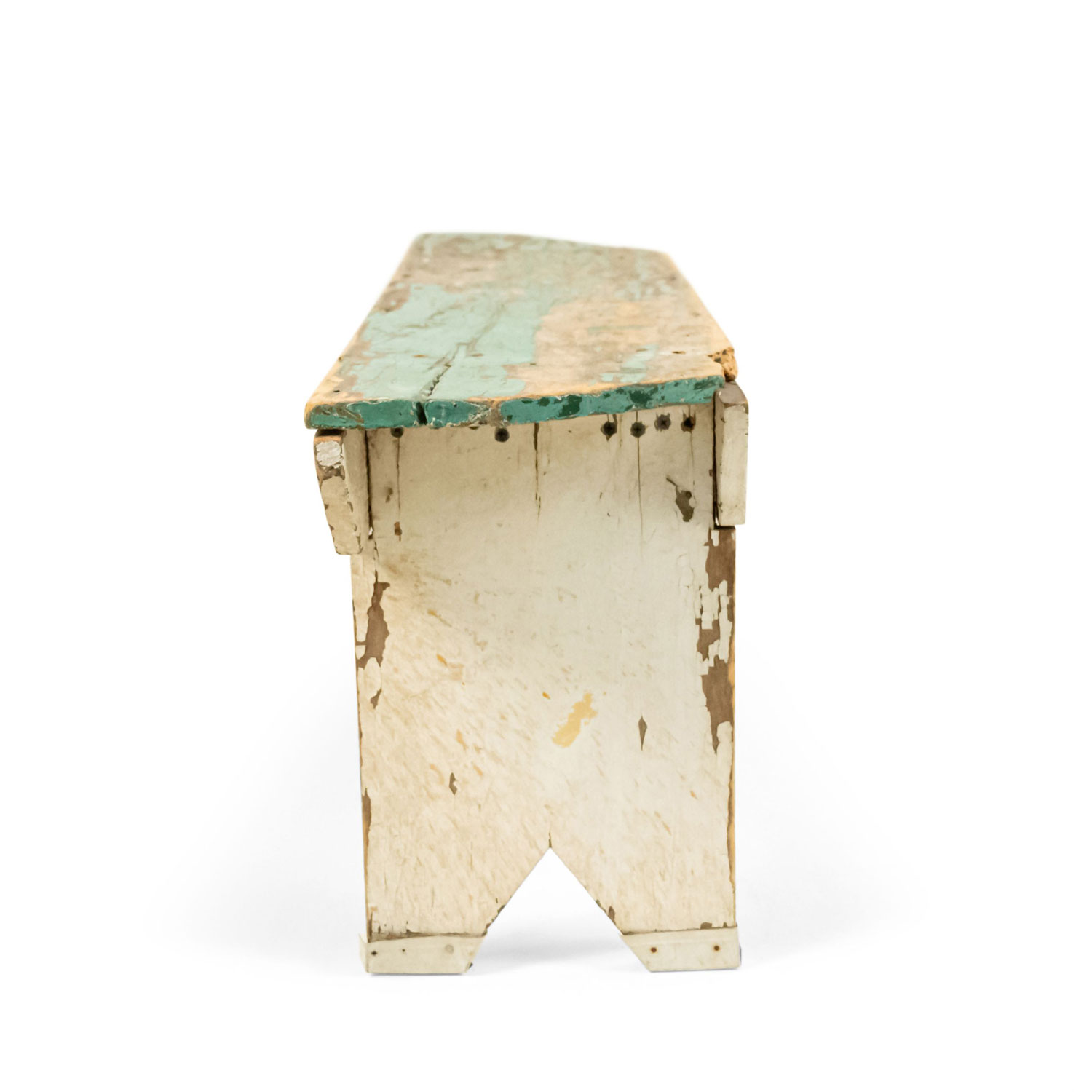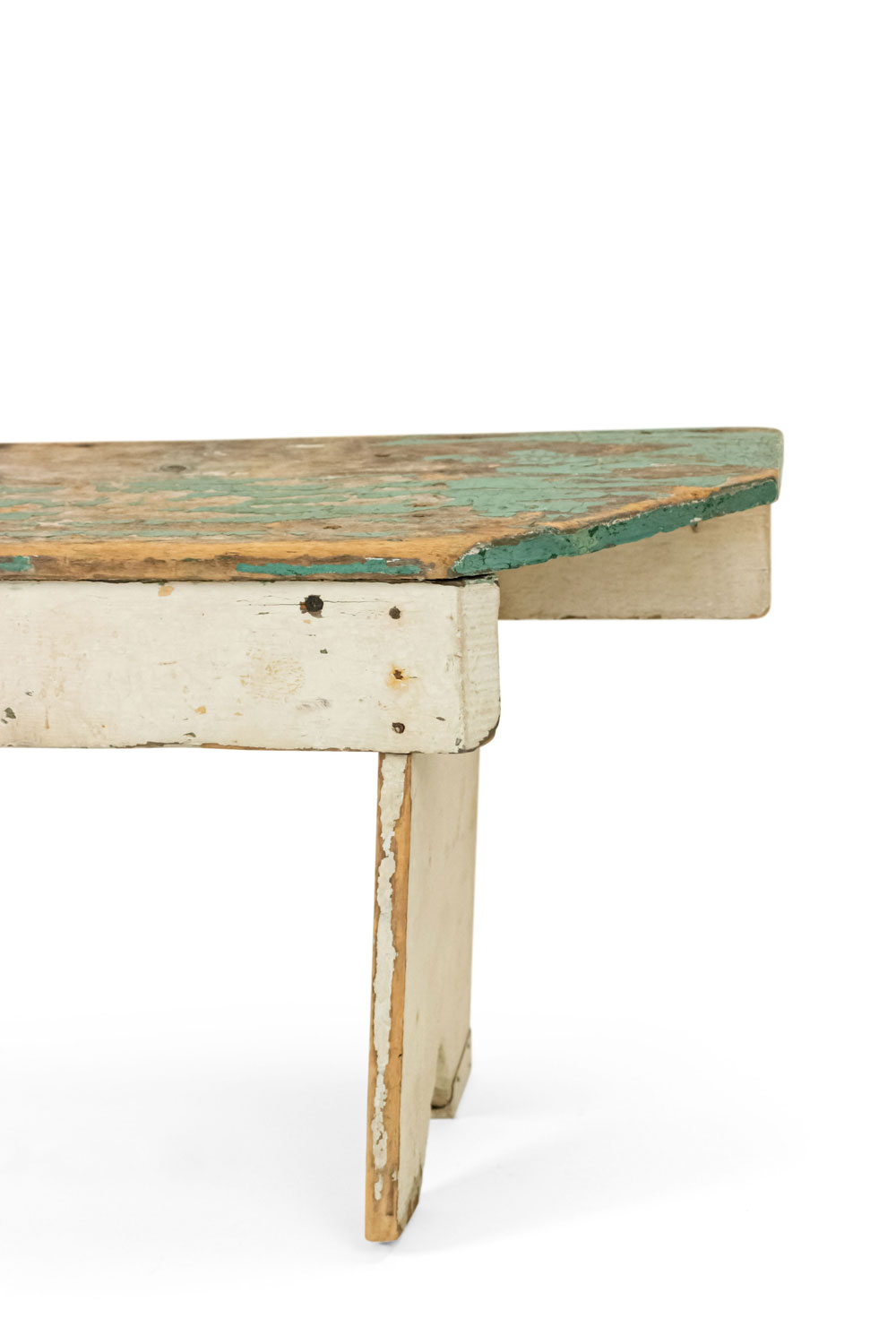 American Country weathered green rustic painted bench with cut corner seat and white painted pedestal sides