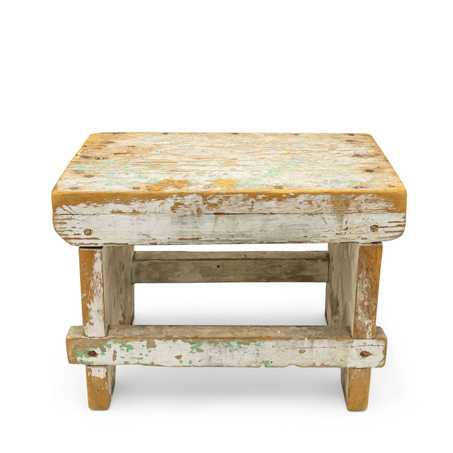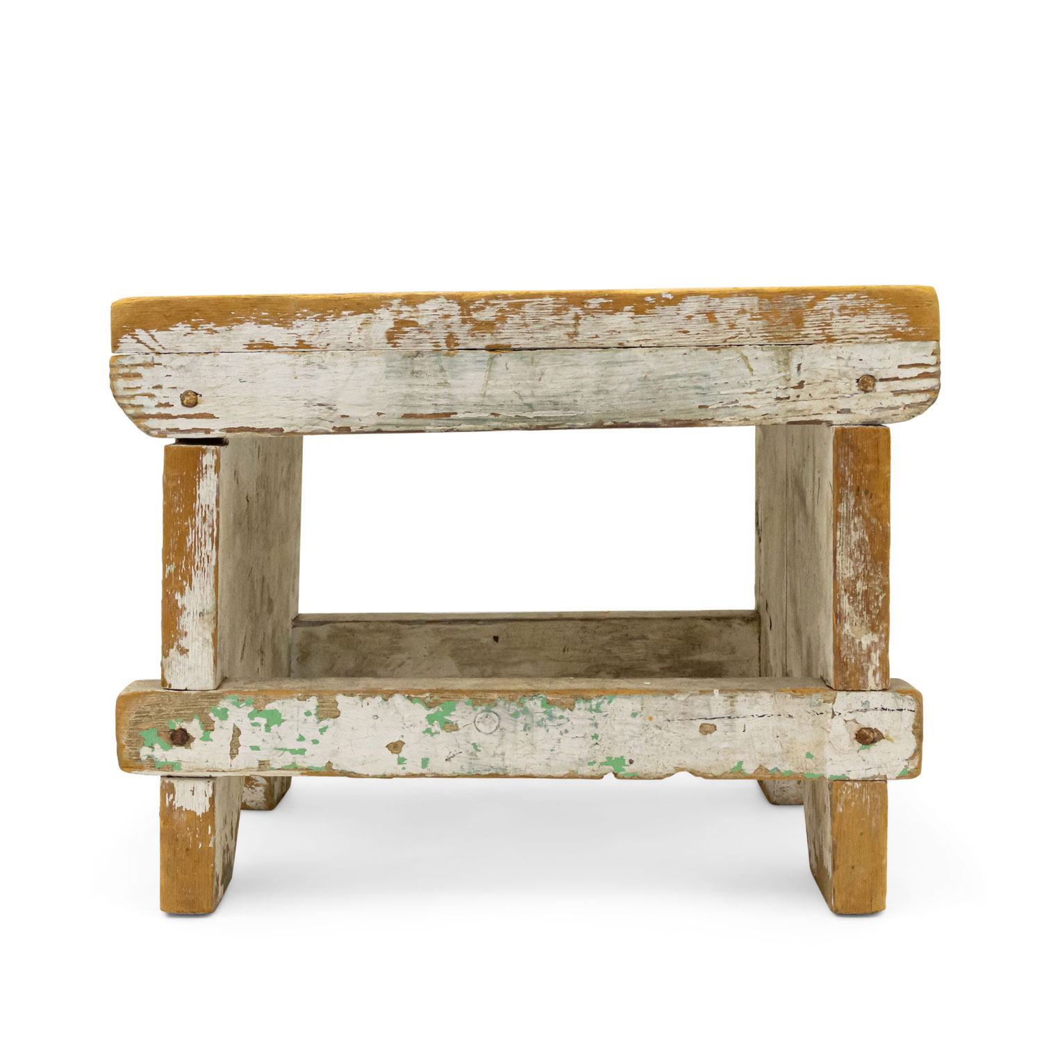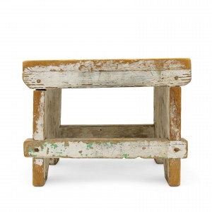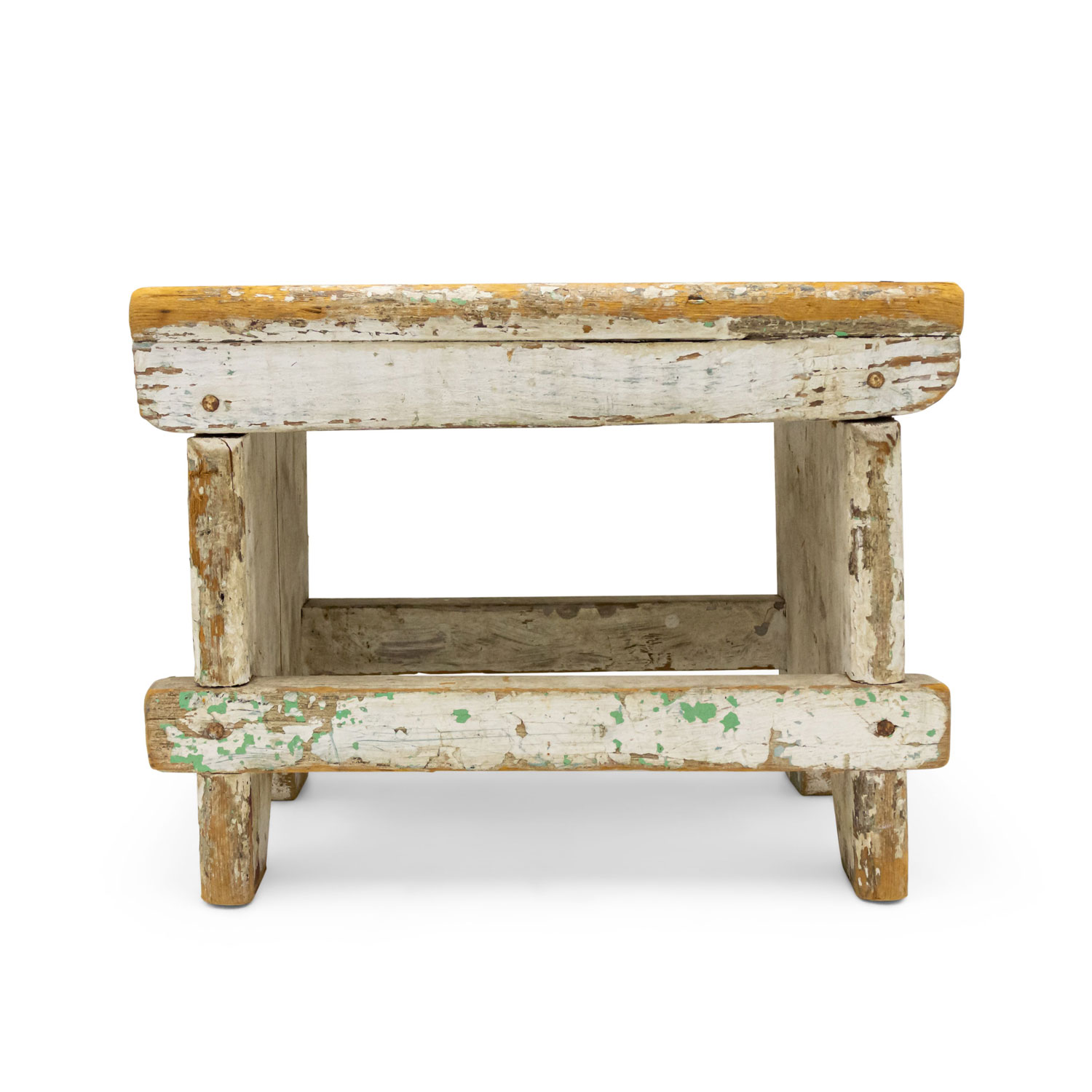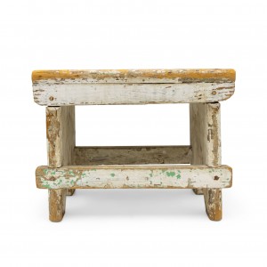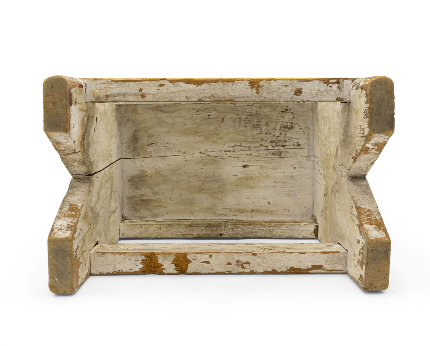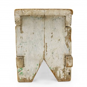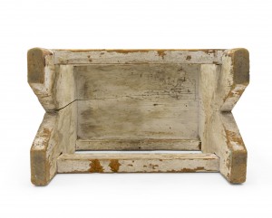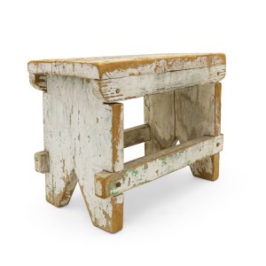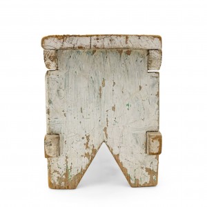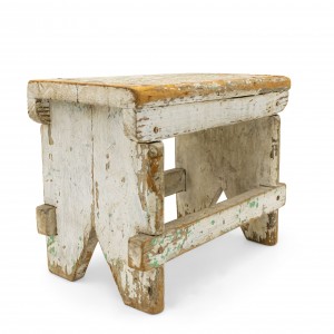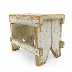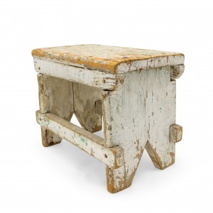 American Country Rustic style weathered white painted stool with a "V" panel side pedestals and a stretcher