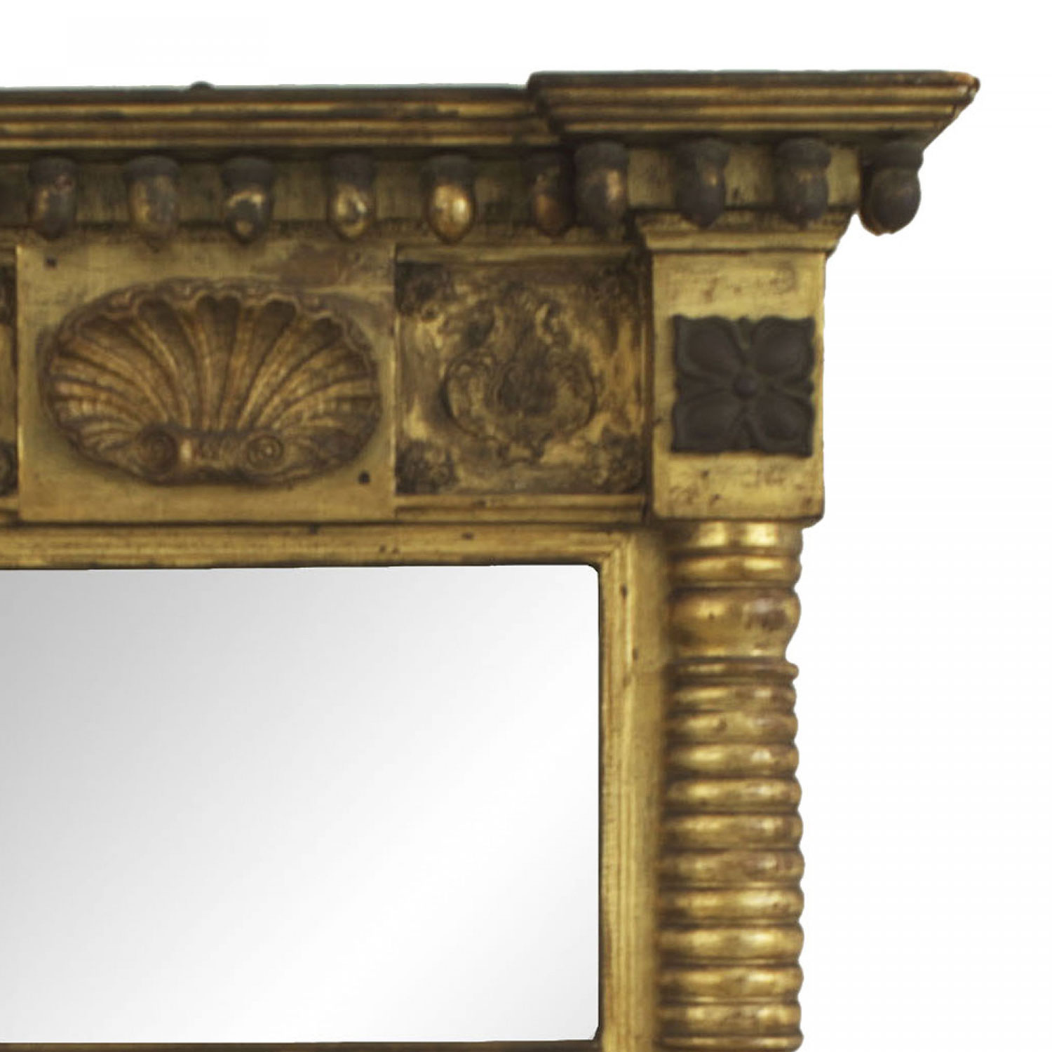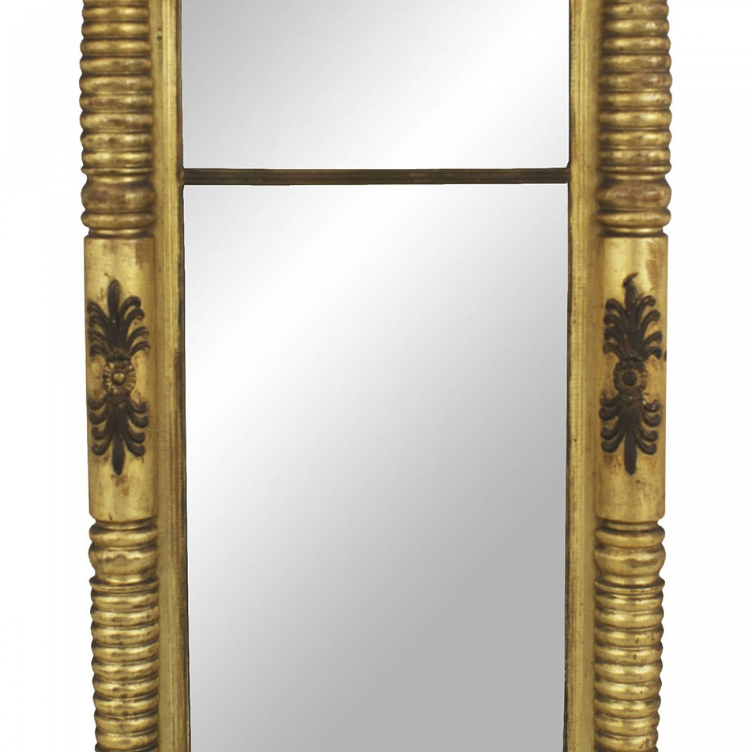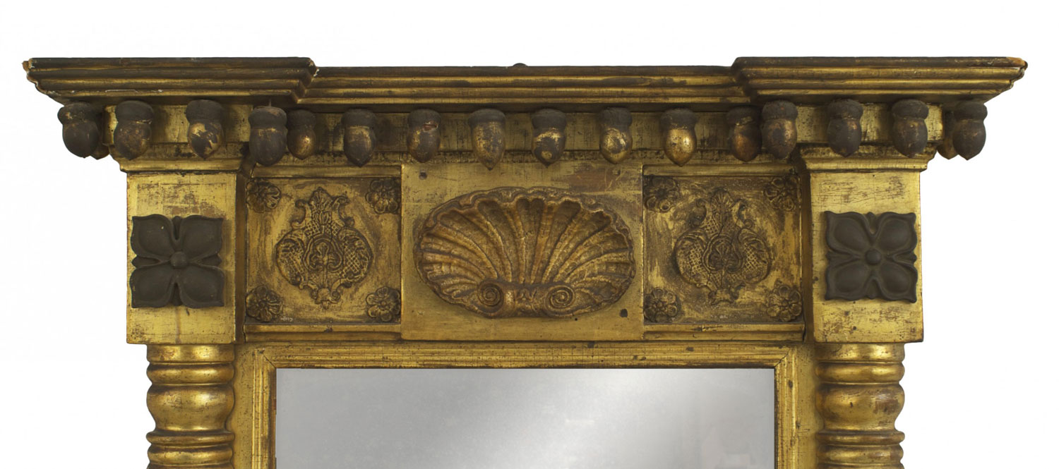 American Empire giltwood pier/ wall mirror with ebonized trim and an acorn decorated crest over a floral design flanked by turned spool design columns.