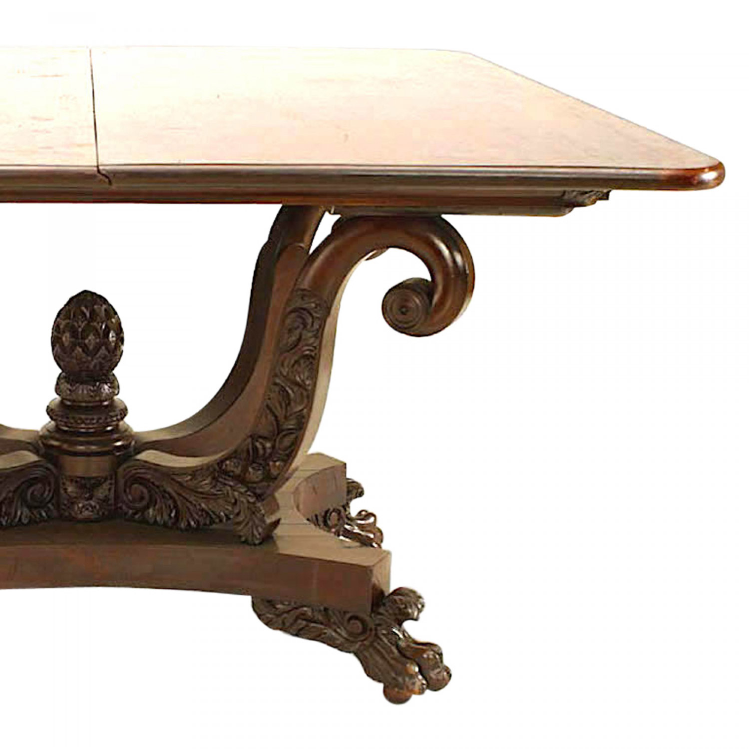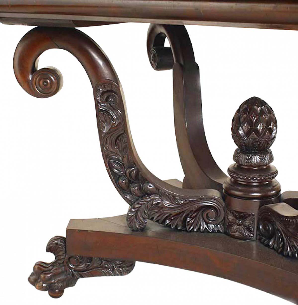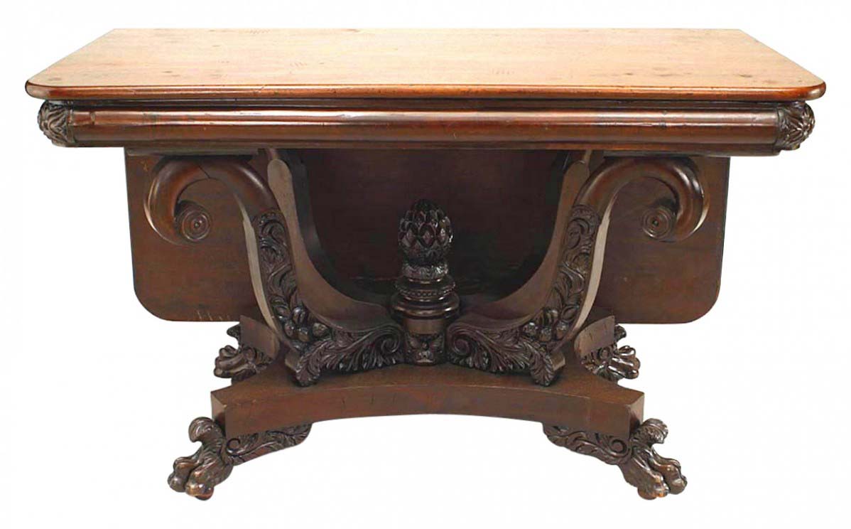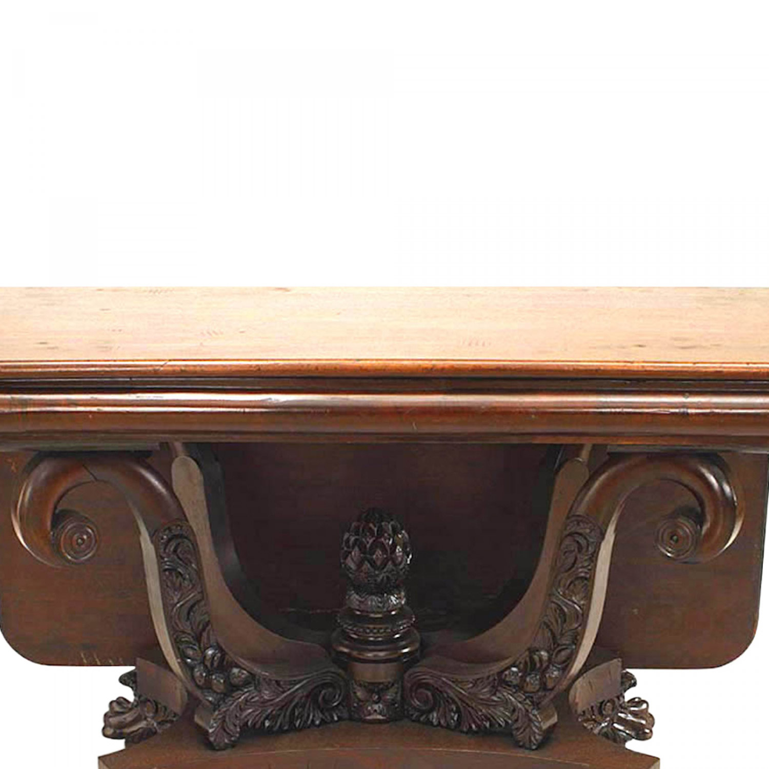 American Empire mahogany flip top console table with carved lyre form base with scroll design on carved paw feet