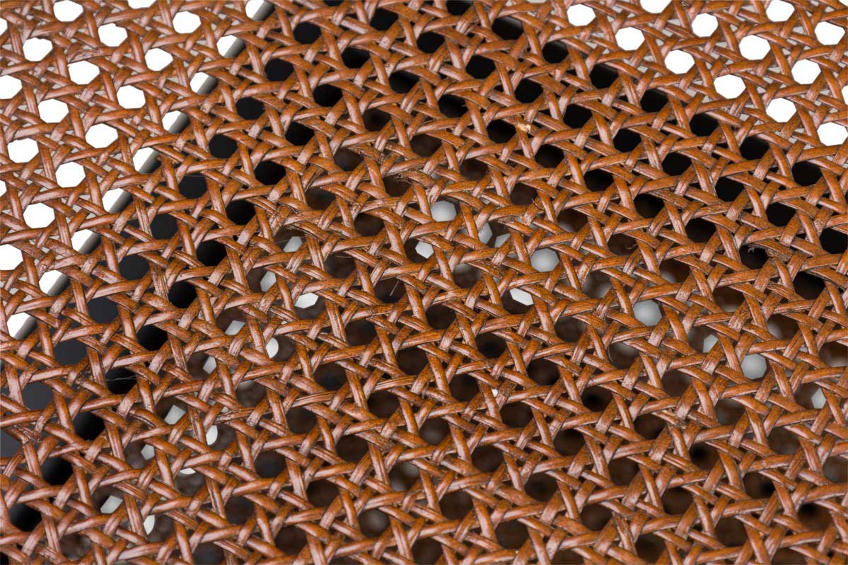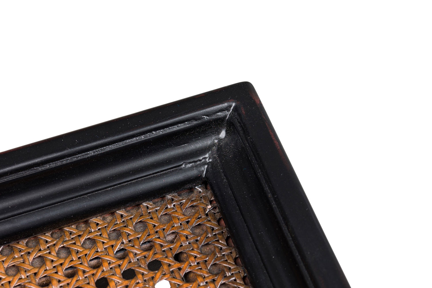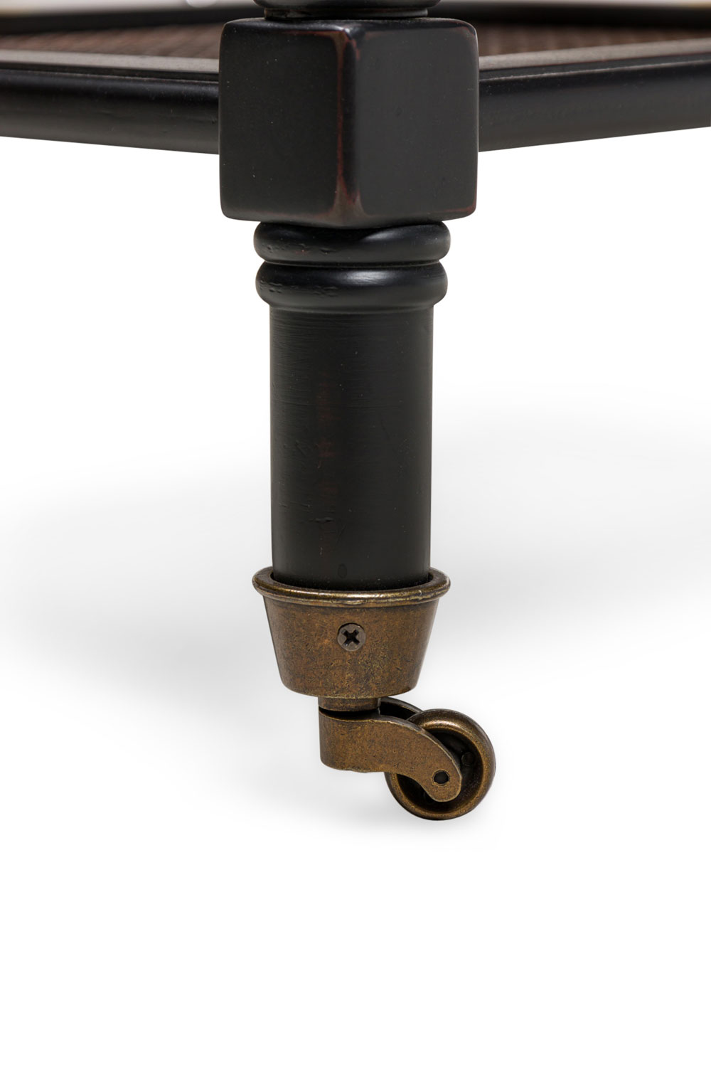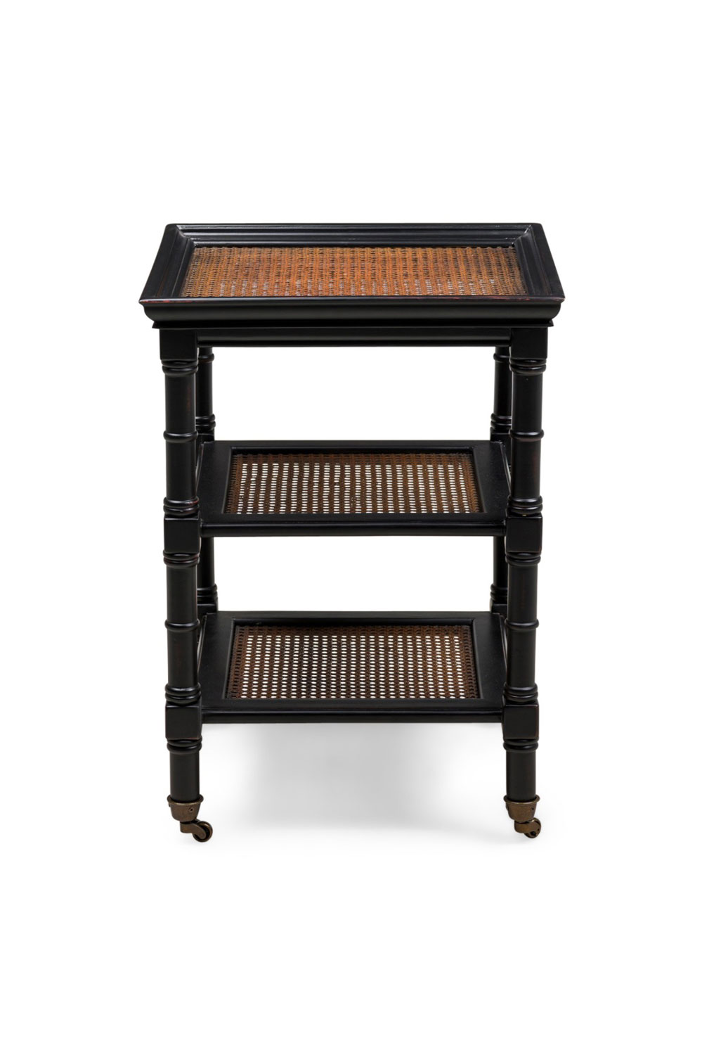Mid-Century style ebonized square 3-tier rolling table with caned shelves supported on turned leg posts atop brass casters