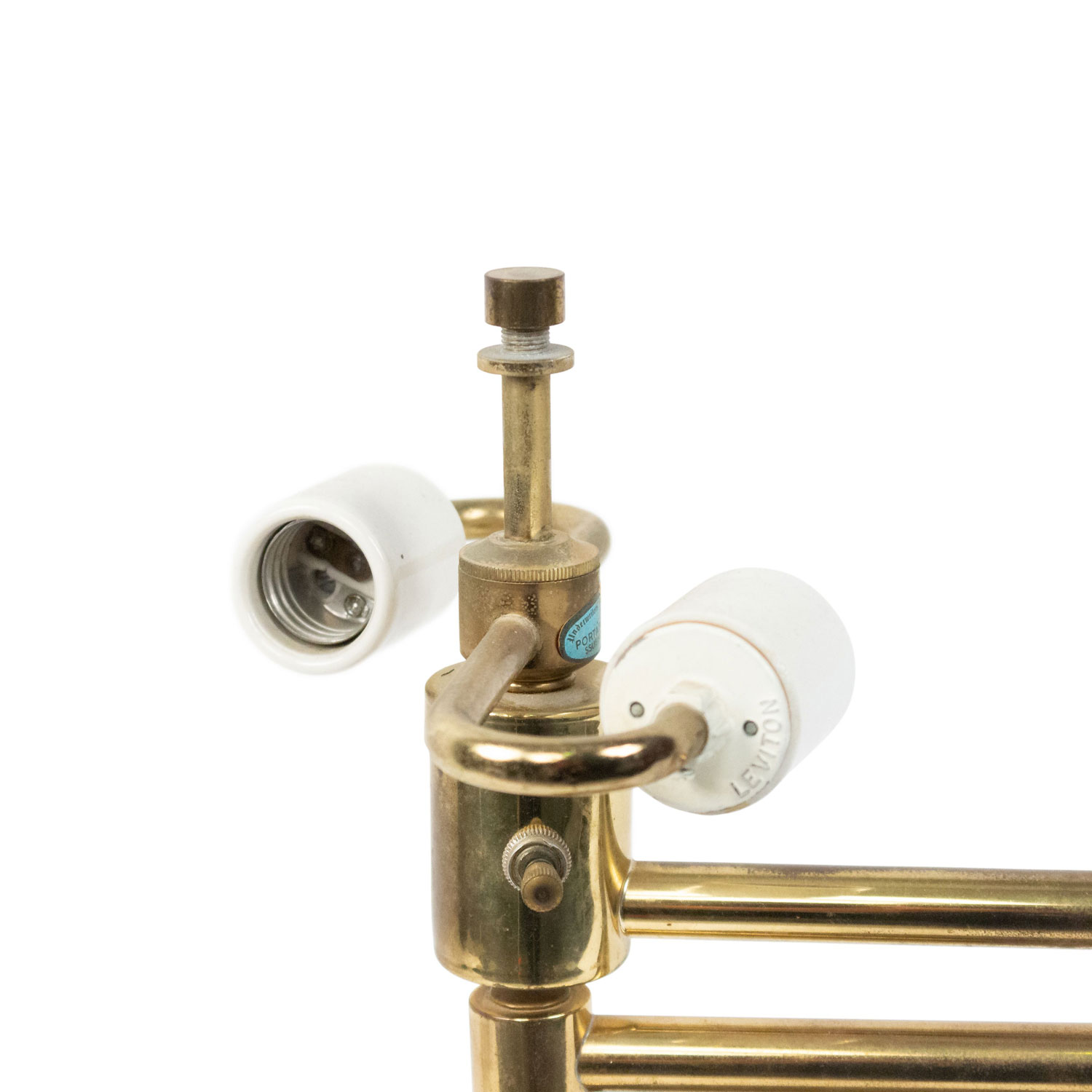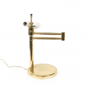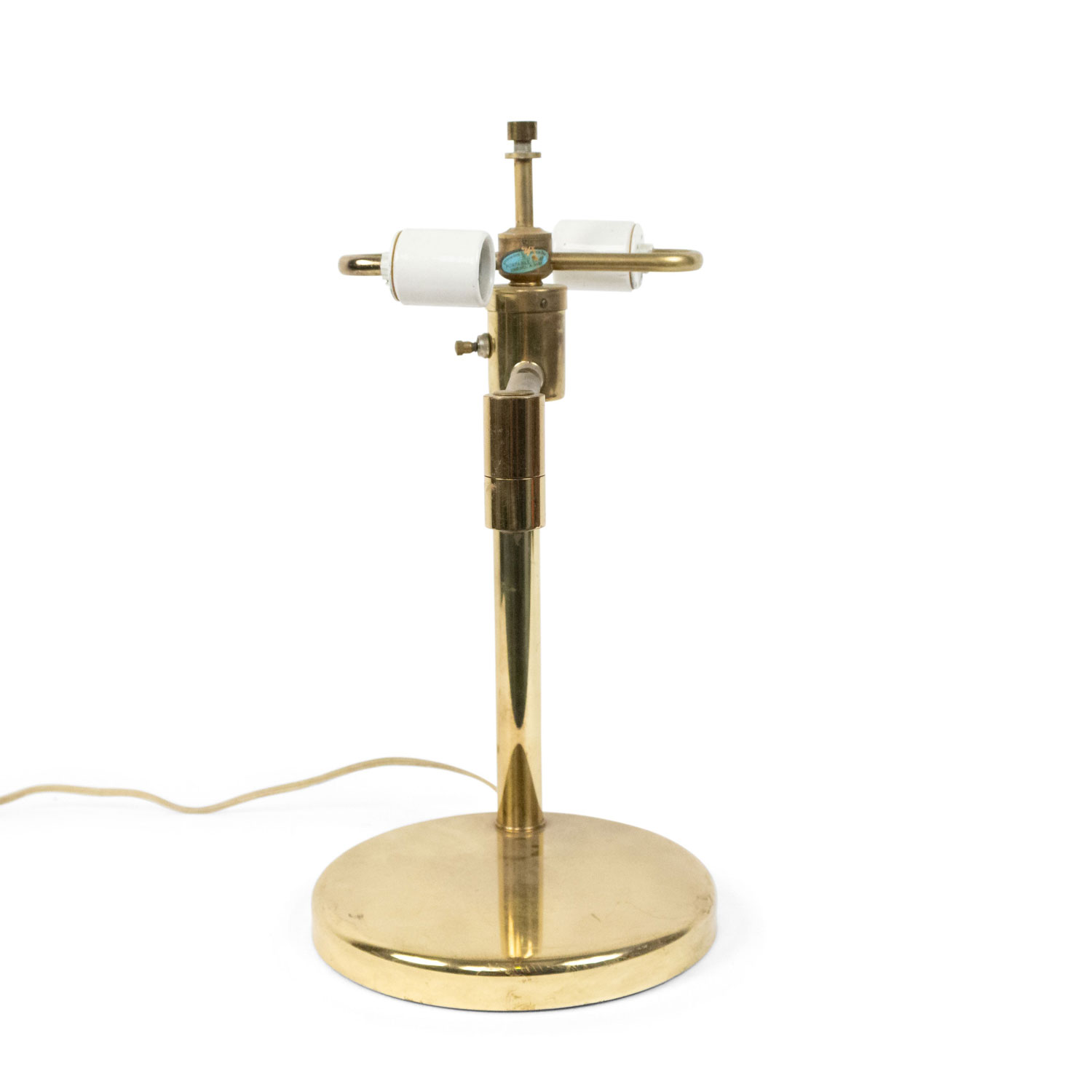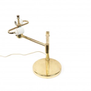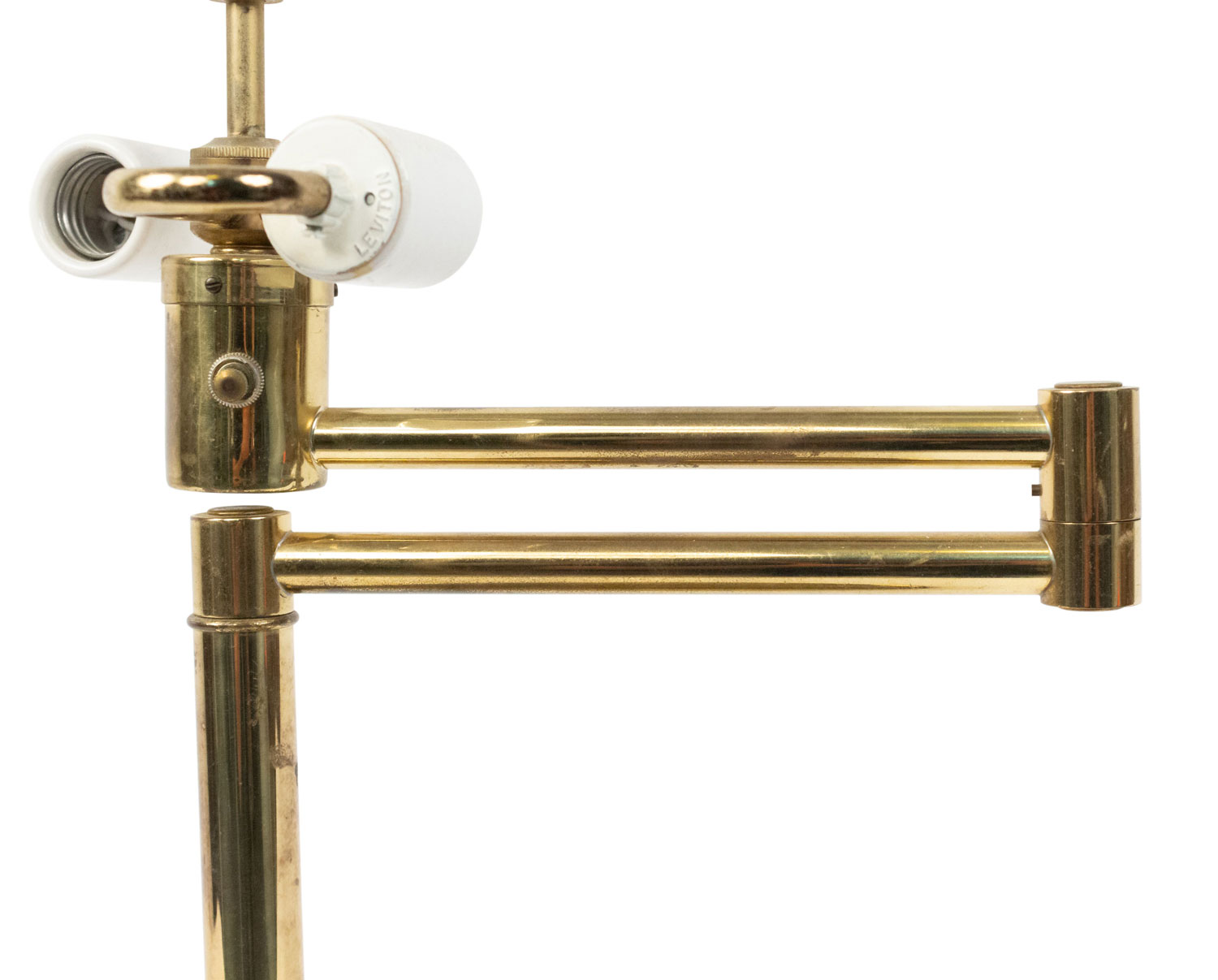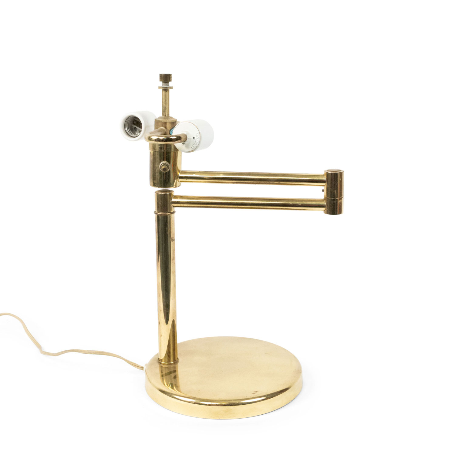 American Mid-Century brass swivel arm desk lamp with a round base.