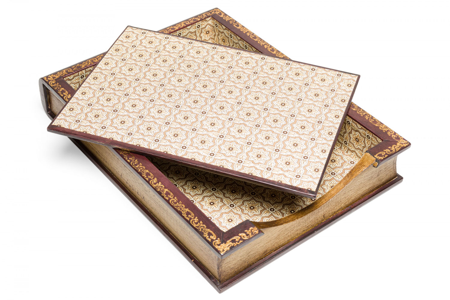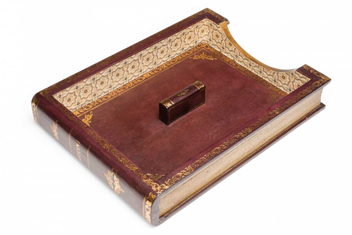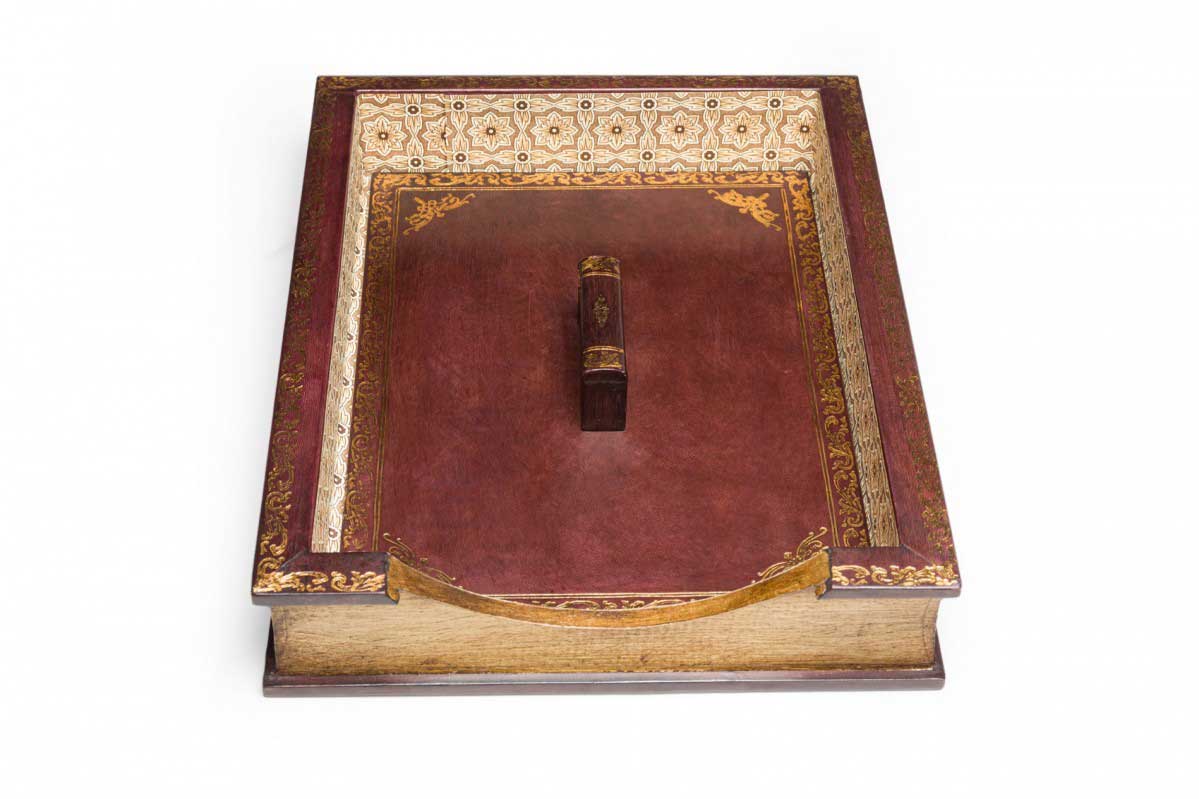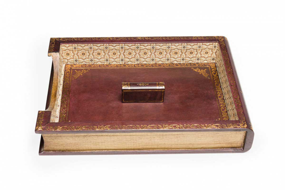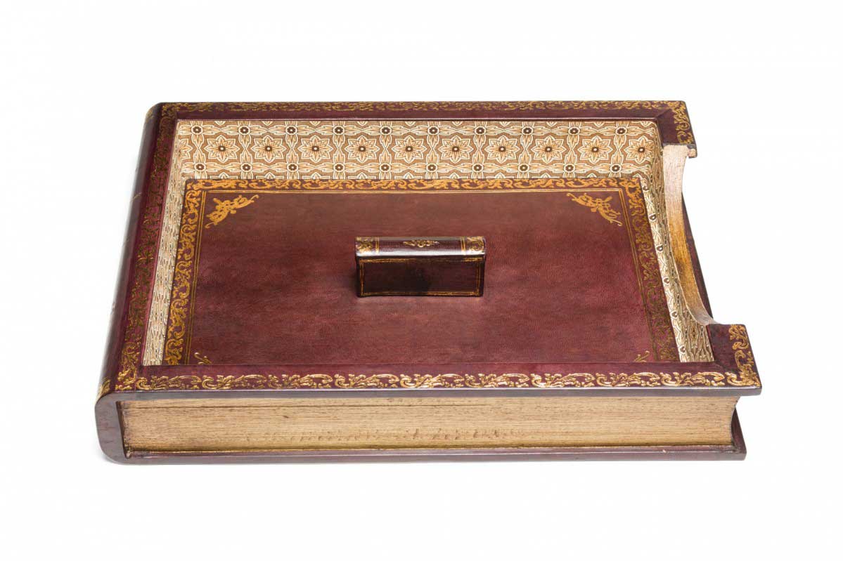 American Mid-Century florentine-style gold embossed burgundy leather desktop paper case with an exterior made to look like an antique book with a beige patterned interior and matching lid (Part of set: 062969)