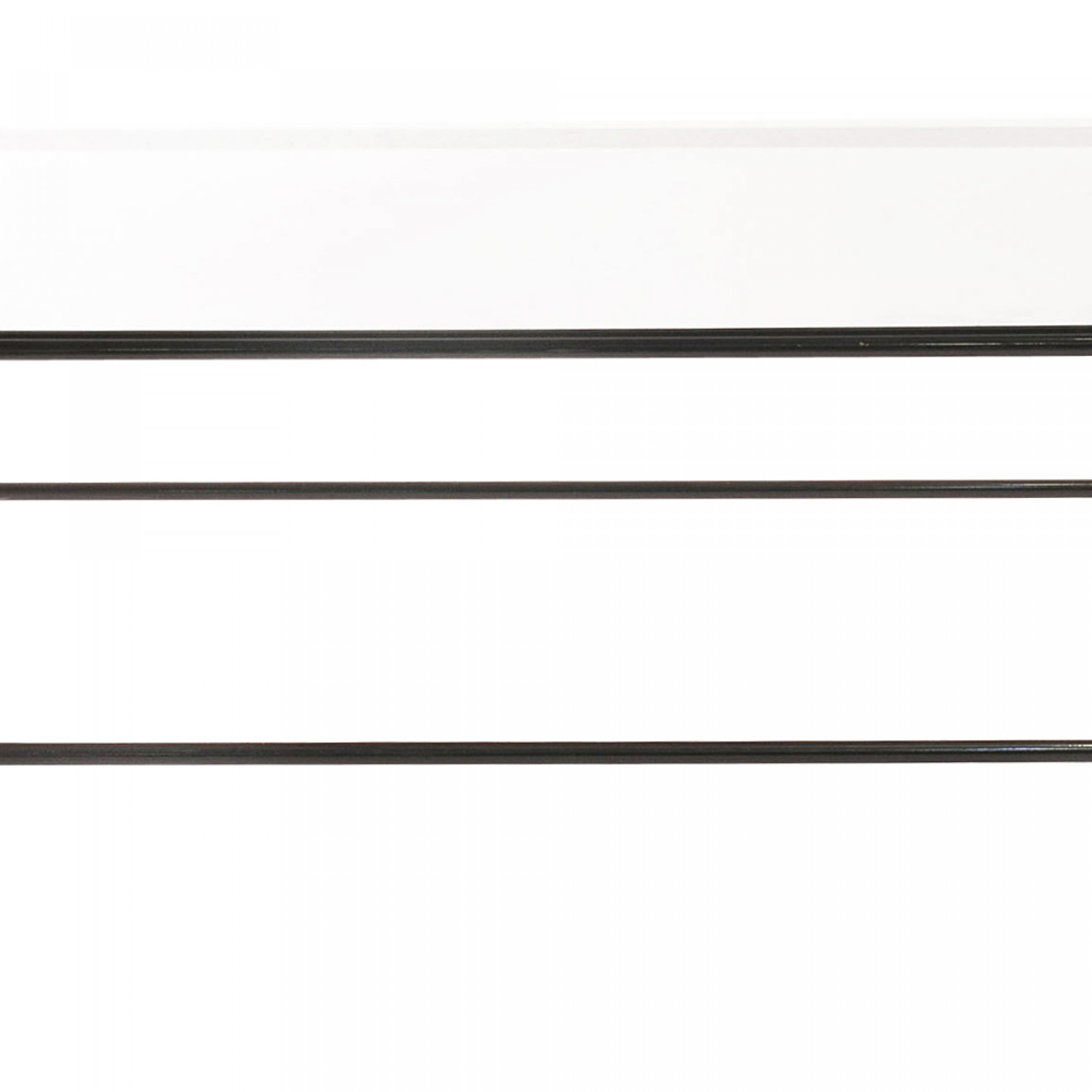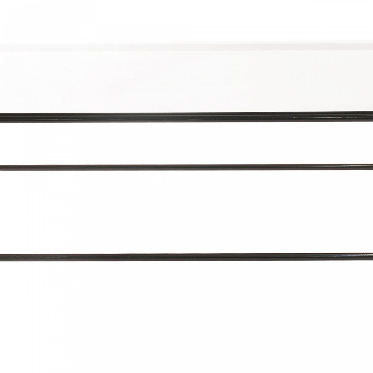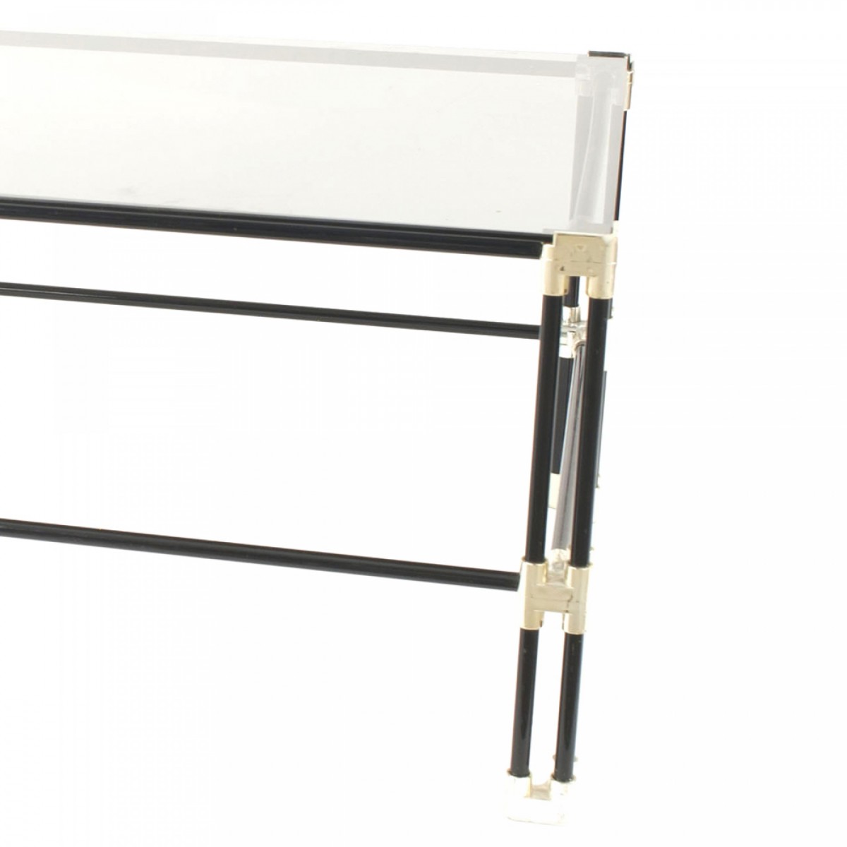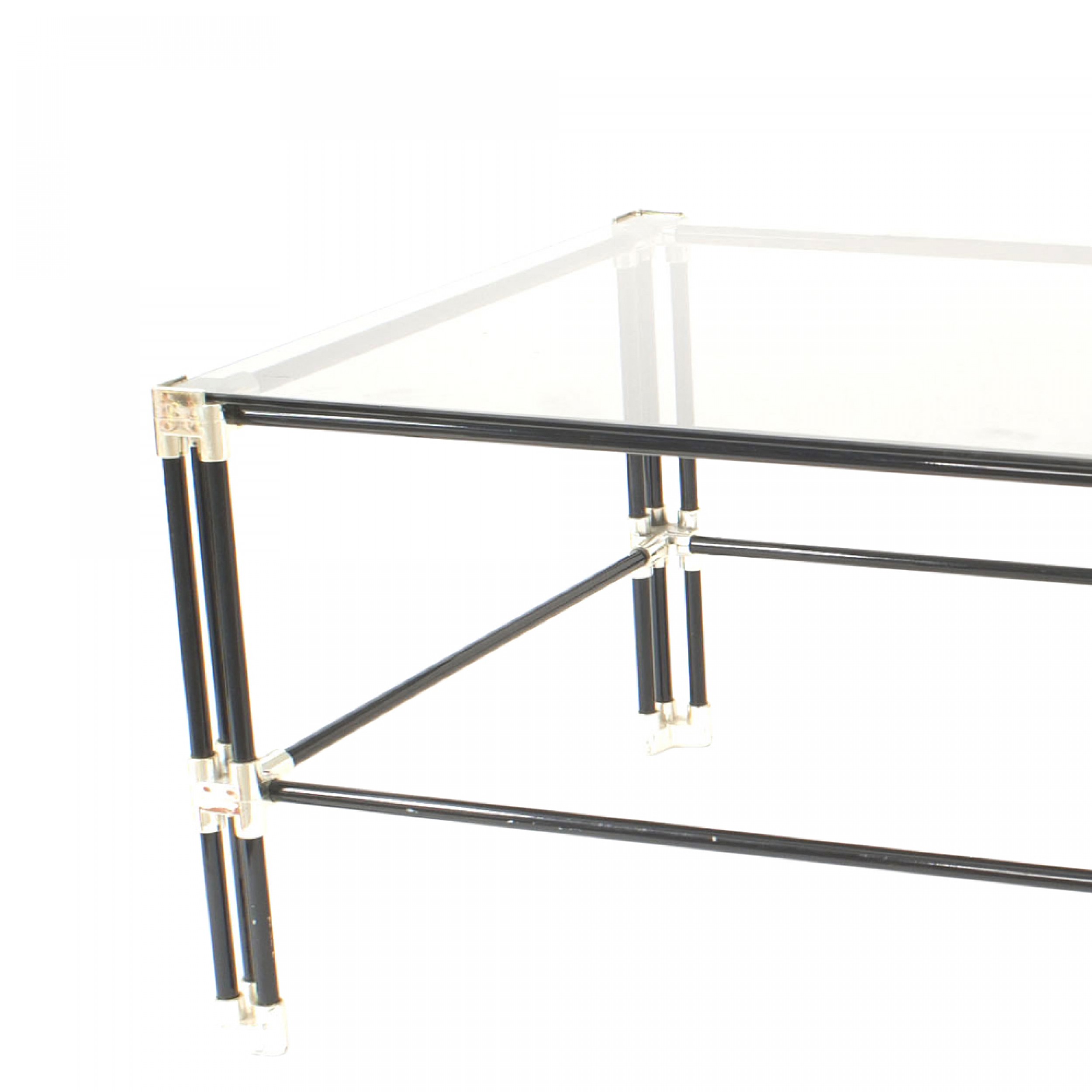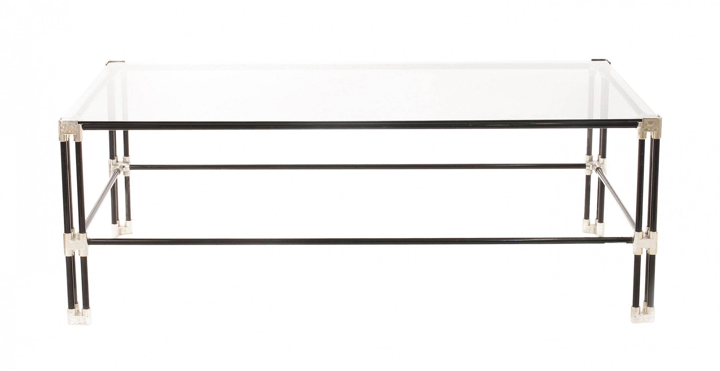 American Mid-Century (1960s) ebonzied metal and chrome trim rectangular coffee table with cluster legs connected with a stretcher and a smoky inset glass top.