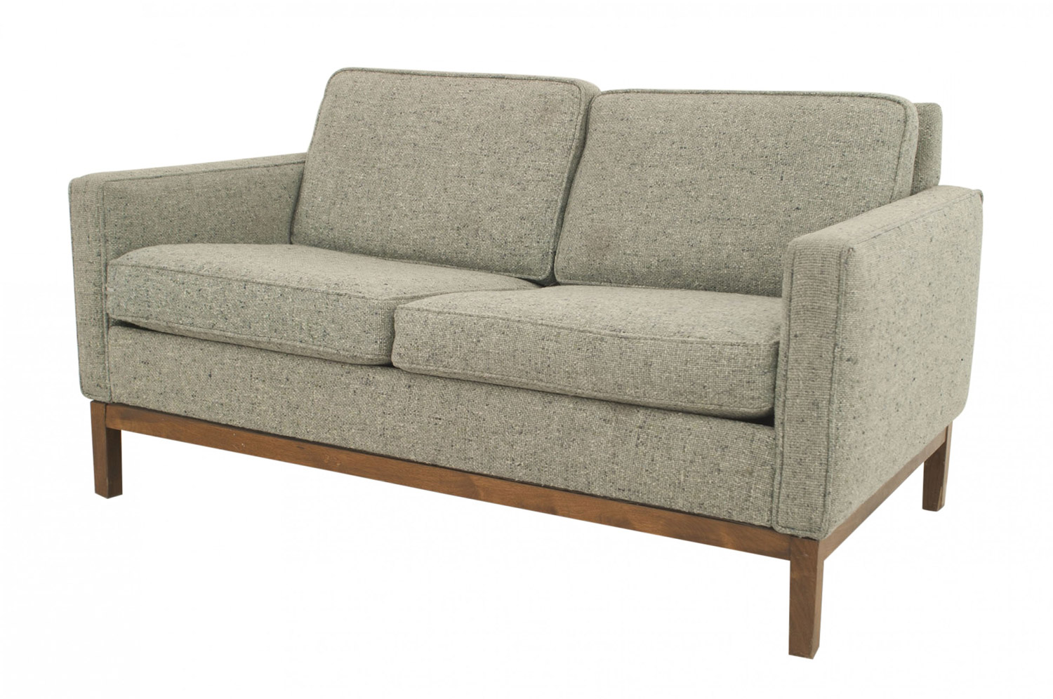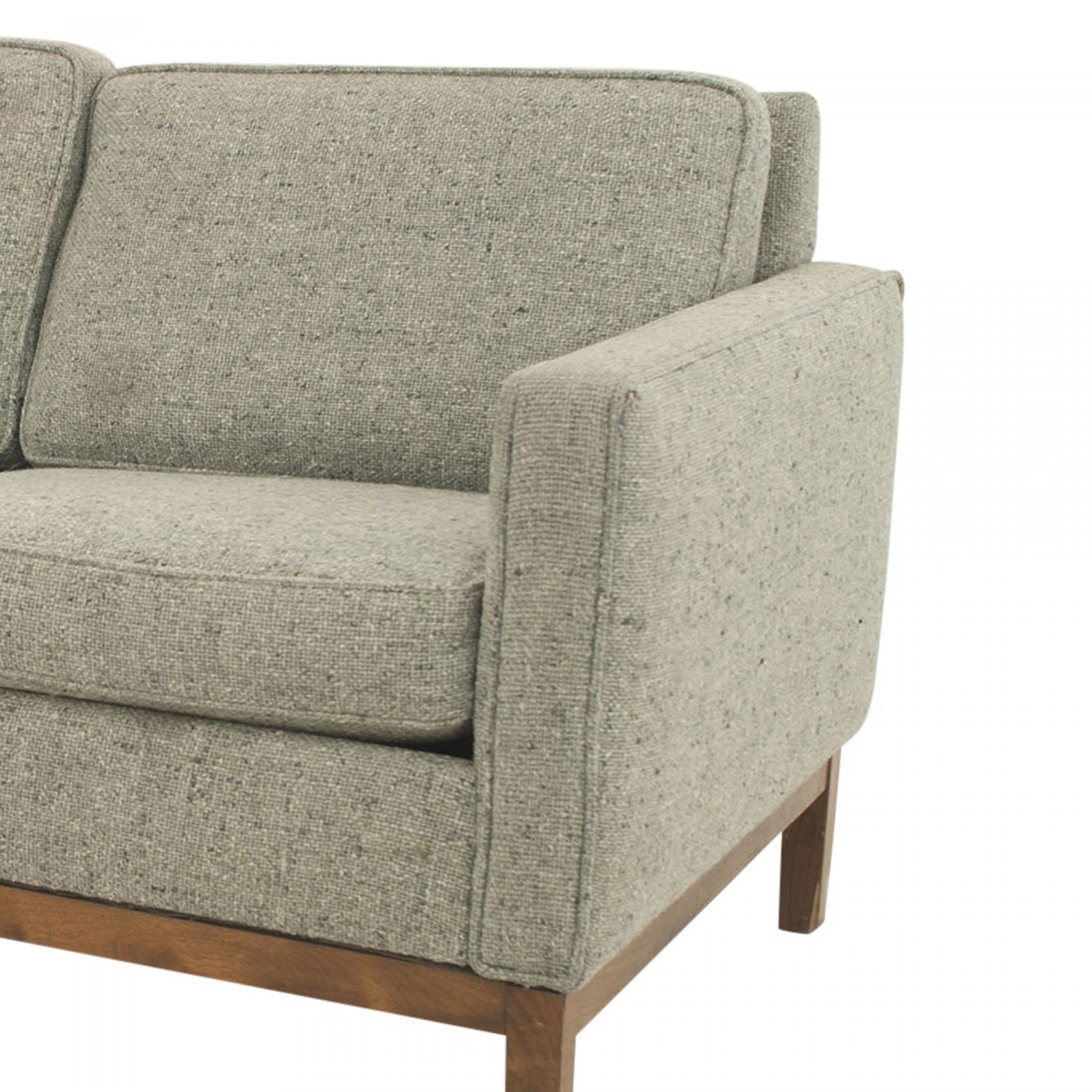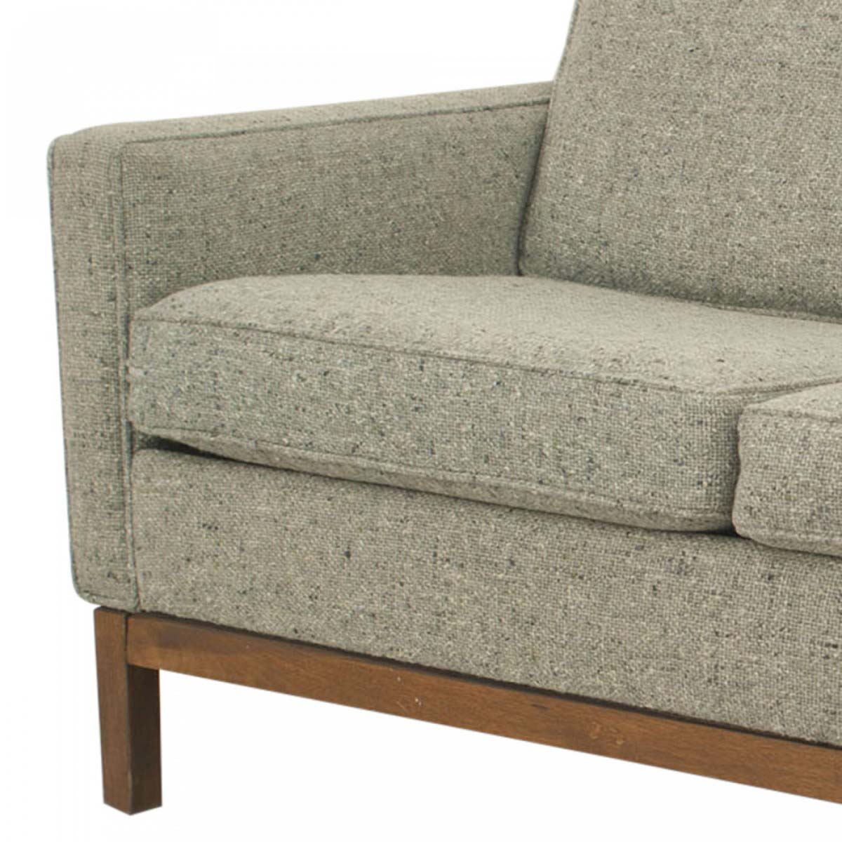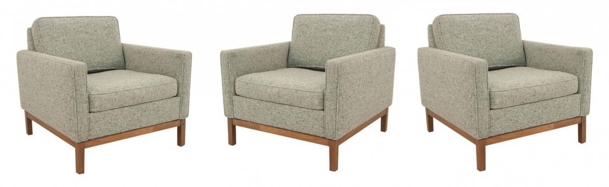 4 piece American Mid-Century gray wood upholstered set of 3 arm chairs & loveseat resting on teak legs & base with seat & back cushions (att: FLORENCE KNOLL)(Available individually: loveseat: MP0065A, 3 armchairs: MP0065B)