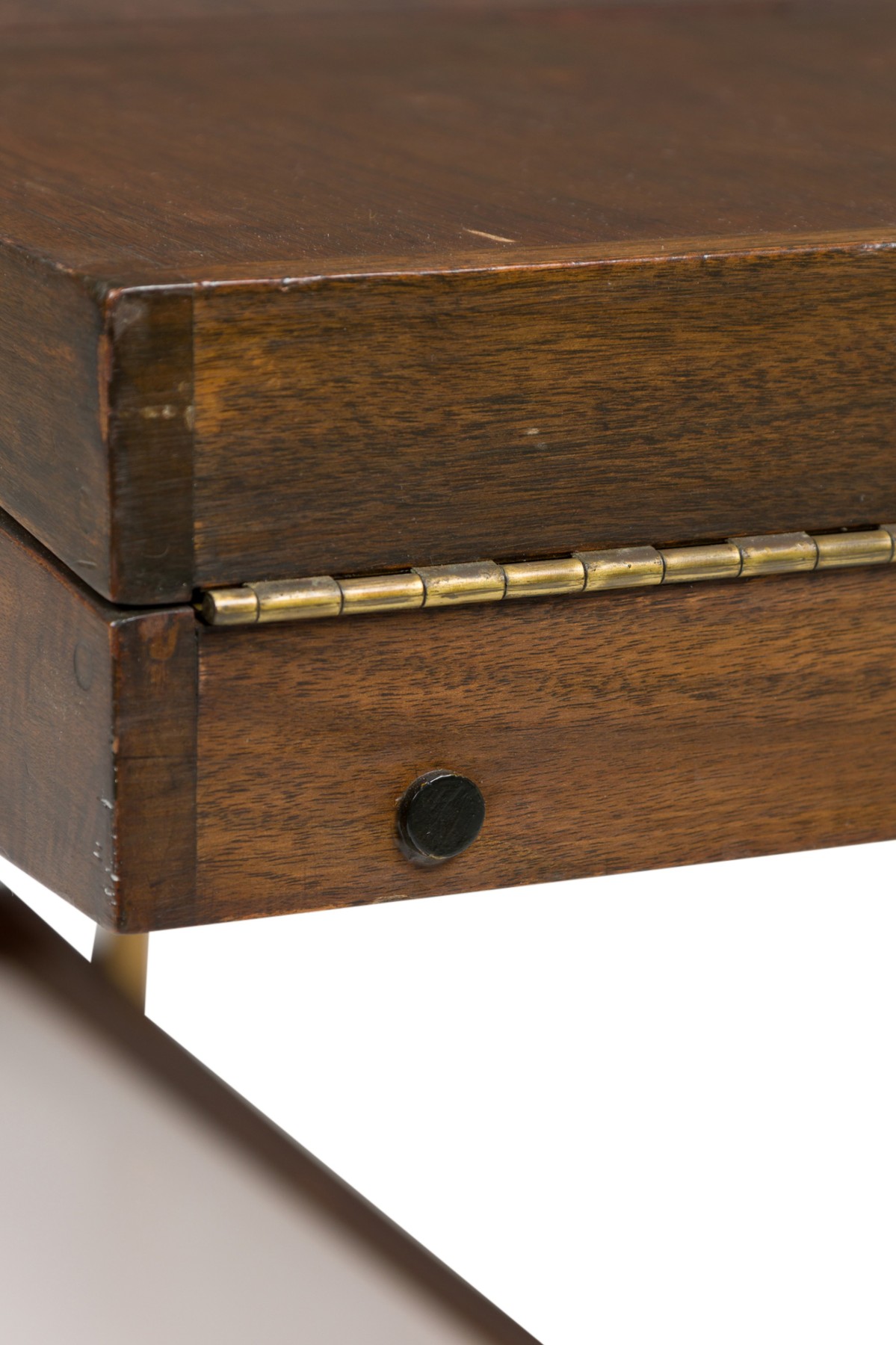 American Mid-Century wood bar cart featuring a lower shelf and a top having a hinged fold out small draw and a pull out top shelf supported on 4 round brass leg