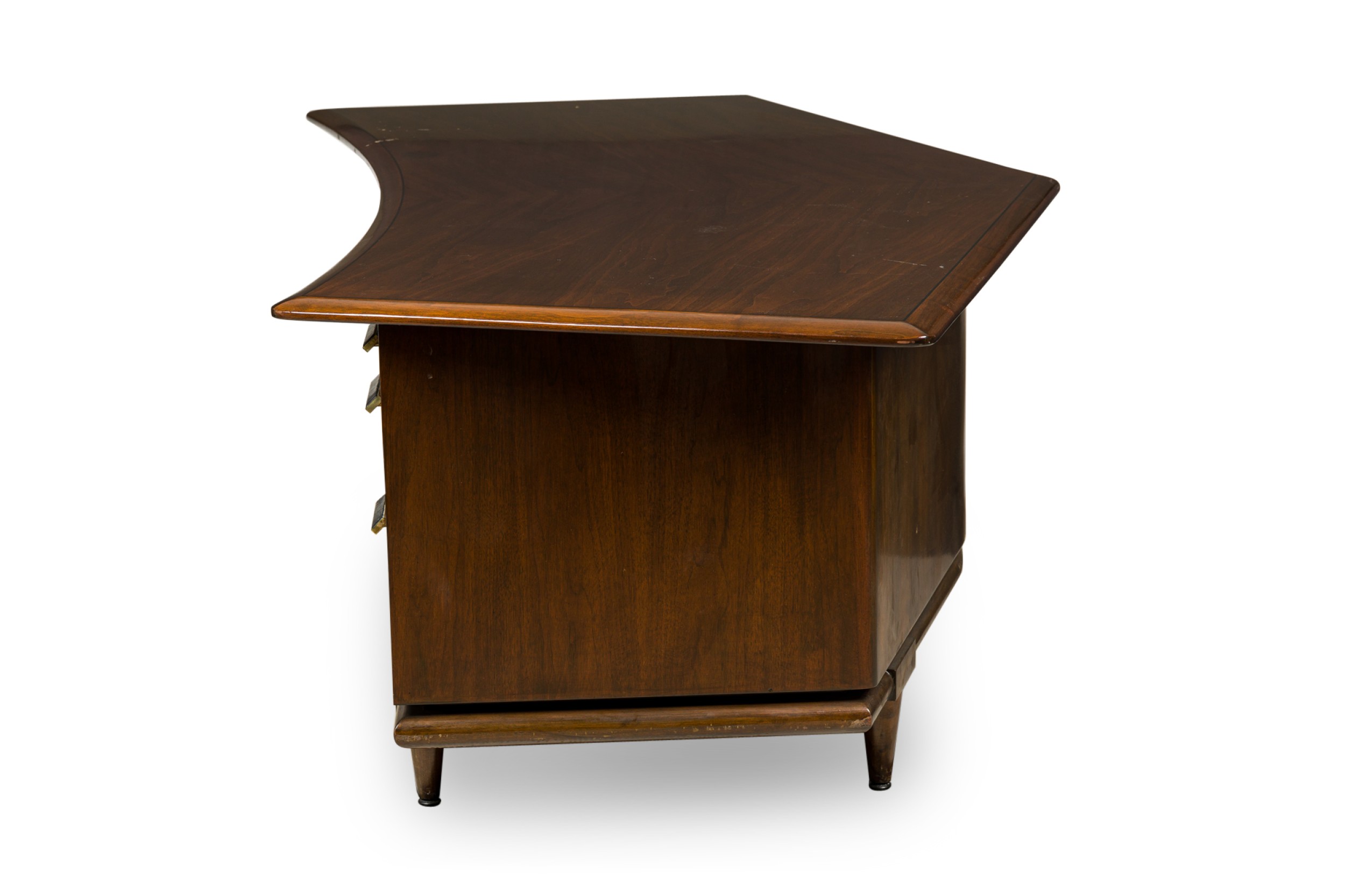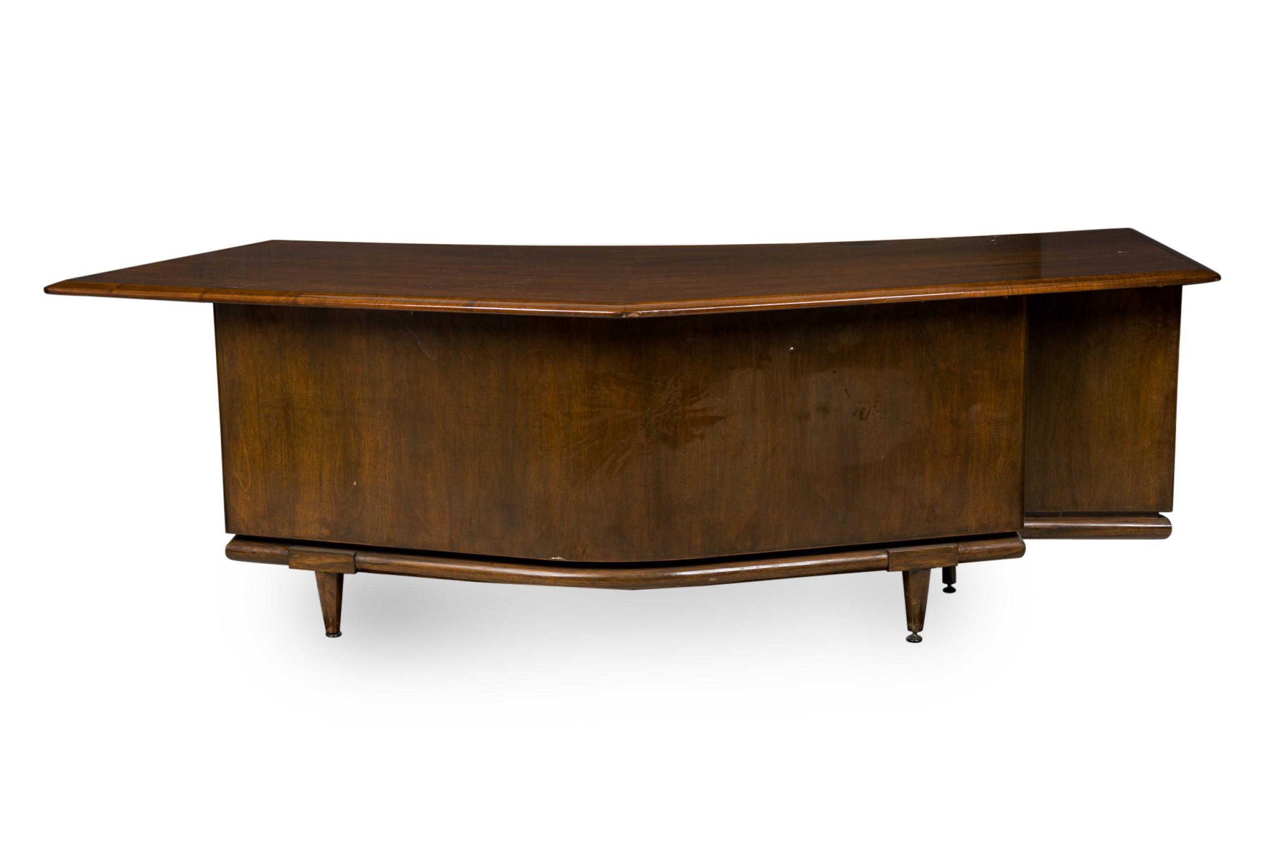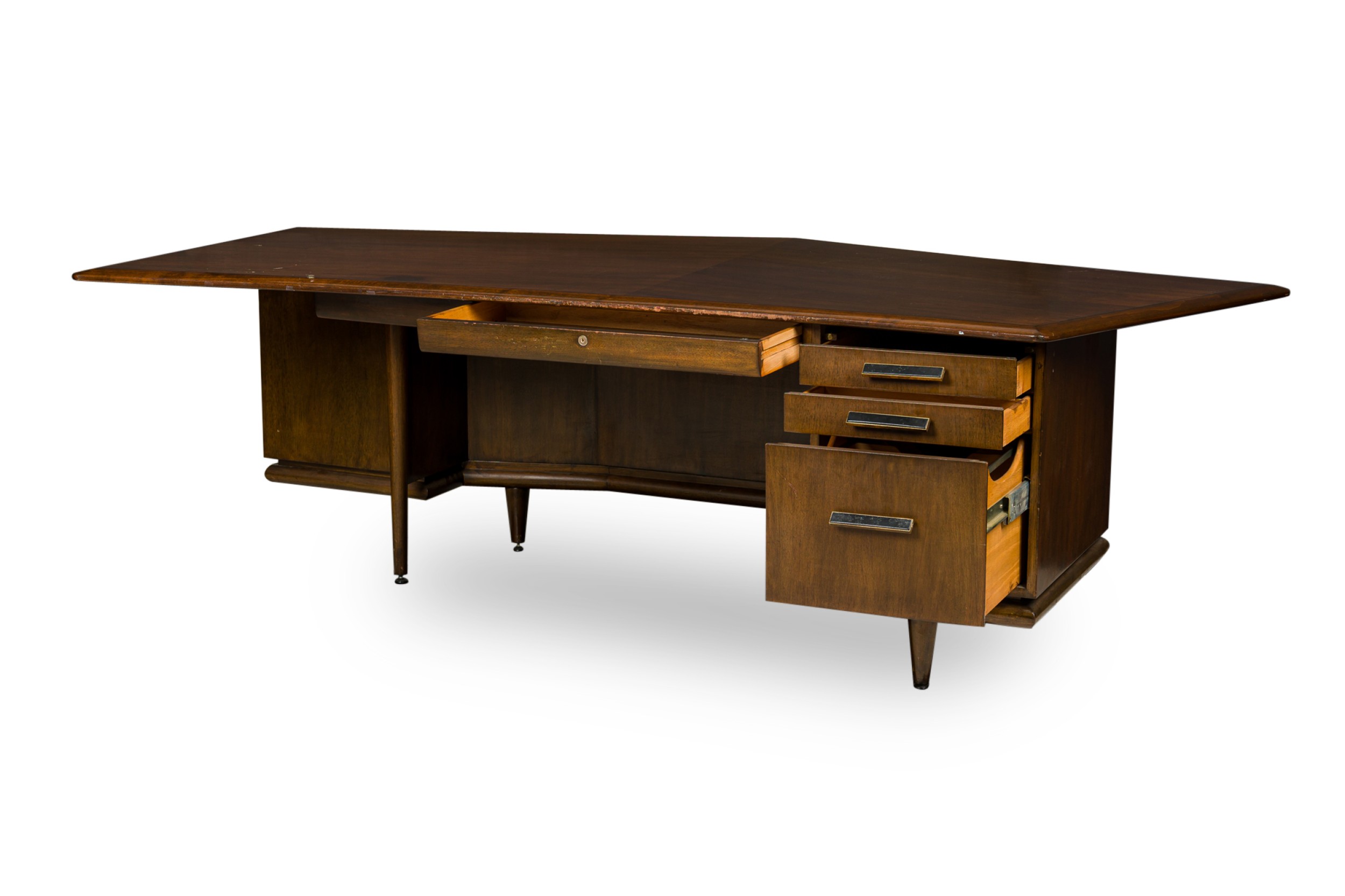 American Mid-Century walnut executive desk having an angular top with a center drawer and 3 stacked side drawers designed with a vanity front panel