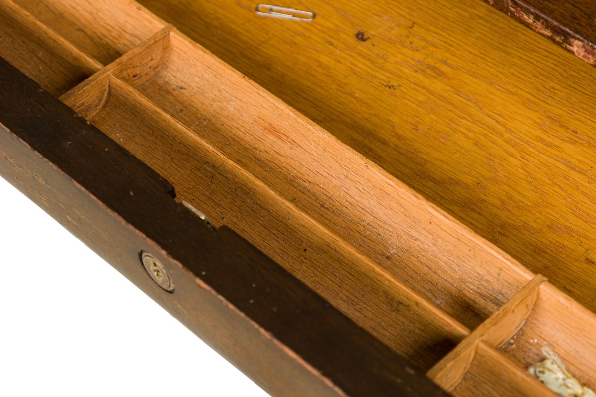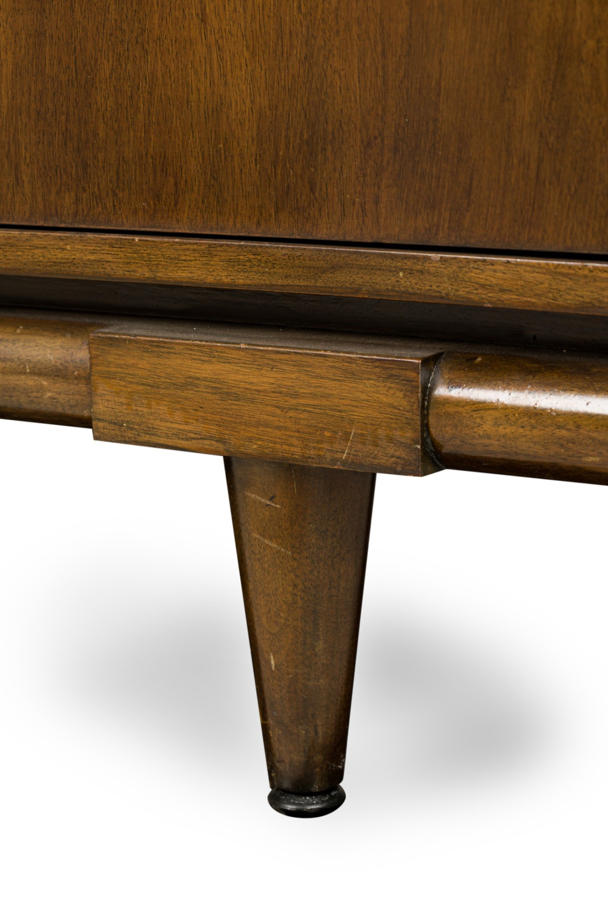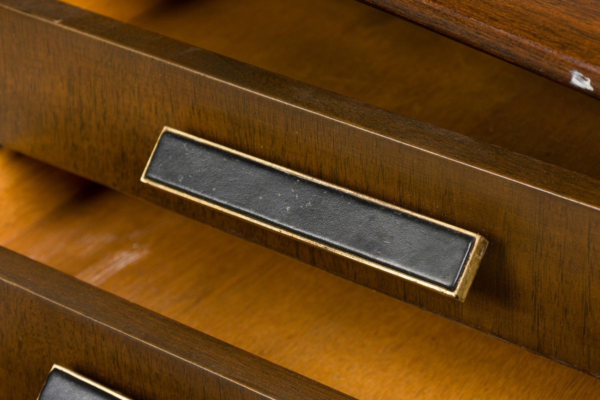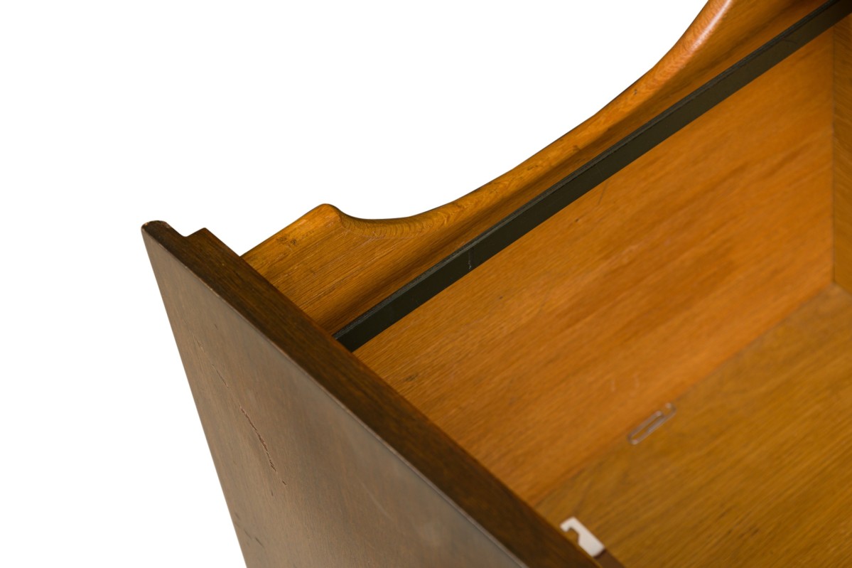 American Mid-Century walnut executive desk having an angular top with a center drawer and 3 stacked side drawers designed with a vanity front panel
