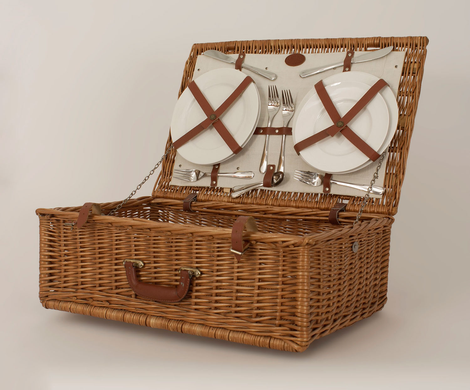 American Mid-Century natural wicker rectangular picnic basket with a brown leather handle and straps with a service setting interior