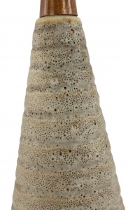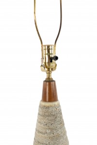American Mid-Century light grey stoneware textured table lamp with a tapered cone shape with a light wood top and round base.