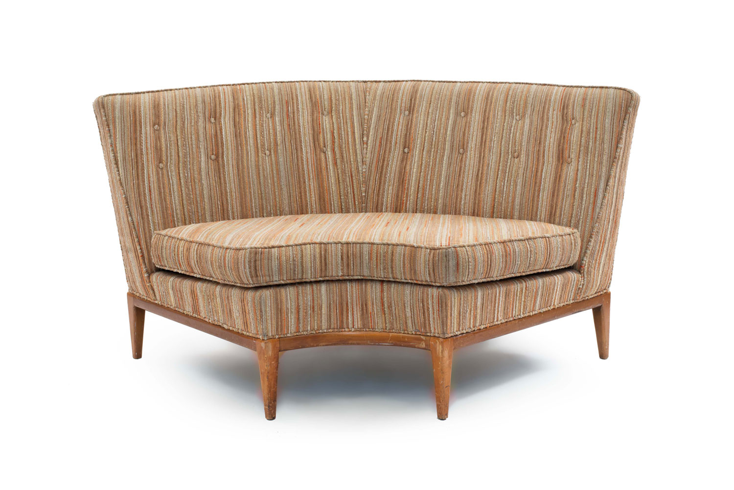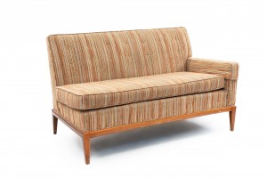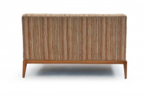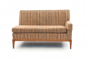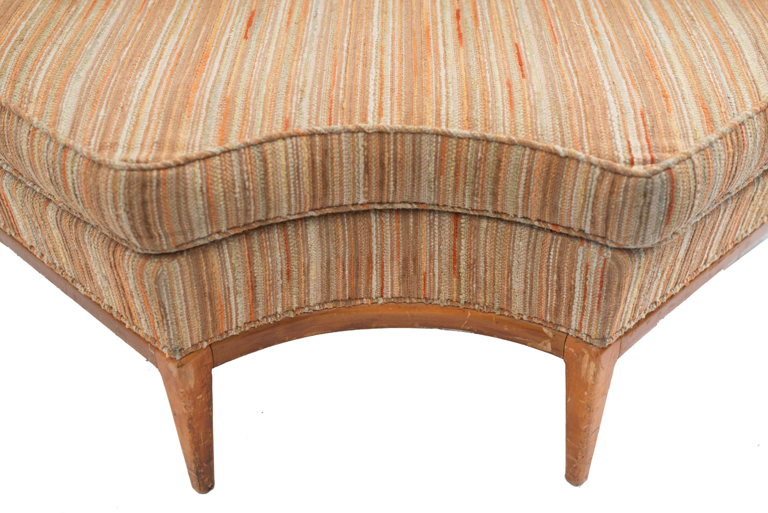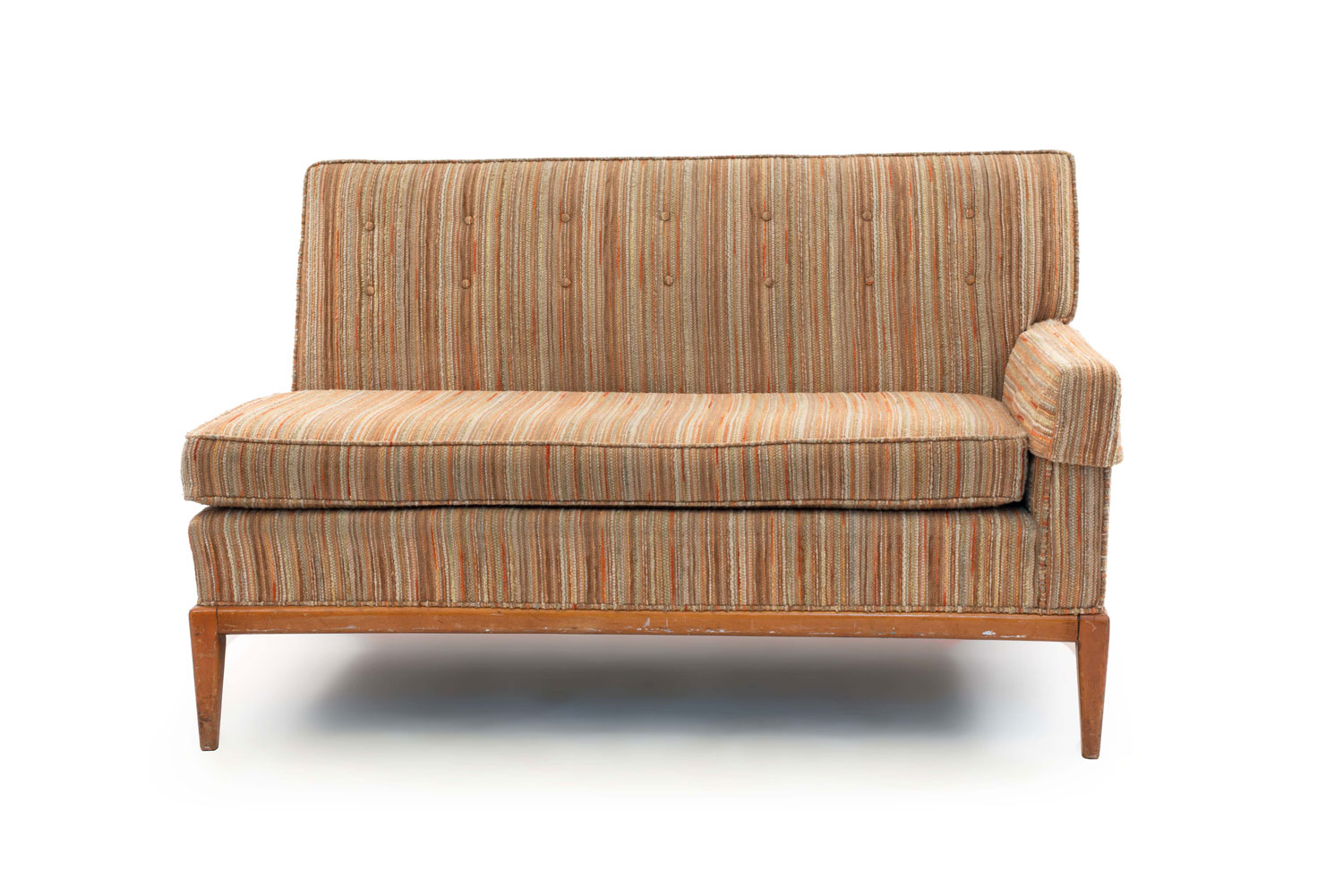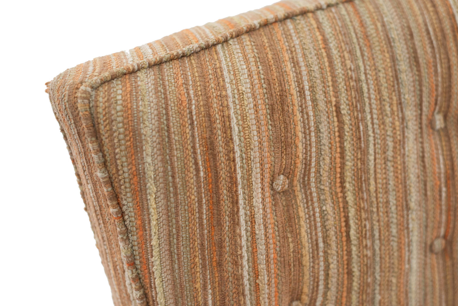 American Mid-Century 4 piece living room sectional upholstered in beige/orange stripe fabric with a button tufted back on a wood base (available individually: corner-63"x33"-MP0259B, side-25"x32"-MP0259C, 2 loveseats-MP0259A, )
