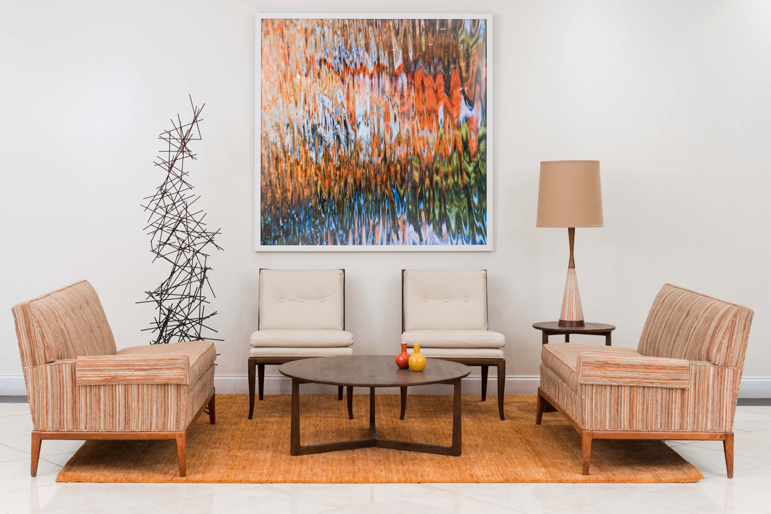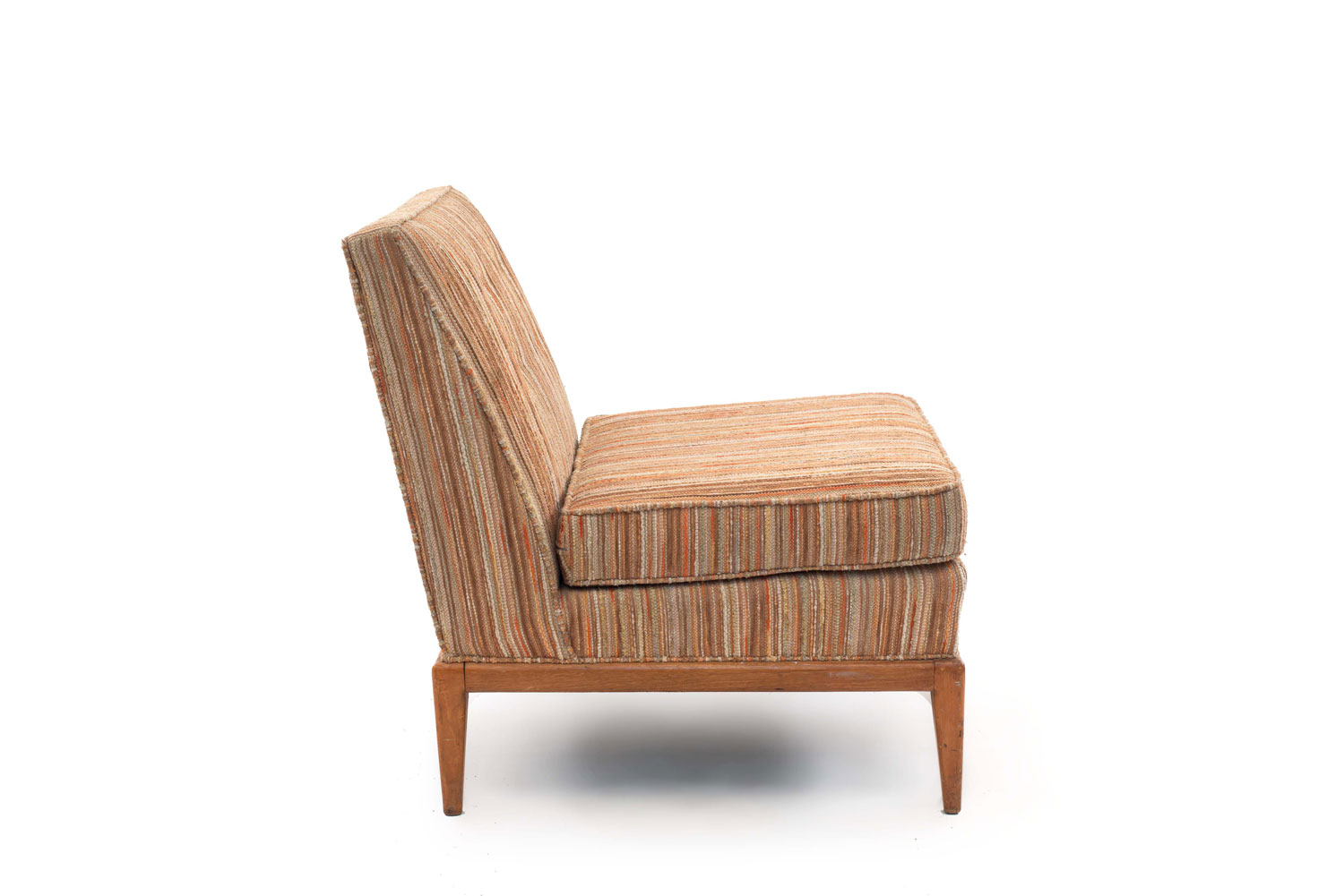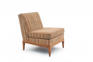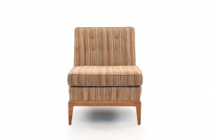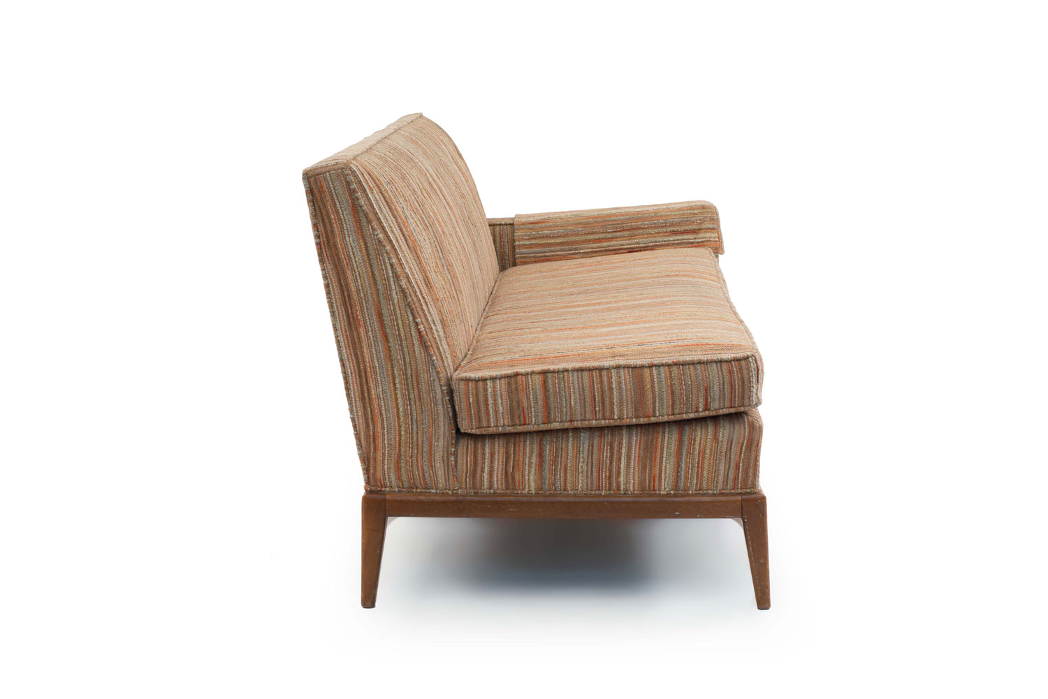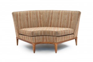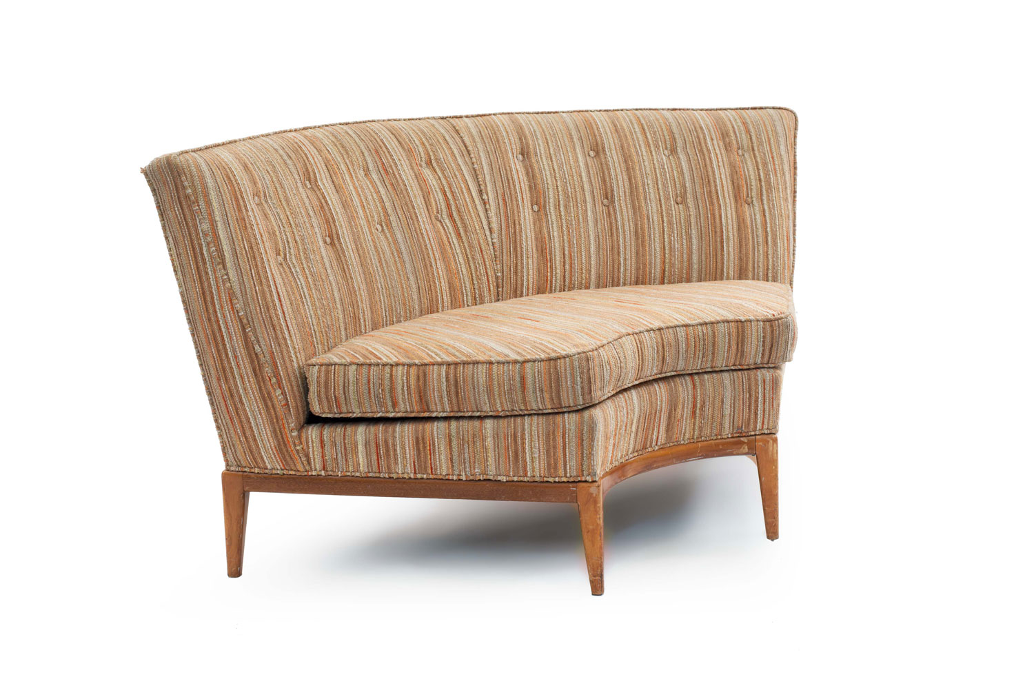 American Mid-Century 4 piece living room sectional upholstered in beige/orange stripe fabric with a button tufted back on a wood base (available individually: corner-63"x33"-MP0259B, side-25"x32"-MP0259C, 2 loveseats-MP0259A, )