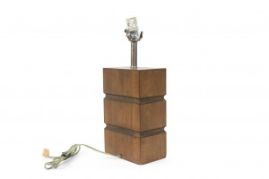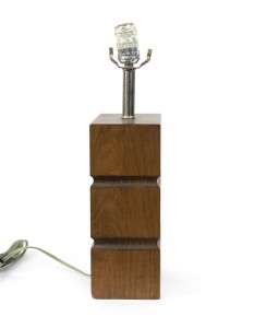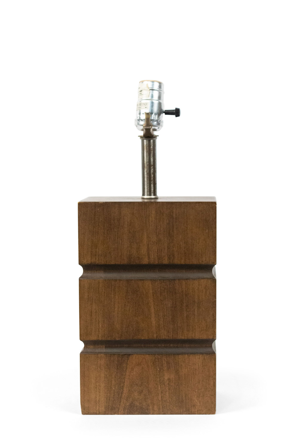 American Mid-Century rectangular 3 tier dark wood stained table lamp with a matching fabric rectangular shade.