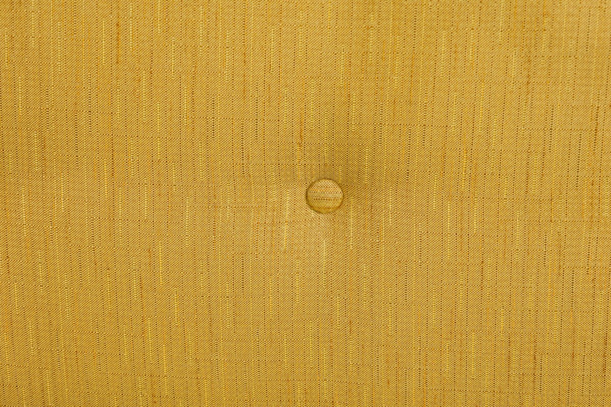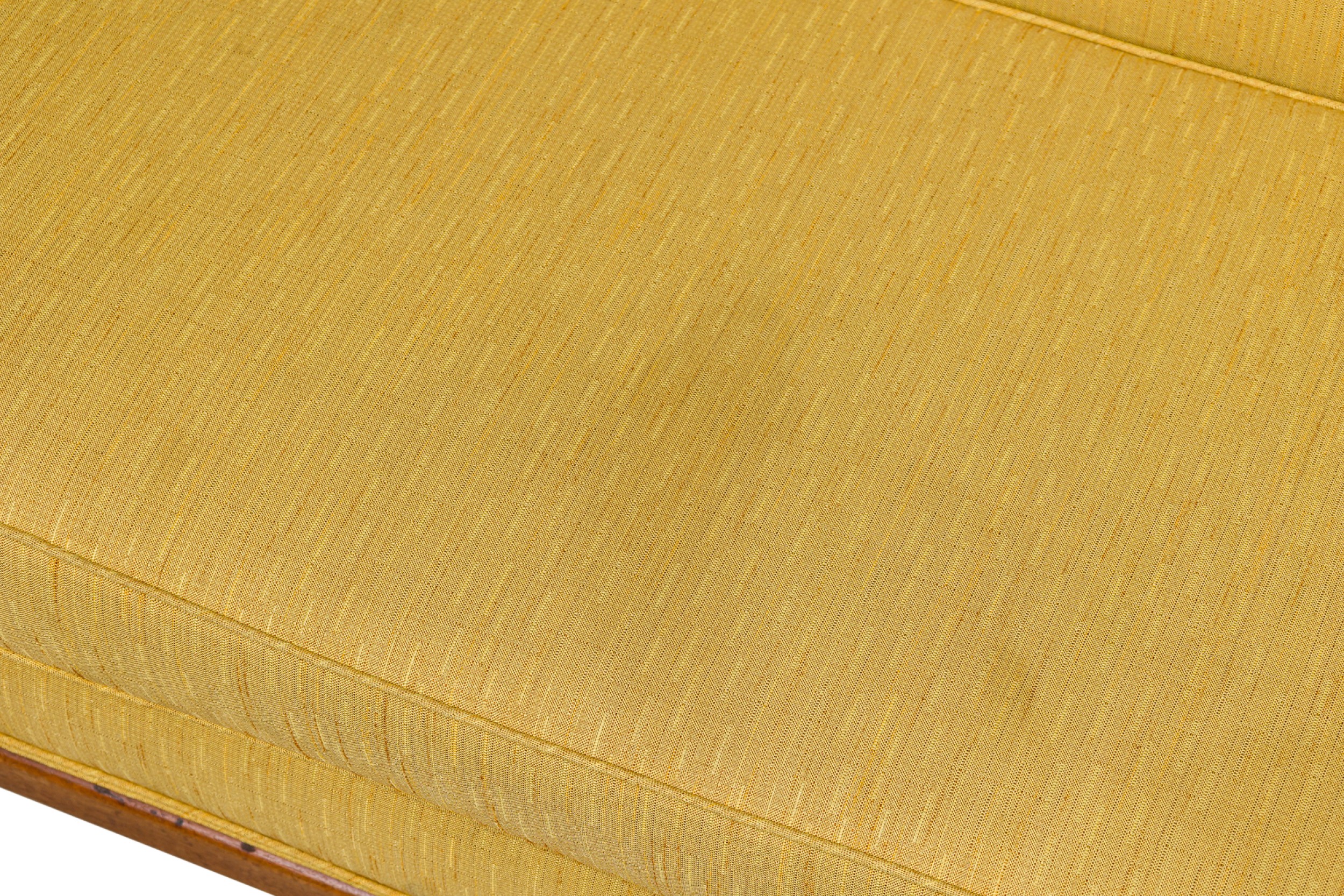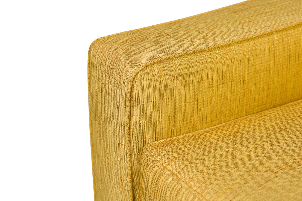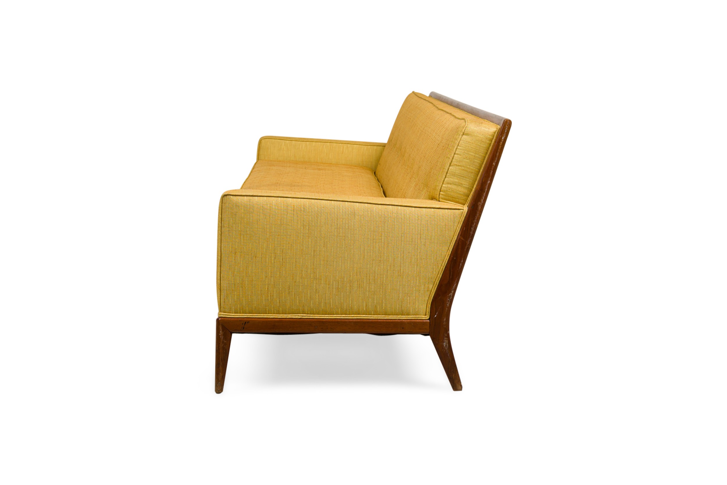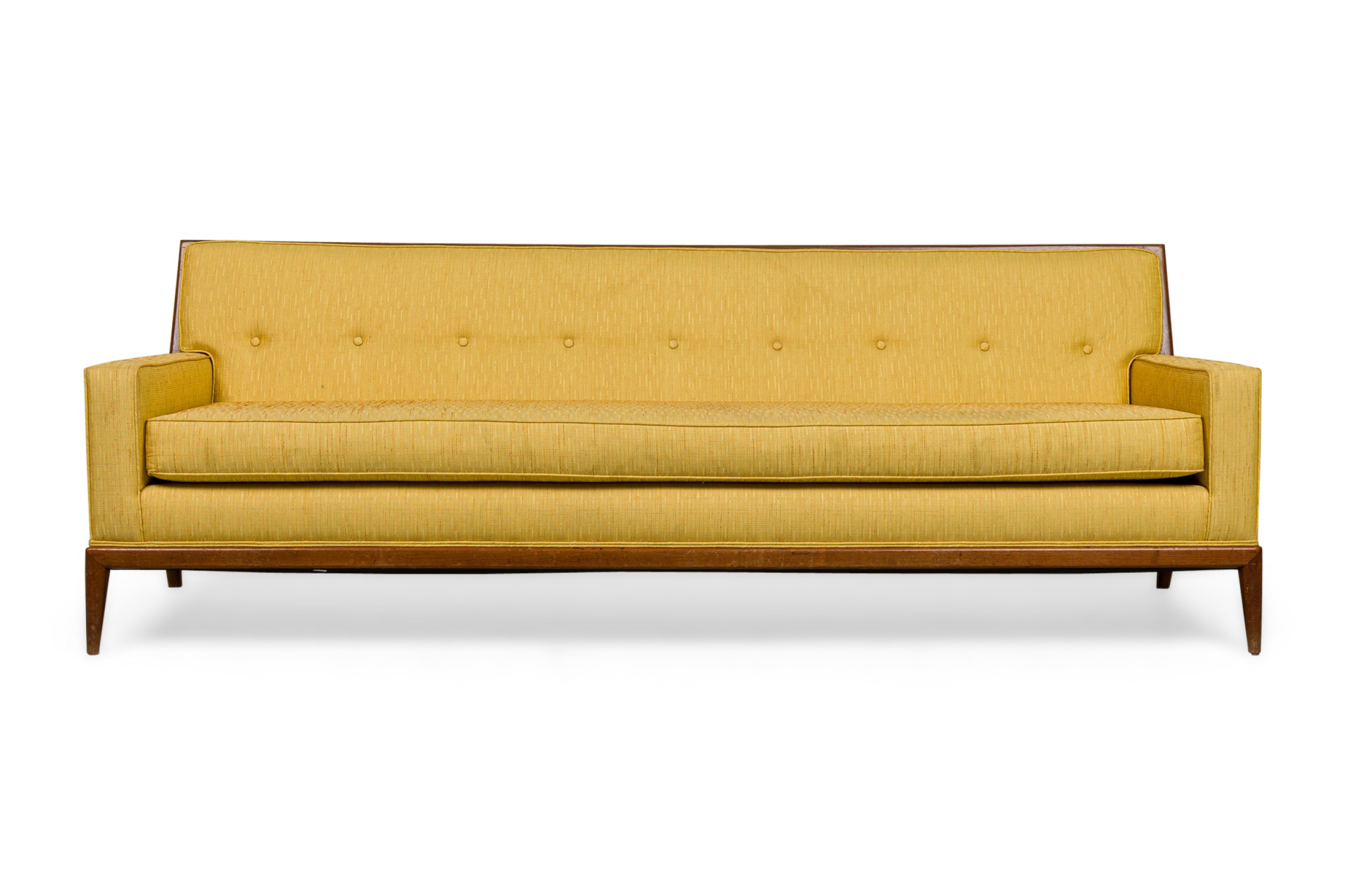 2 American Mid-Century yellow fabric upholstered sofas having button tufted backrests and piping on the edges with a large single seat cushion resting on tapered and splayed wooden legs. (PRICED EACH)