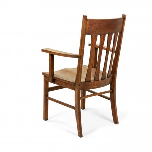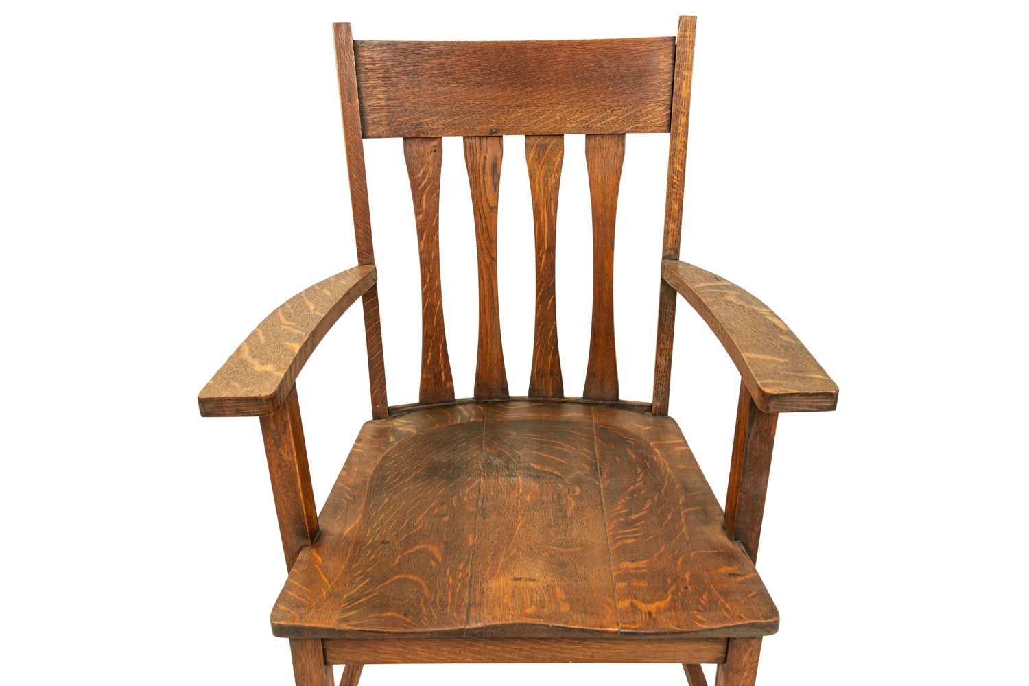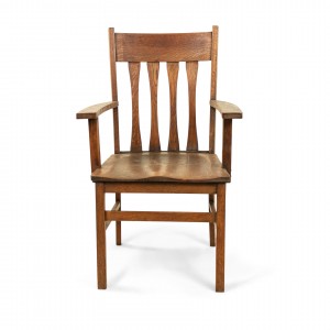 American Mission-style wooden armchair with a four slat back and wooden seat.