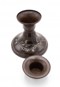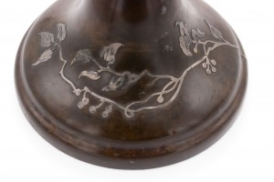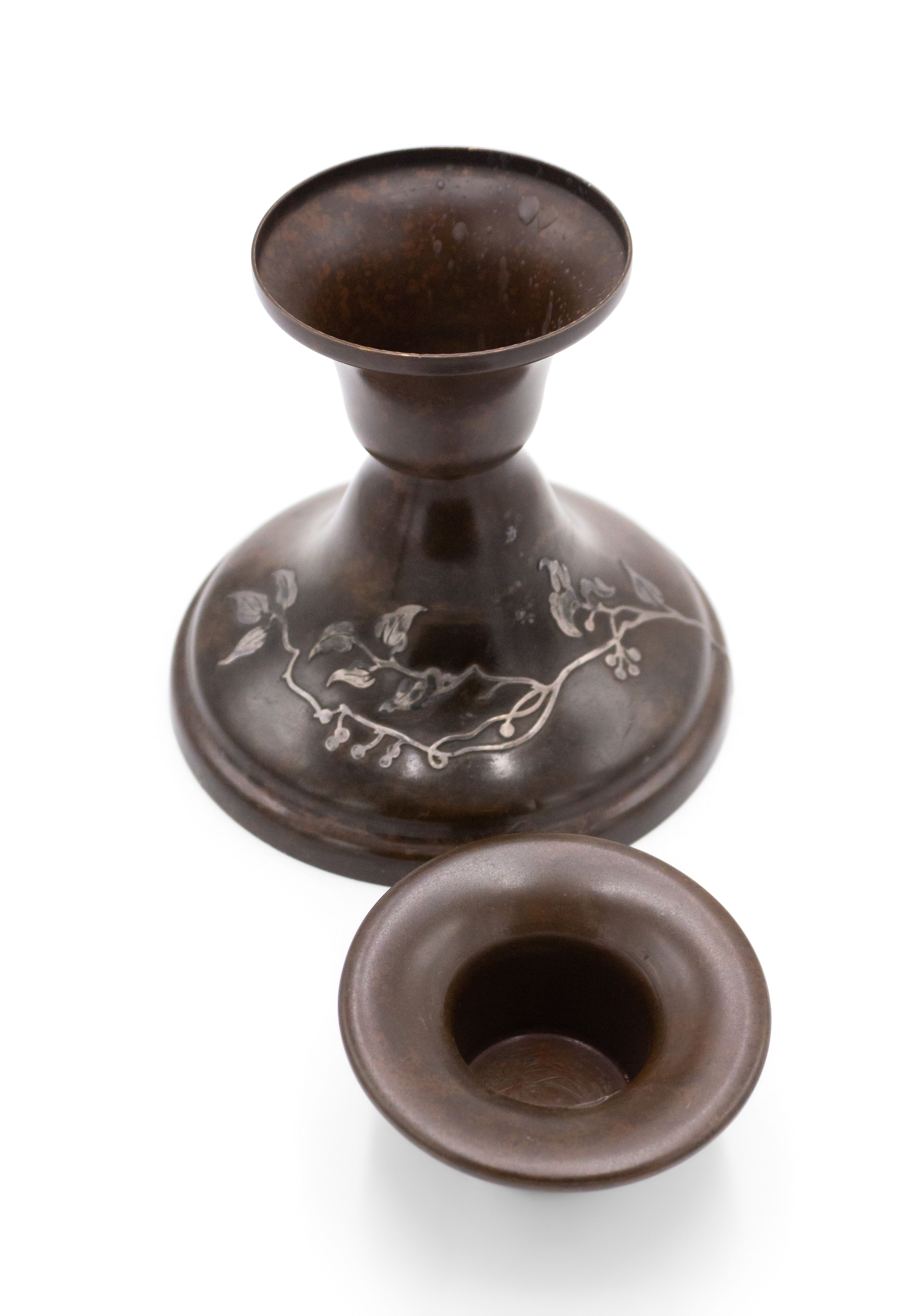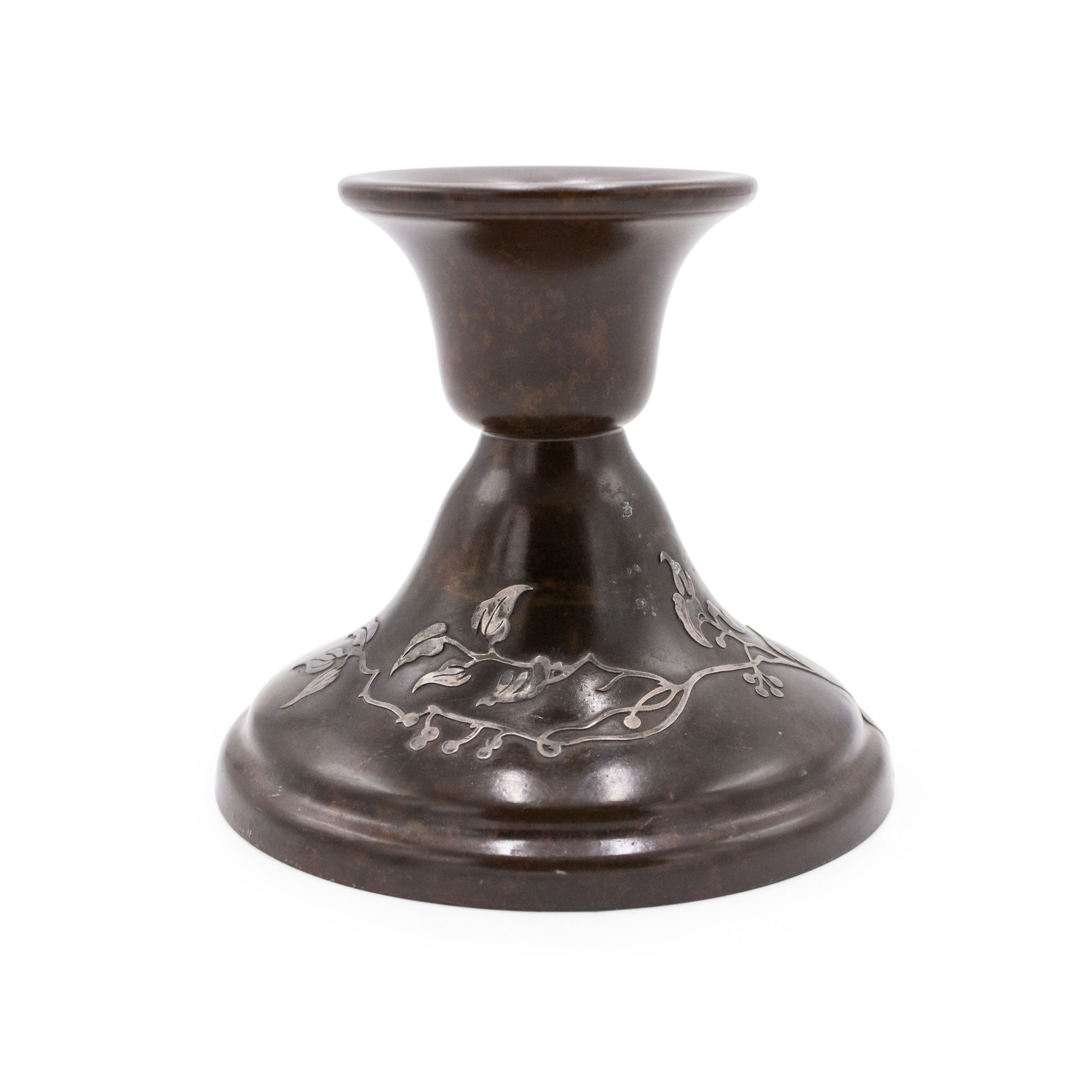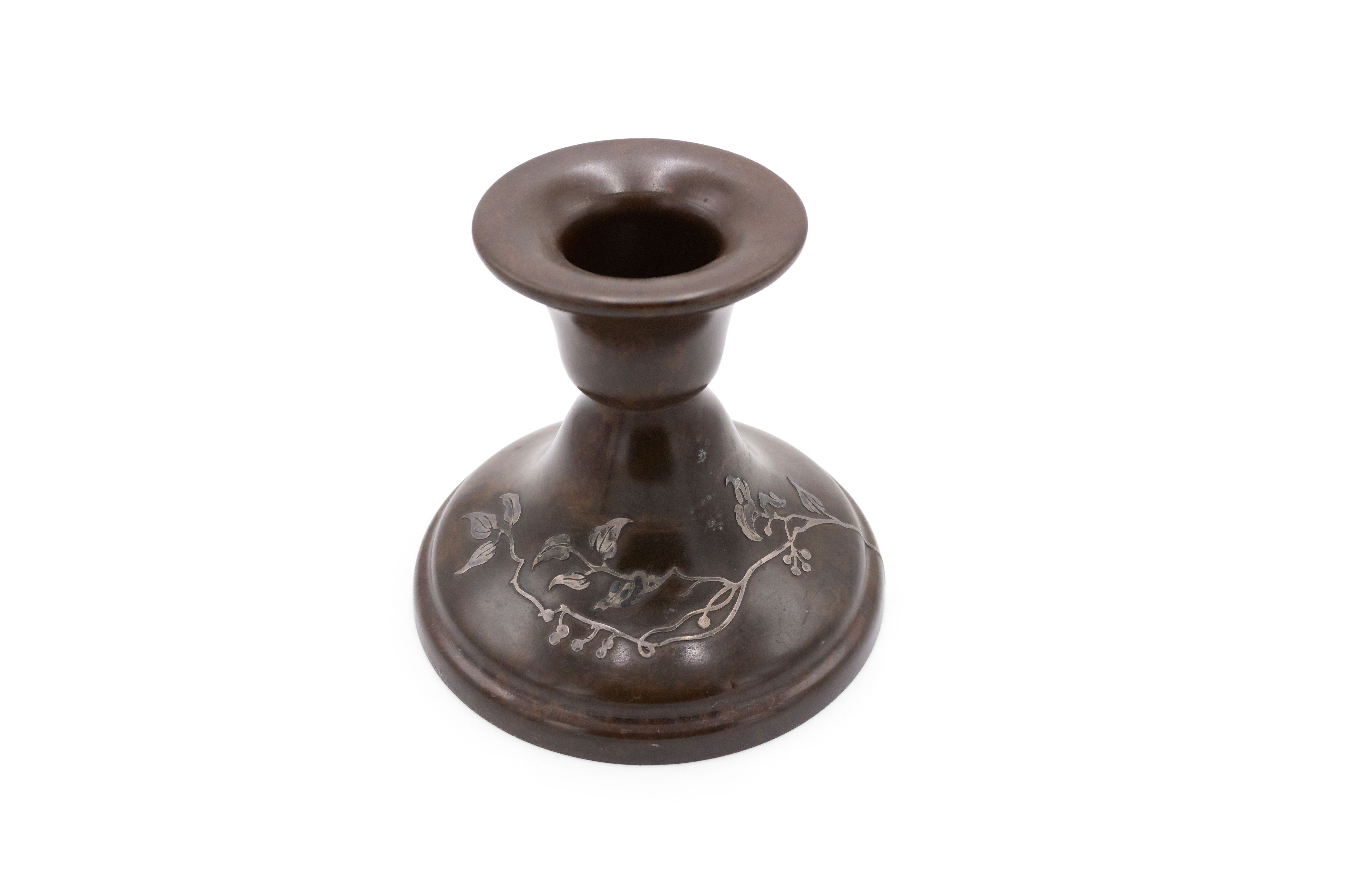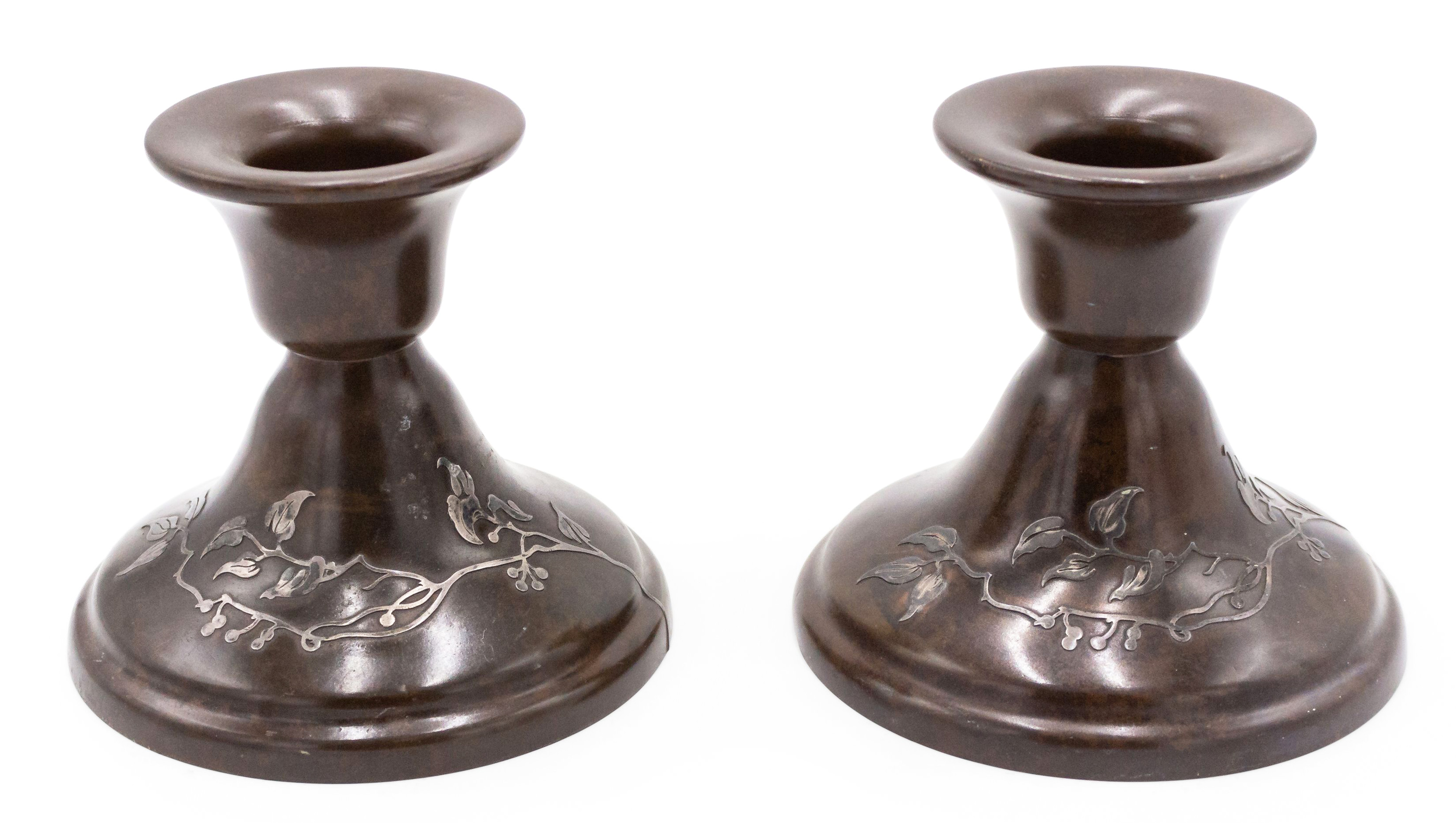 PAIR of American Mission bronze (brown patina) candlesticks with silver deposit floral design (Heintz Art Metal) (PRICED AS PAIR).