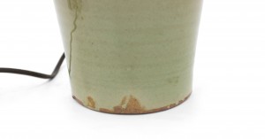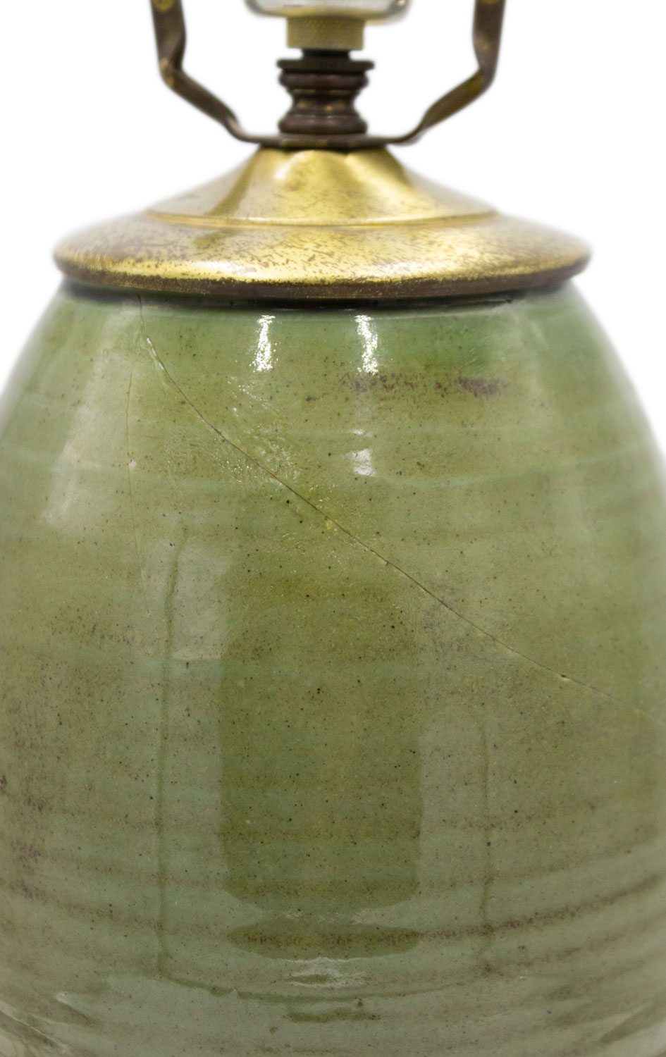 American Mission Arts and Crafts style celadon porcelain table lamp with a cylindrical shape and horizontal ribbing. (Repair to porcelain)