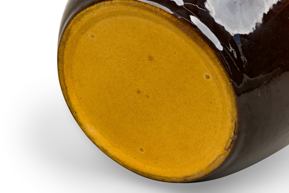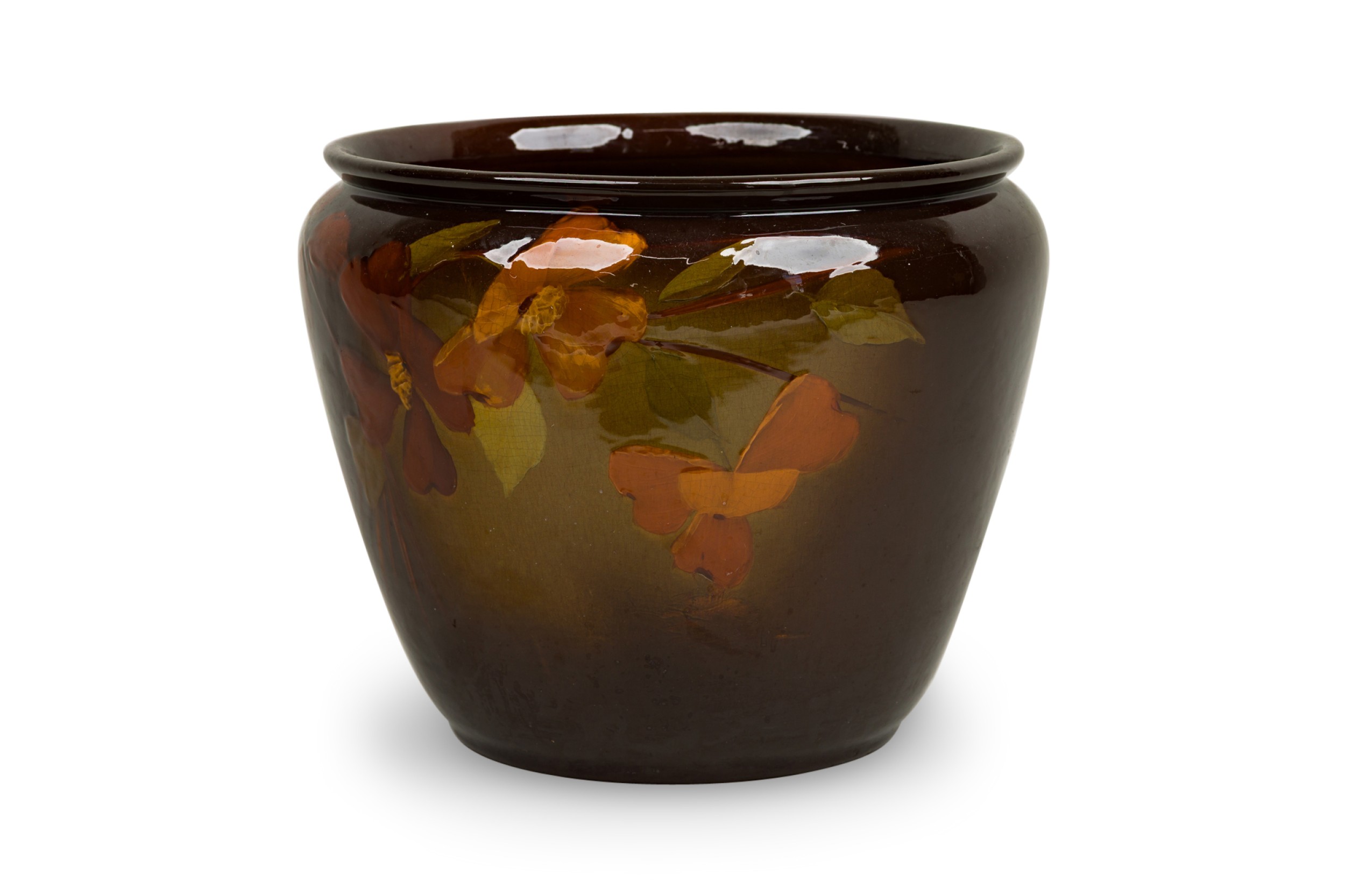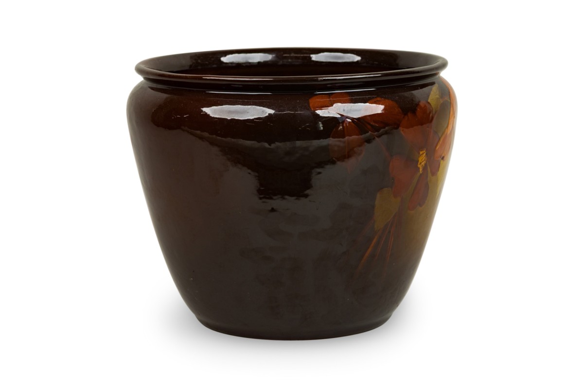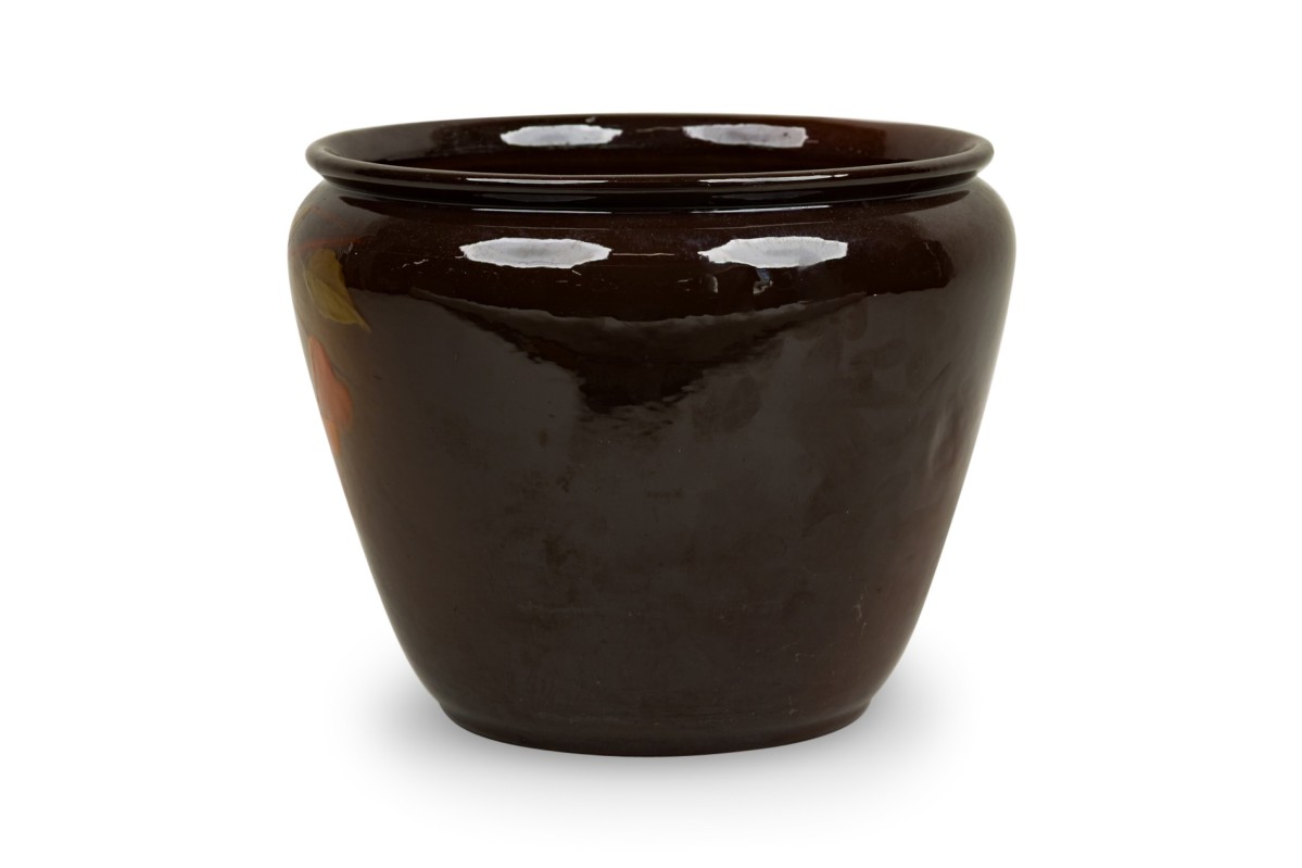 American Mission glazed brown porcelain jardiniere with hand painted monochromatic floral detail (WELLER POTTERY)