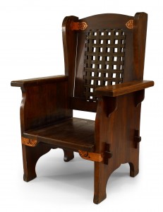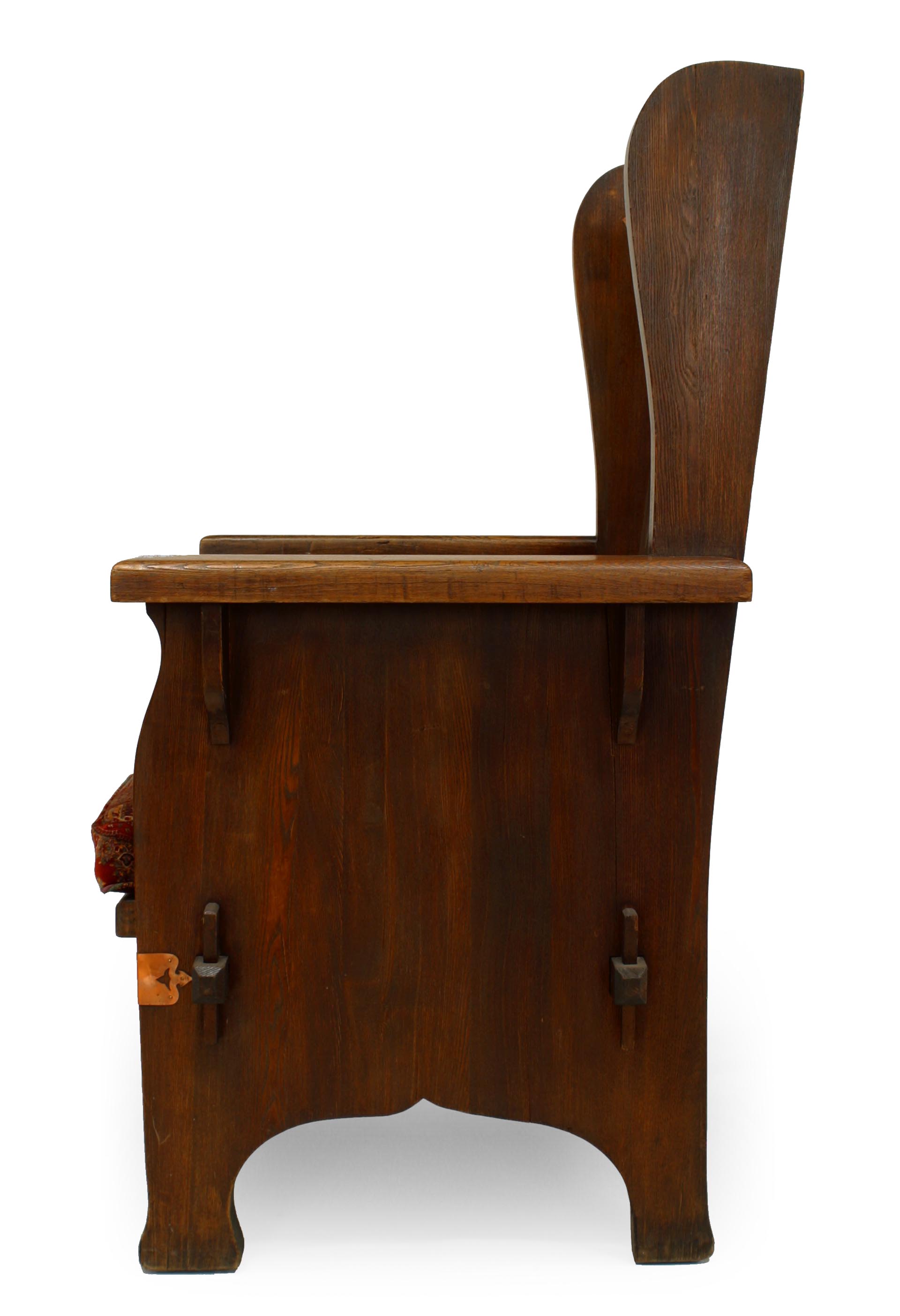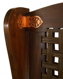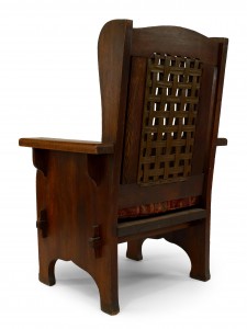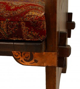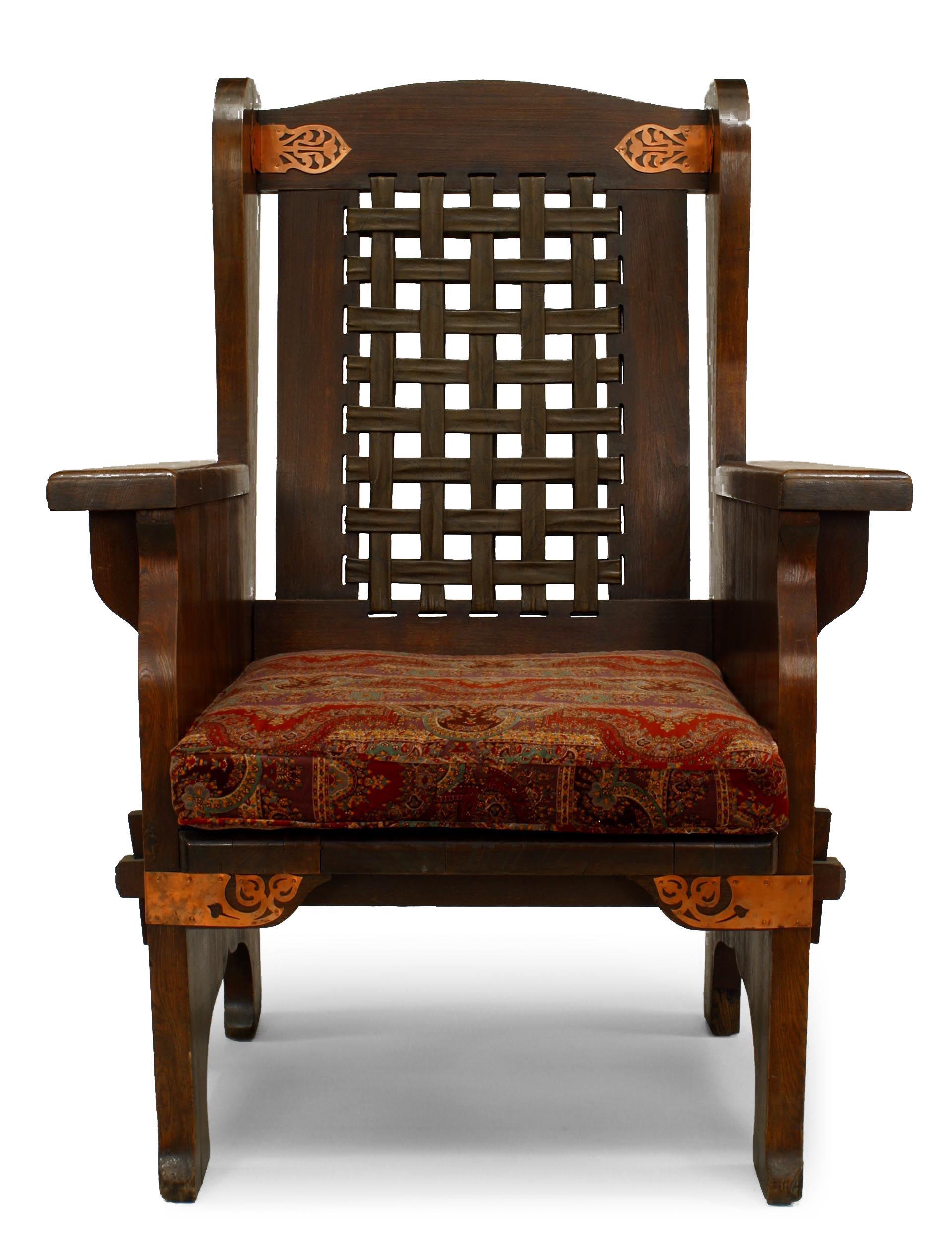 American Mission stained oak wing chair with decorative copper trim and leather mesh back with paisley seat cushion (Dexter Furniture Co., Black River)