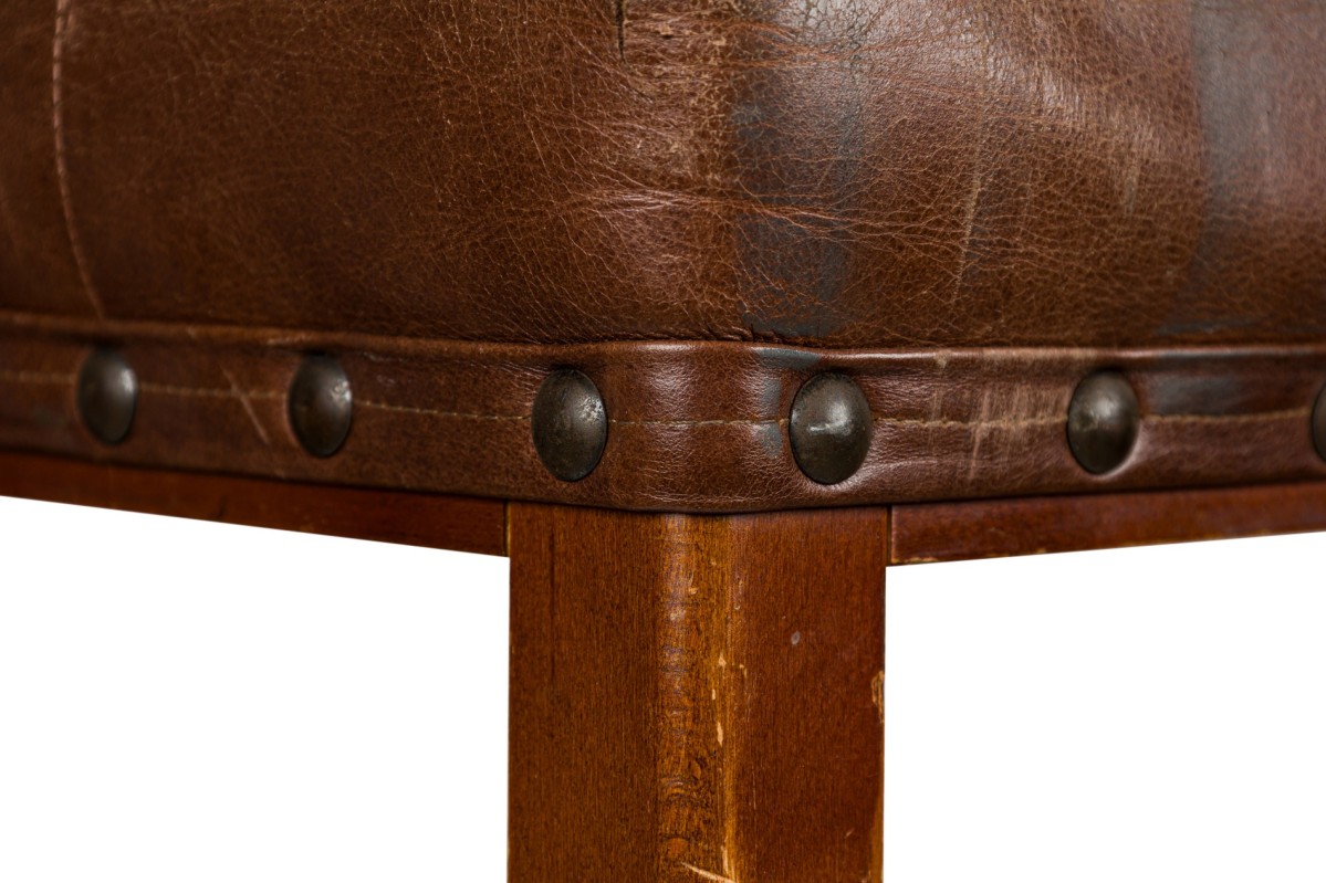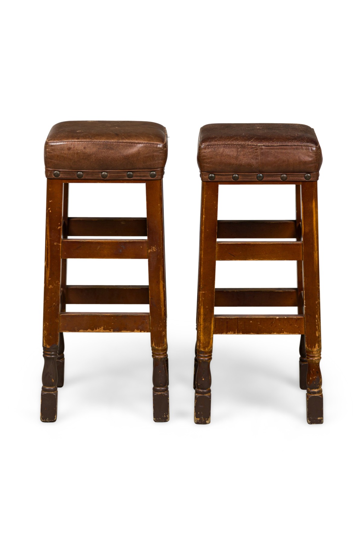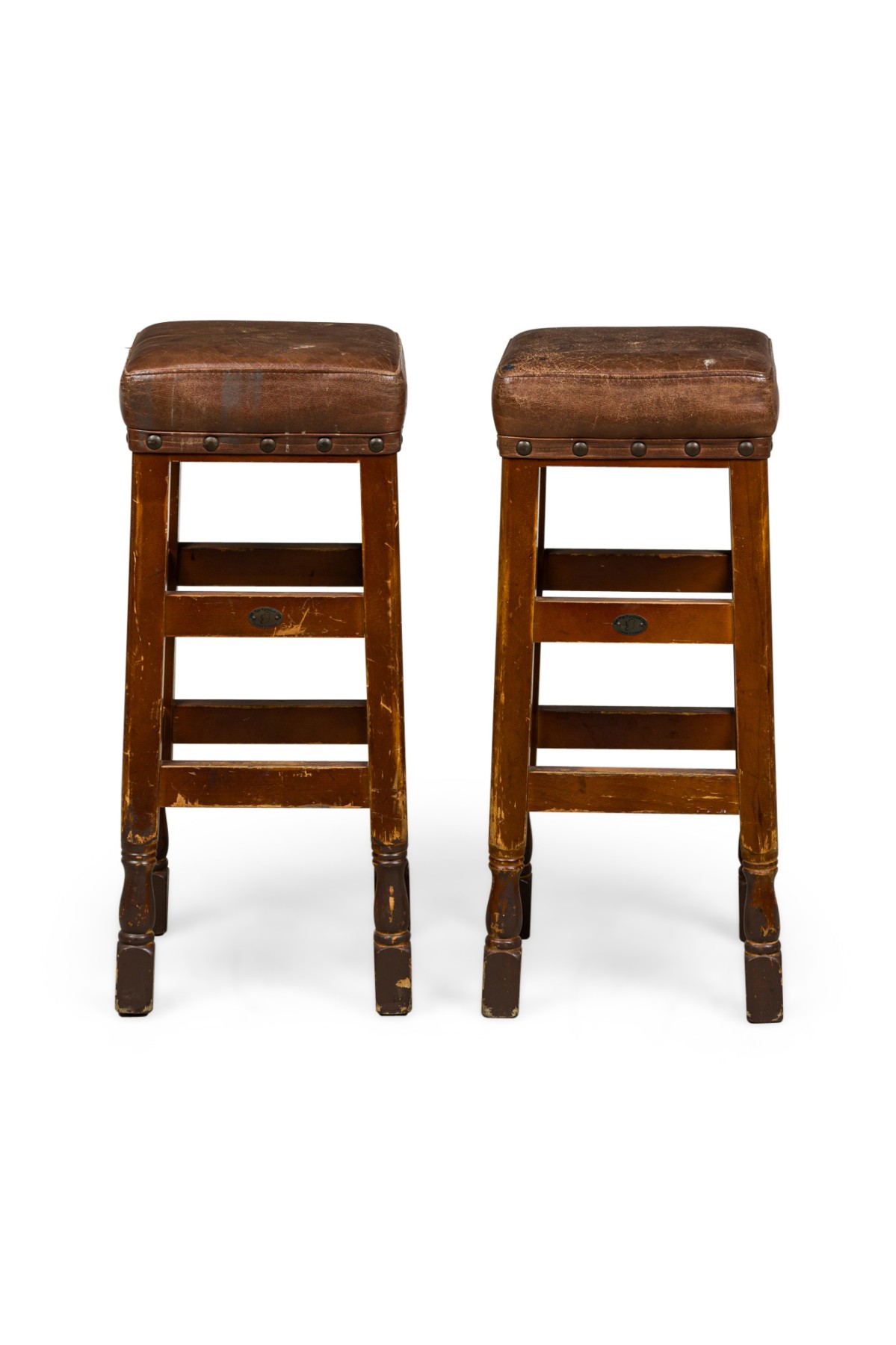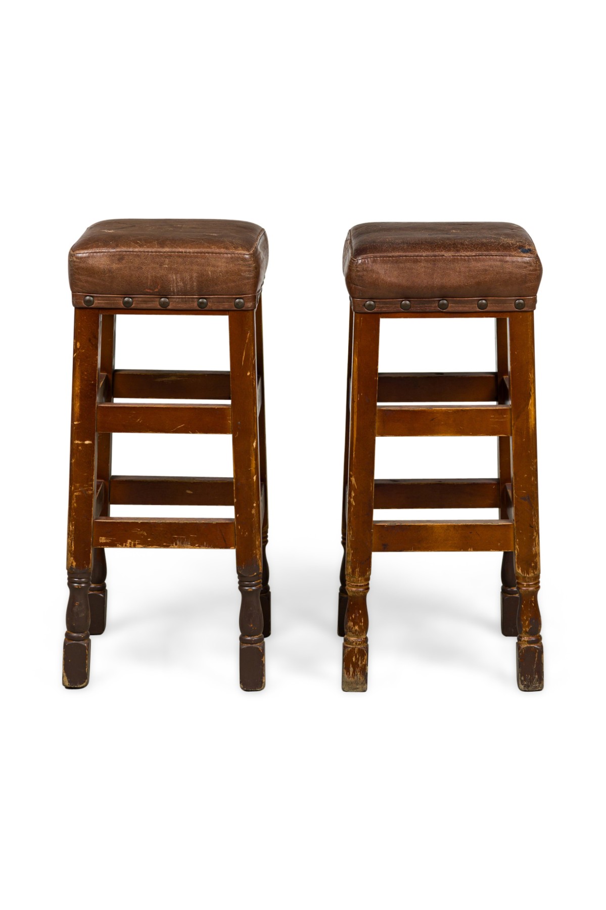 6 American Mission tan leather and wood barstools ending on turned bun feet. (PRICED EACH)