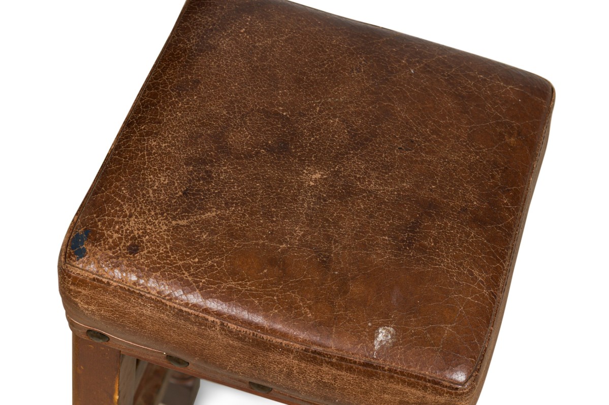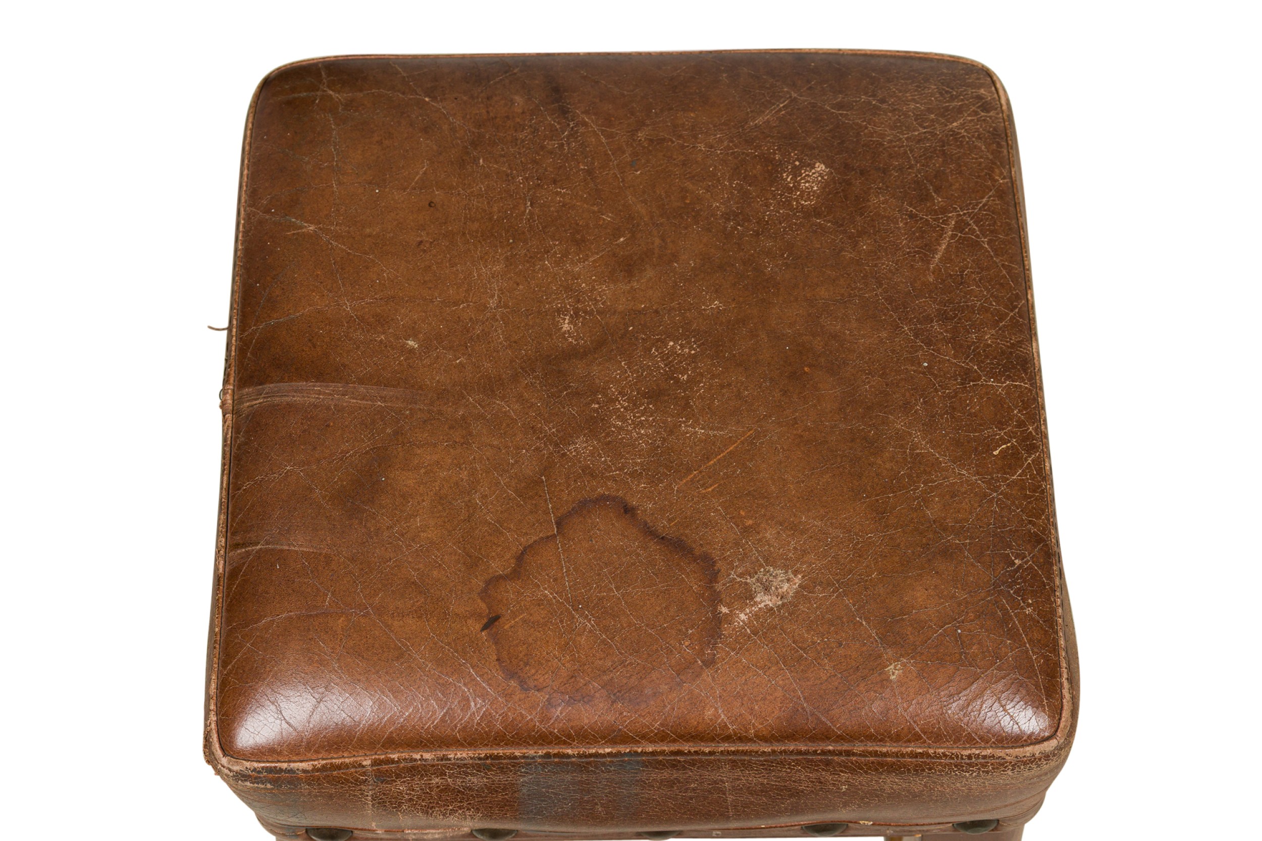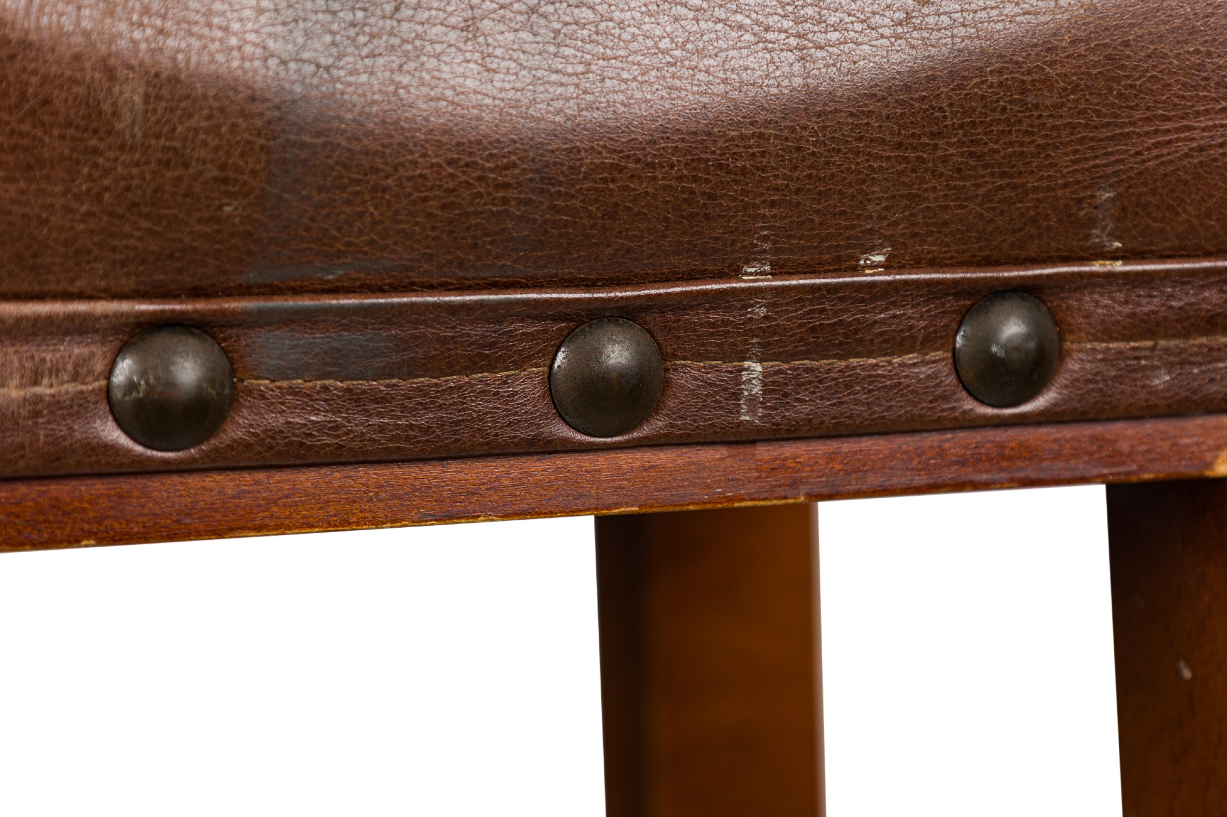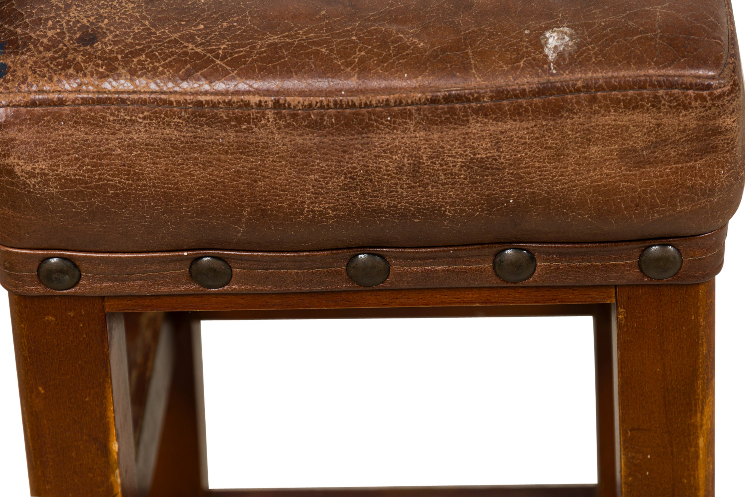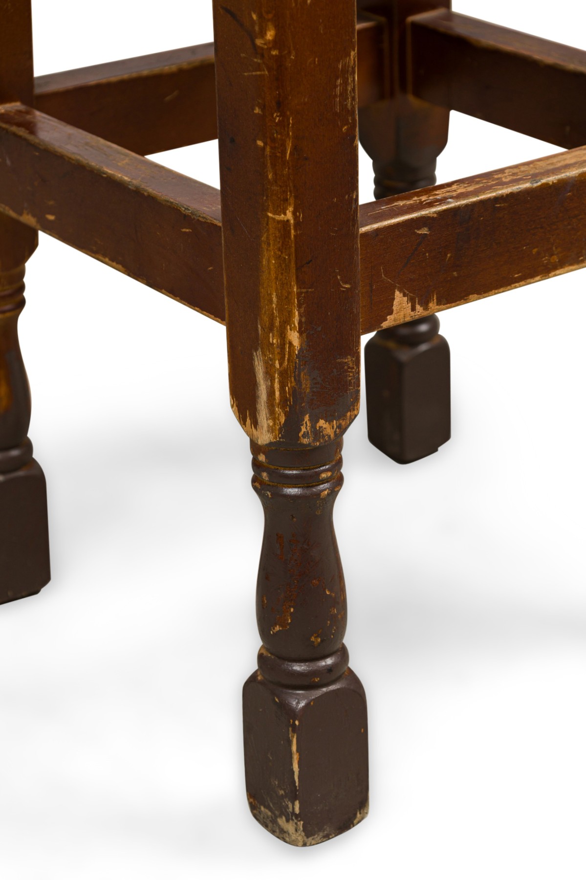 6 American Mission tan leather and wood barstools ending on turned bun feet. (PRICED EACH)