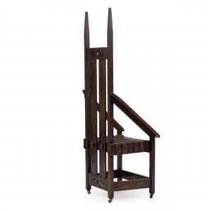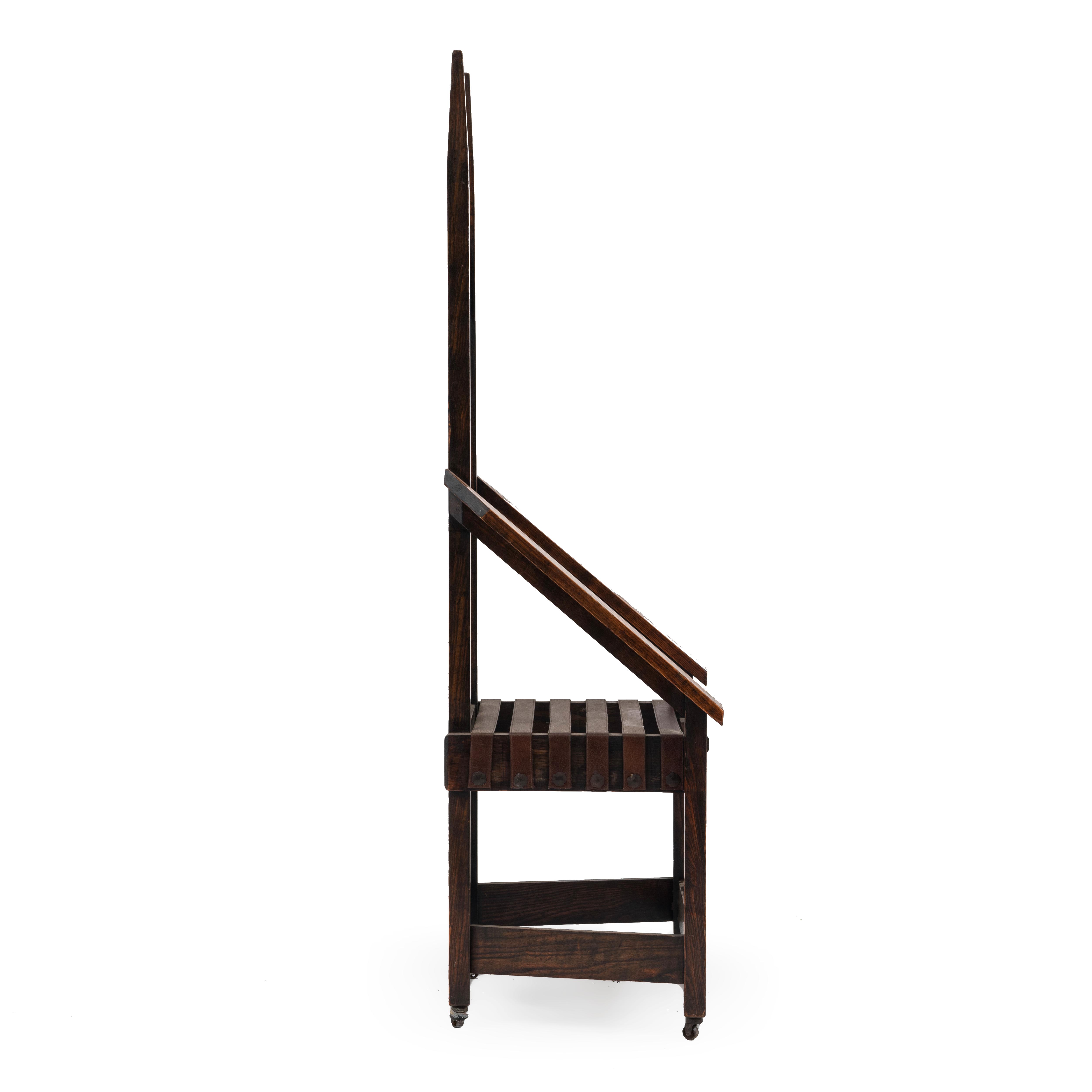 American Mission oak arm chair with high slat back with cut out design and brown leather strap seat. (att.: Rohlfs)