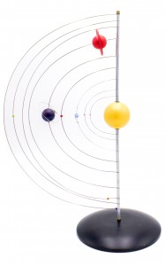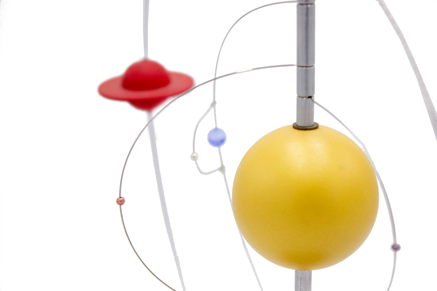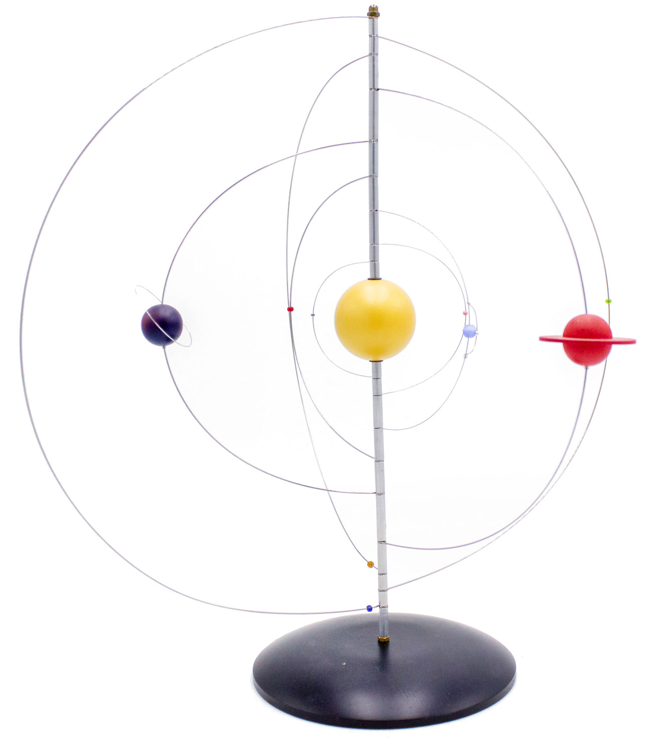 American Post-War Design armillary with planets suspended on wire around a sun supported on a black wood round base