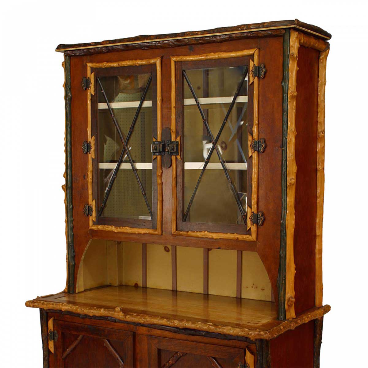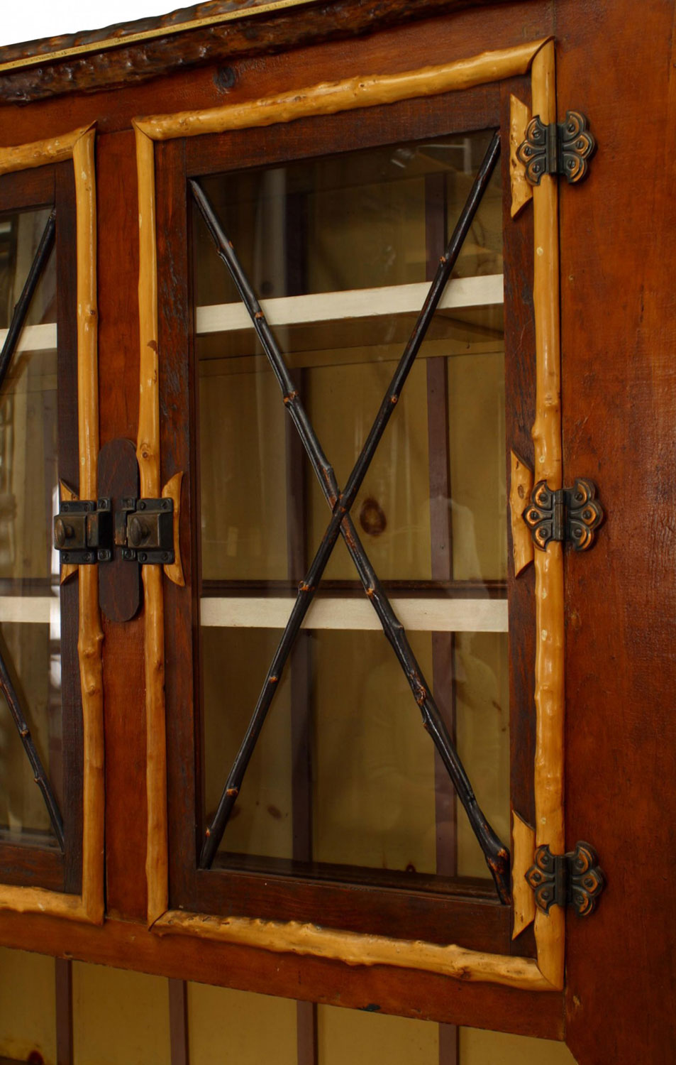 American Rustic Adirondack-style (19/20th Century) painted 4 door cupboard cabinet with twig and various wood decoration with 2 glass doors