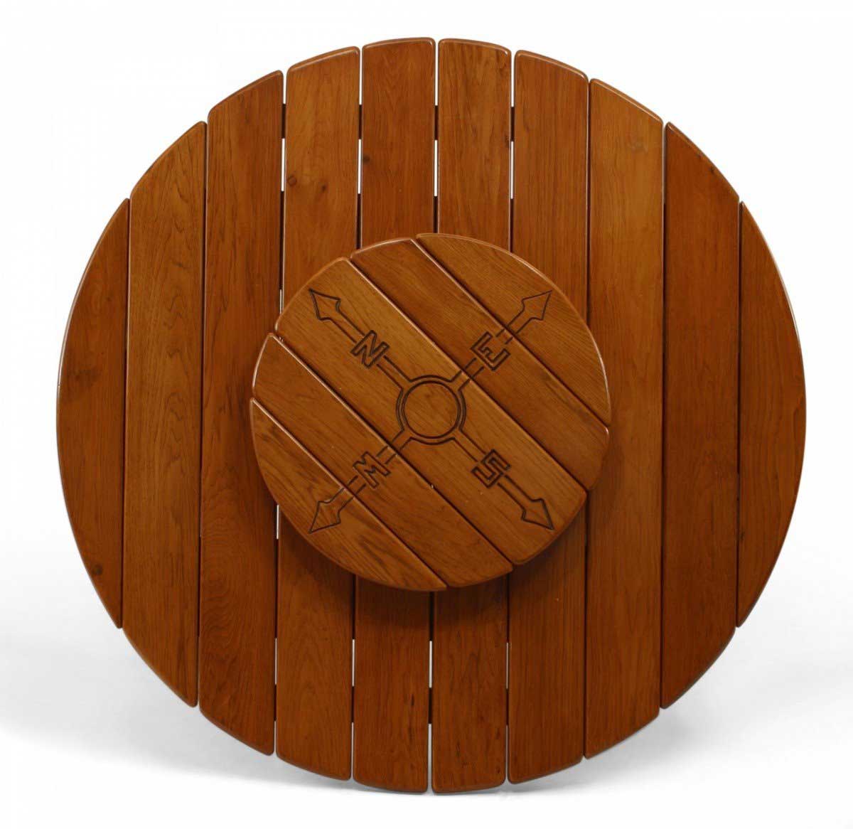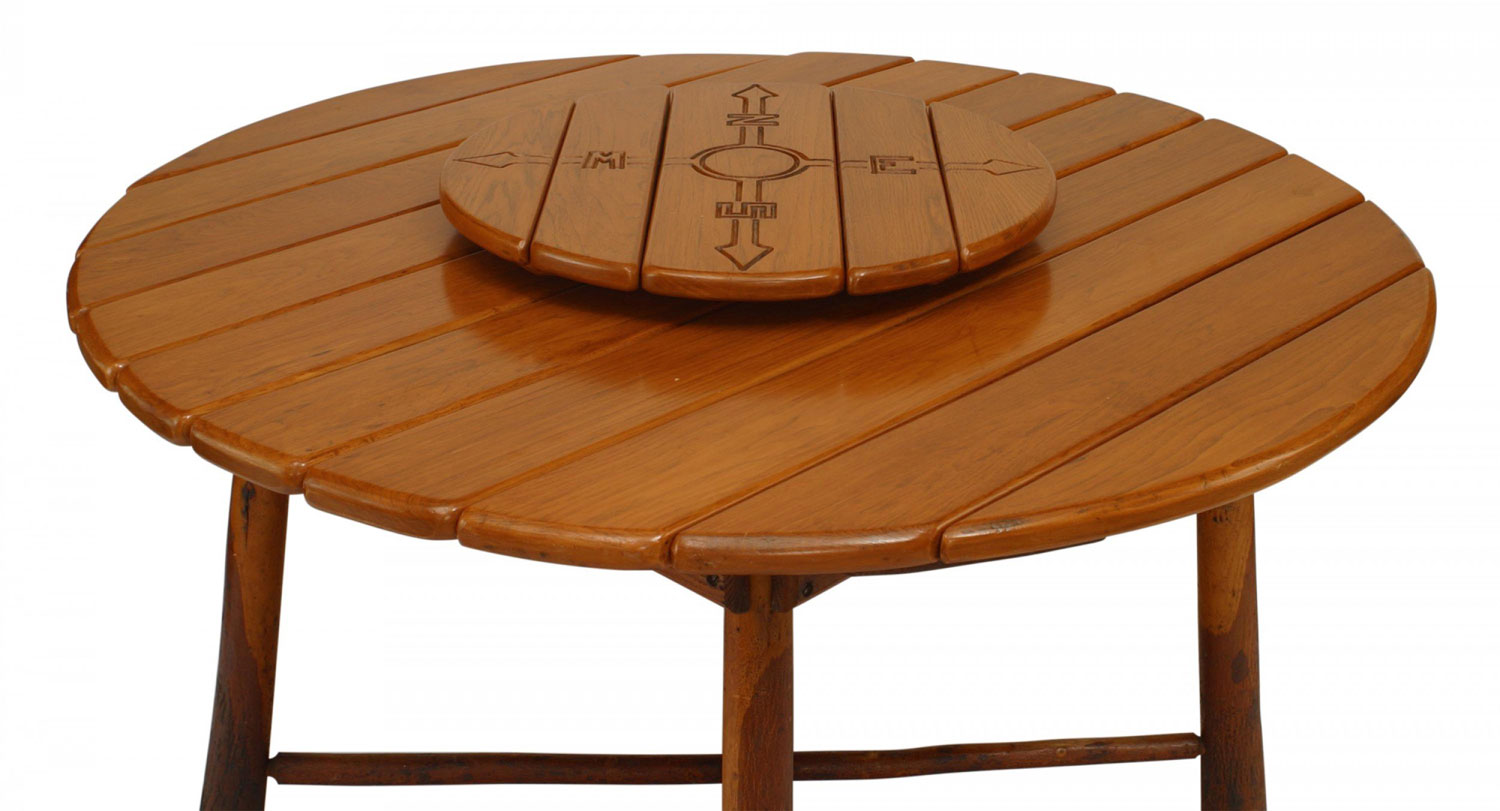American Rustic Old Hickory (1940s) dining table with a round oak plank top above 4 double legs with an "X" form stretcher with a centered lazy susan having a compass top.