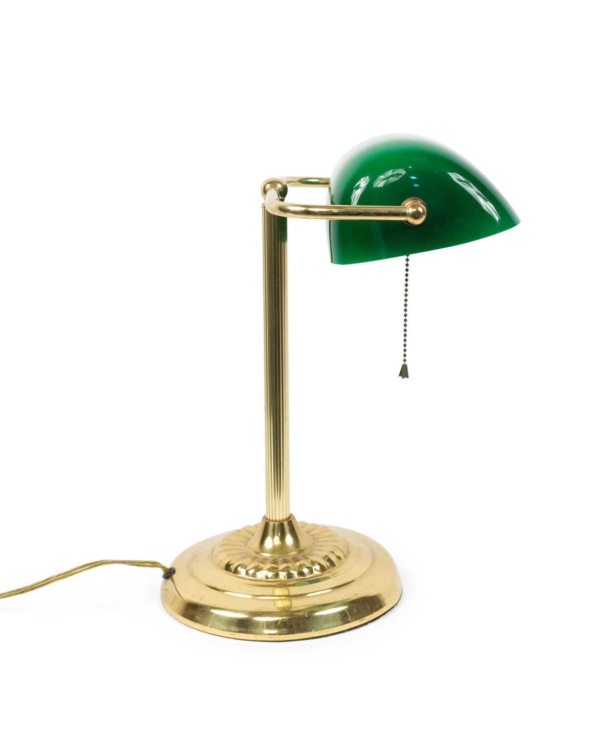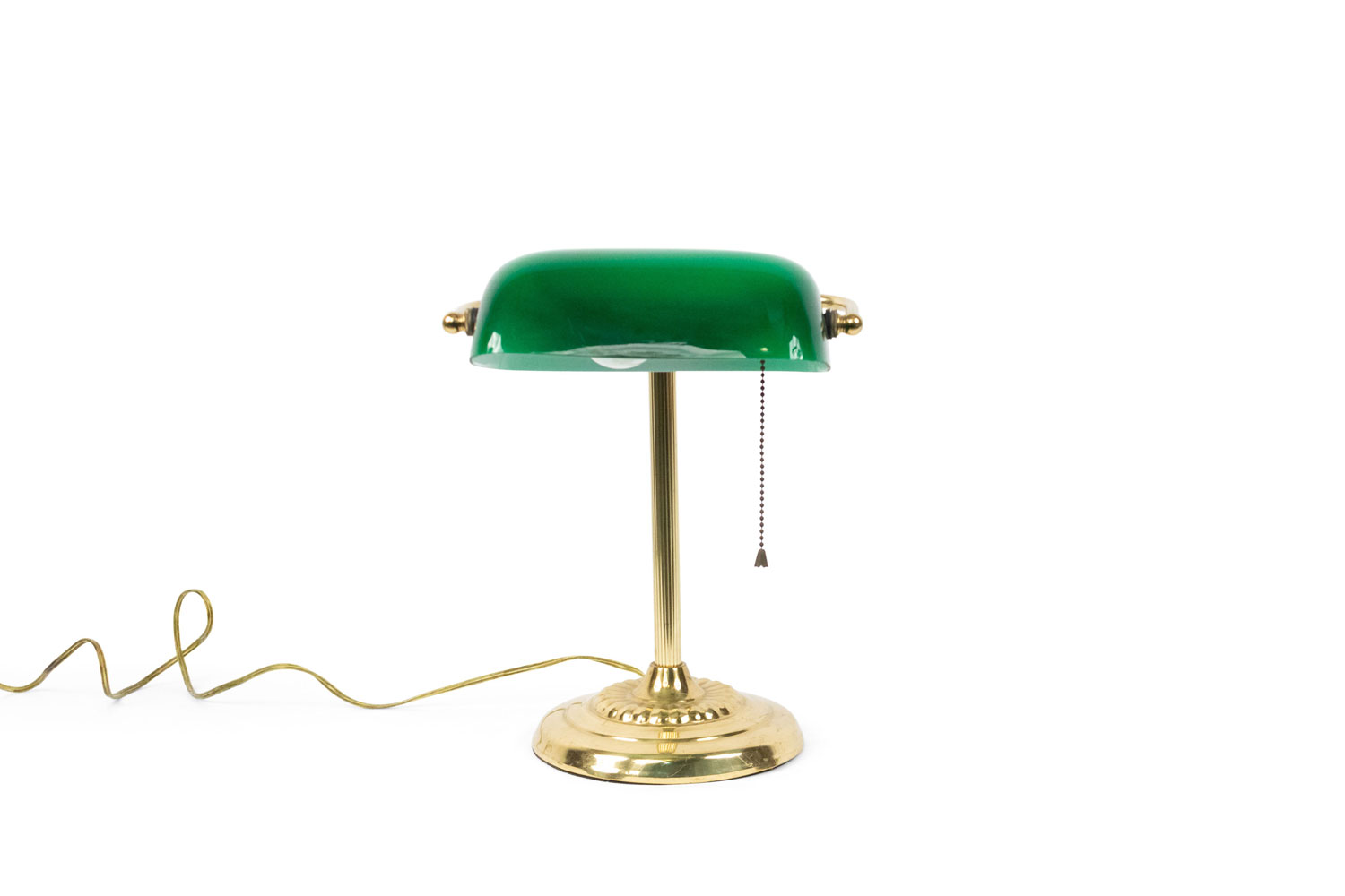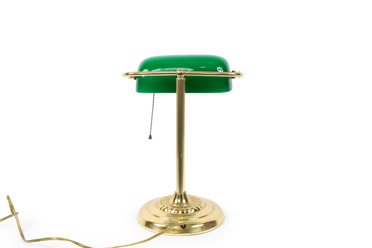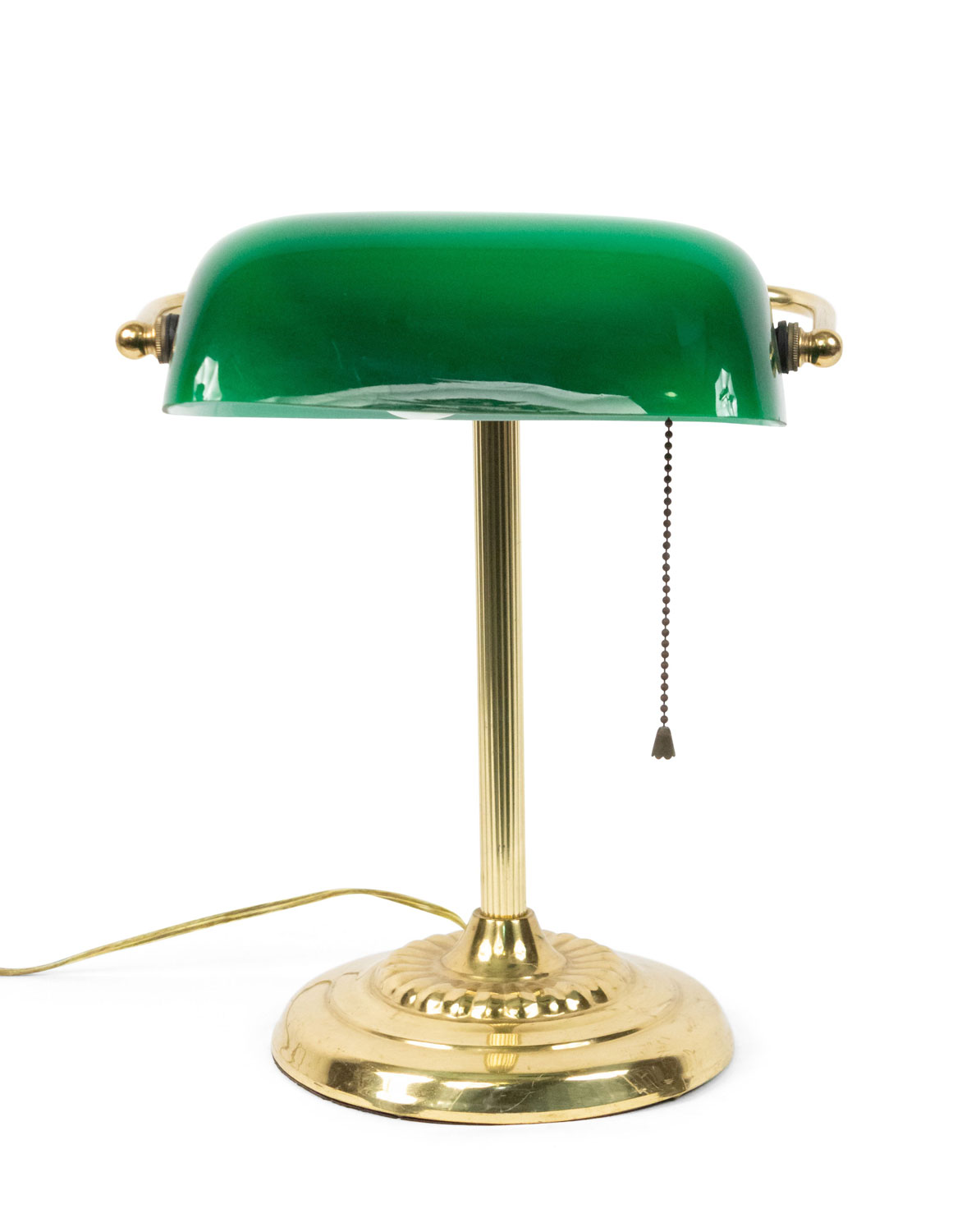 American Victorian-style brass desk lamp supporting a green cased glass rectangular shade.