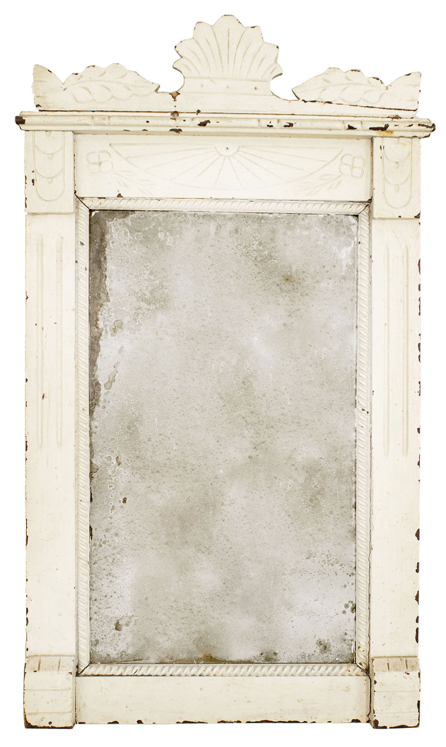 American Victorian Eastlake-style white painted wall mirror with carved leaf bottom corners and a shell pediment top.