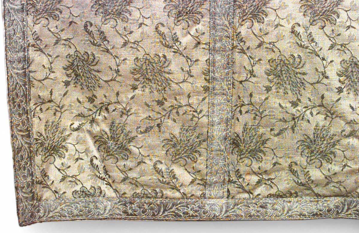 American Victorian green floral design table runner with silver metallic border.