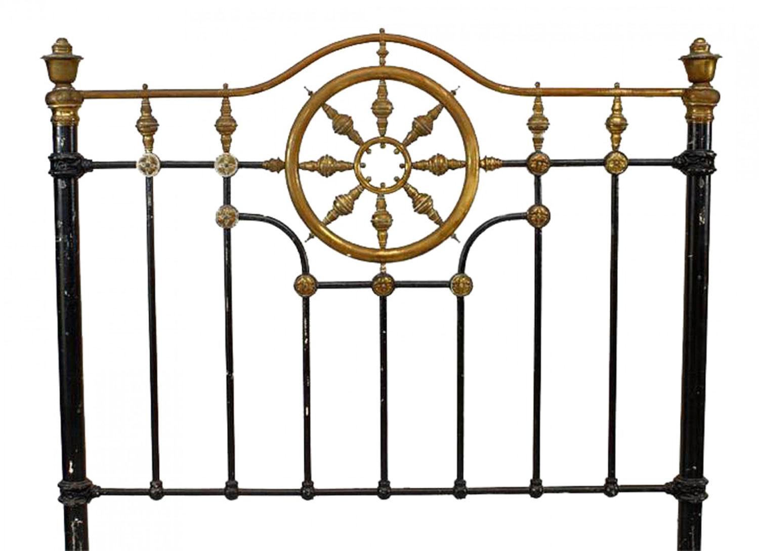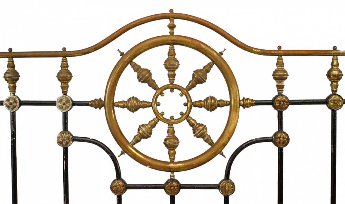 American Victorian black painted full size bed with brass wheel design (includes: headboard, footboard, rails).