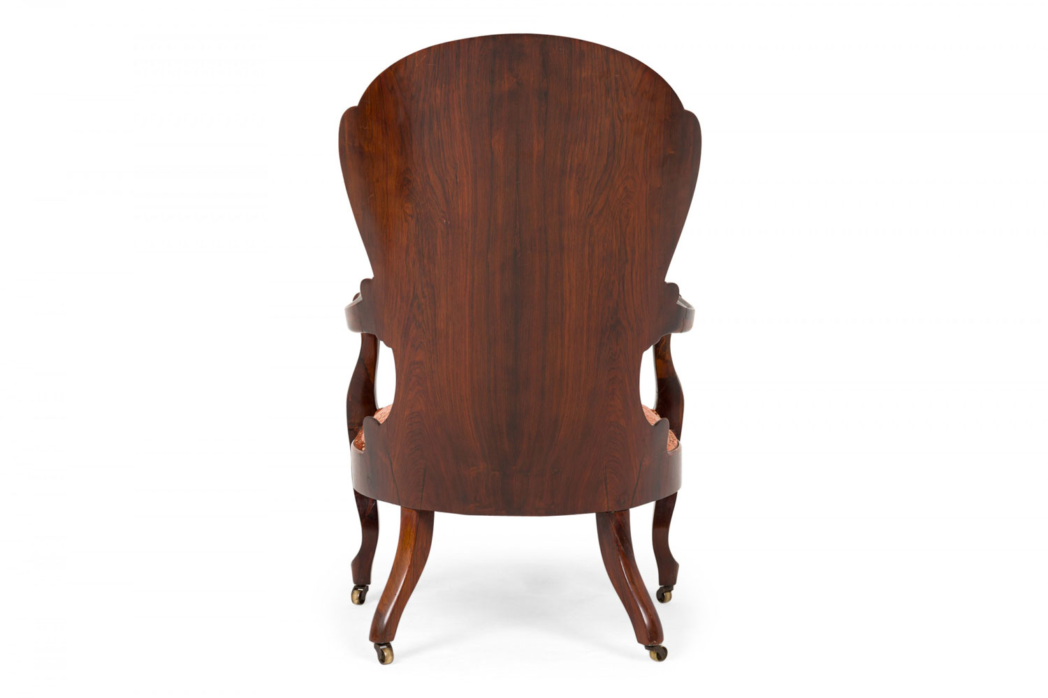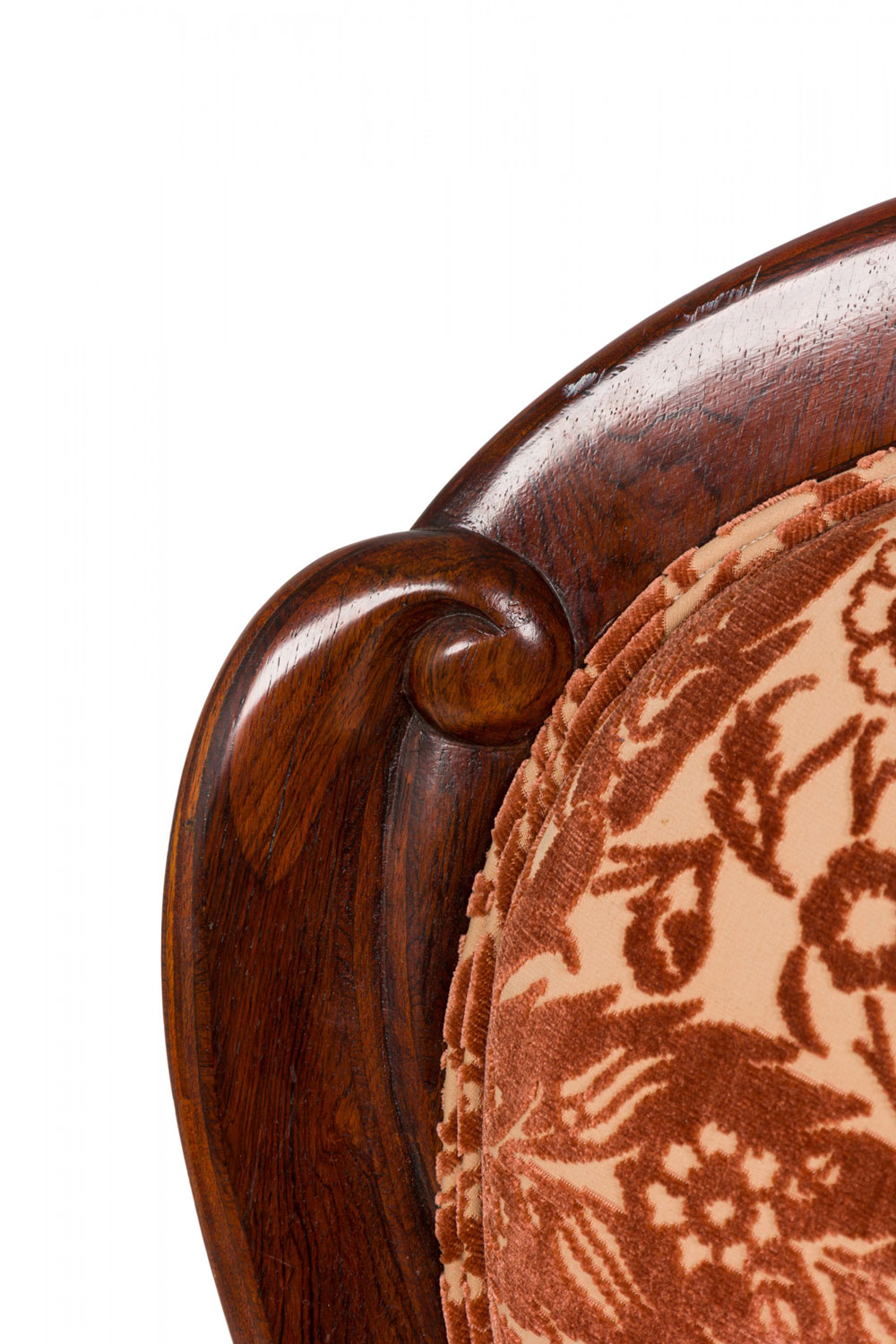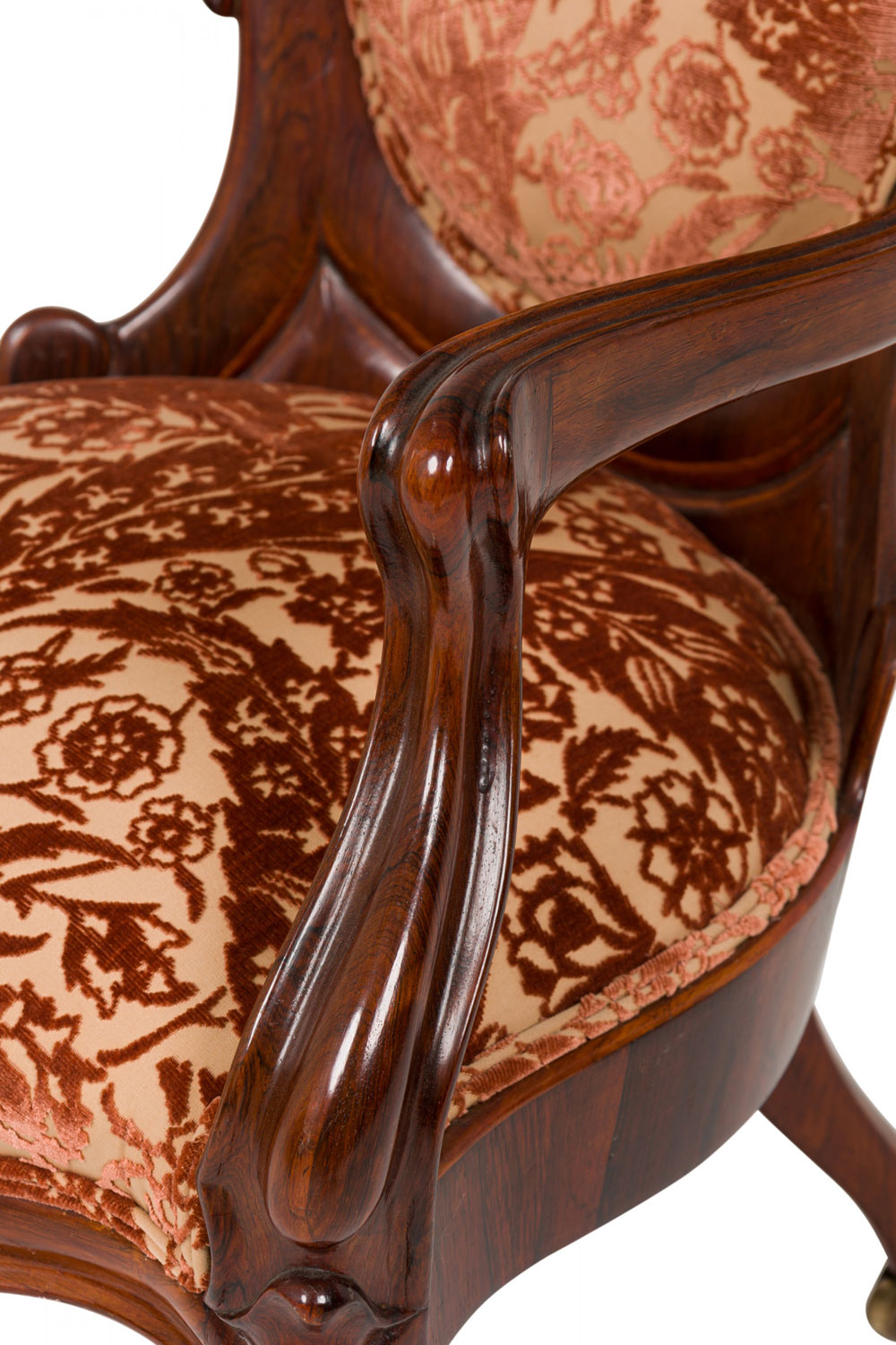 American Victorian rosewood armchair with scroll design back, upholstered in a cream-colored fabric with a raised rich mauve velvet floral design. (Attributed to JOHN HENRY BELTER) (See also: Living room set: 041801; 2 settees-1 with removable cushion: 041801A, 1 with incorporated cushion 041801D; 3 matching side chairs: 041801C)