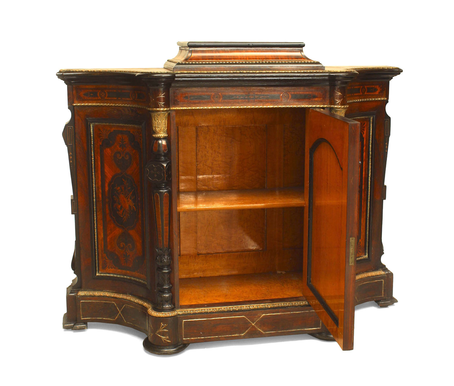 American Victorian Eastlake (NY) rosewood credenza with bronze & ebonized trim. Having a raised center platform over concave inlaid side panels and a front door maple interior. (Missing bronze trim on side)