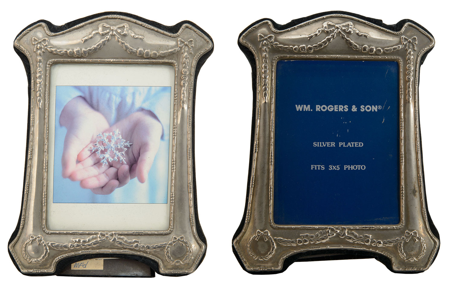 2 American Victorian vintage-style ornate embossed silver metal frame with a bow knot and swag top having a back of black velvet (PRICED EACH)