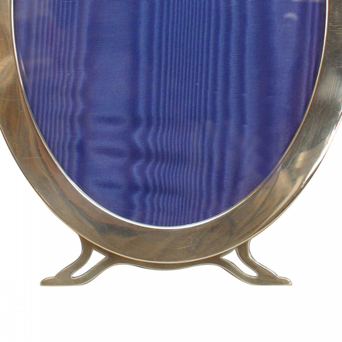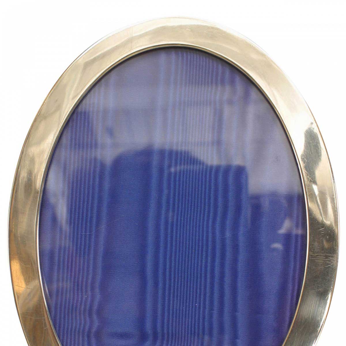 American Victorian-style sterling silver oval easel picture frame raised on 2 open feet with blue velvet backing.