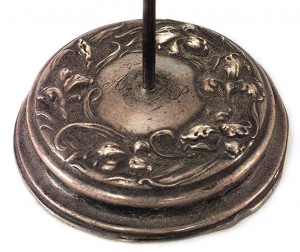 American Victorian silver paper collector with single prong and floral design on lead weighted round base.