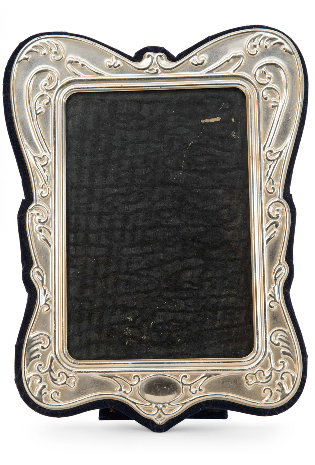 American Victorian-style vintage ornate embossed silver metal frame on black velvet