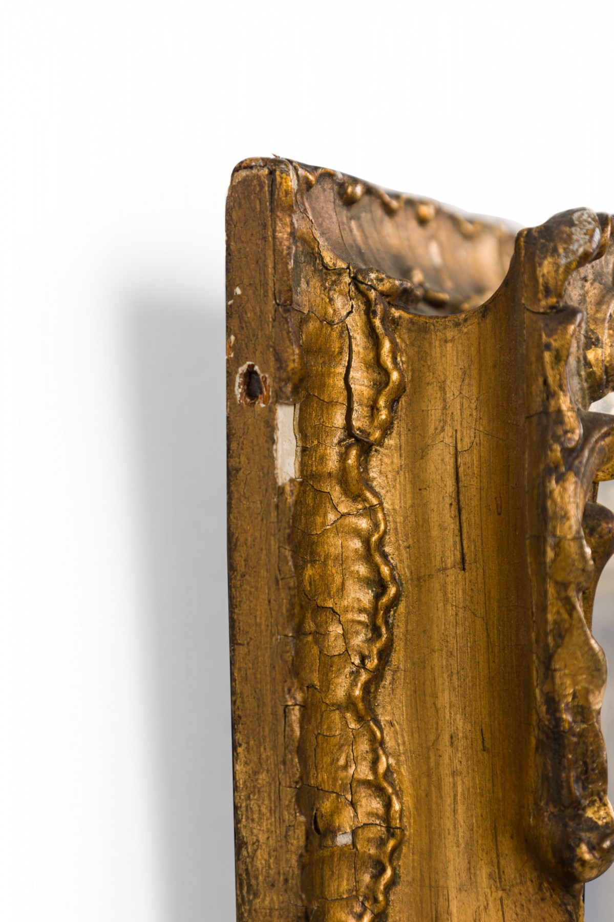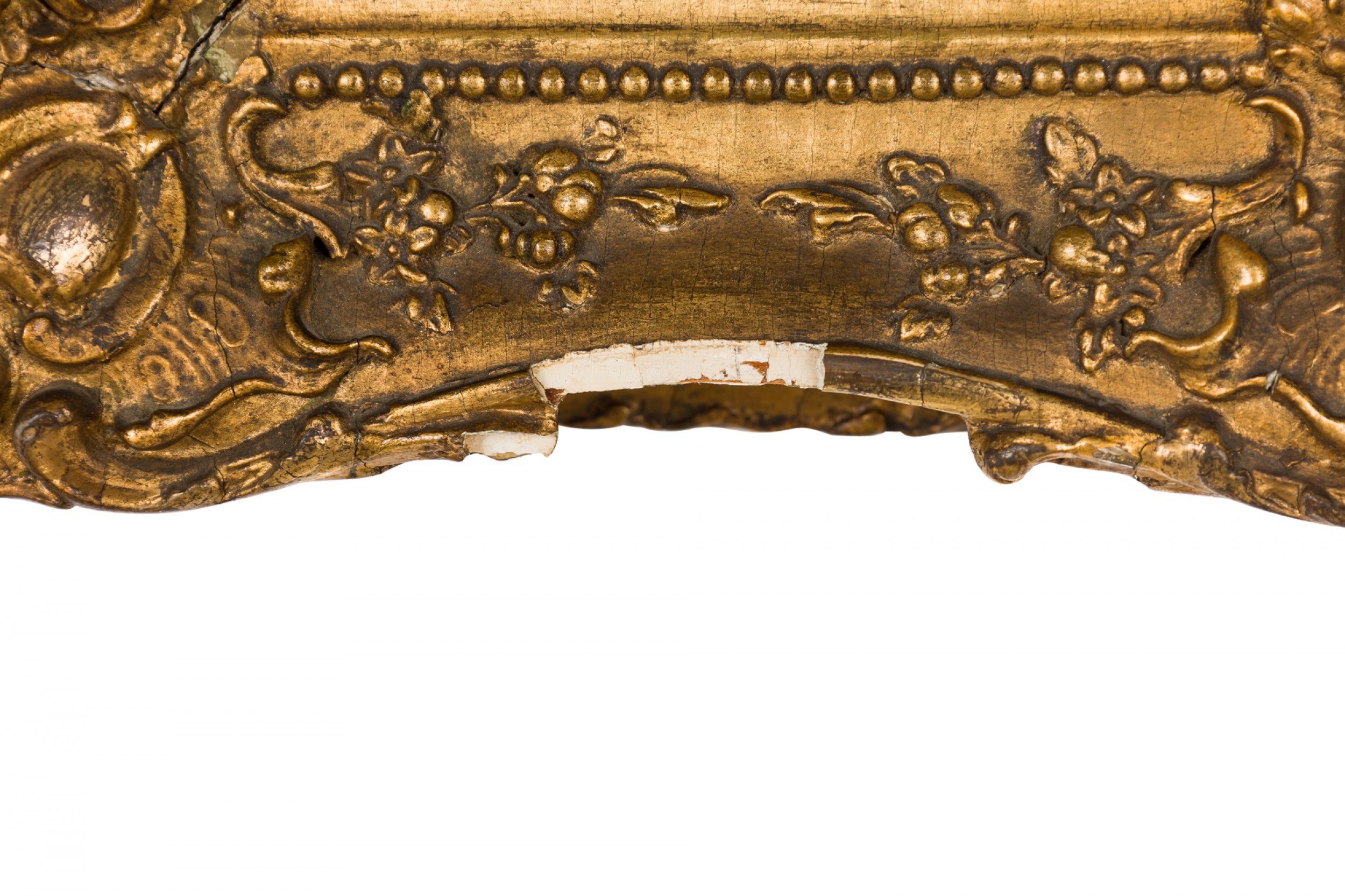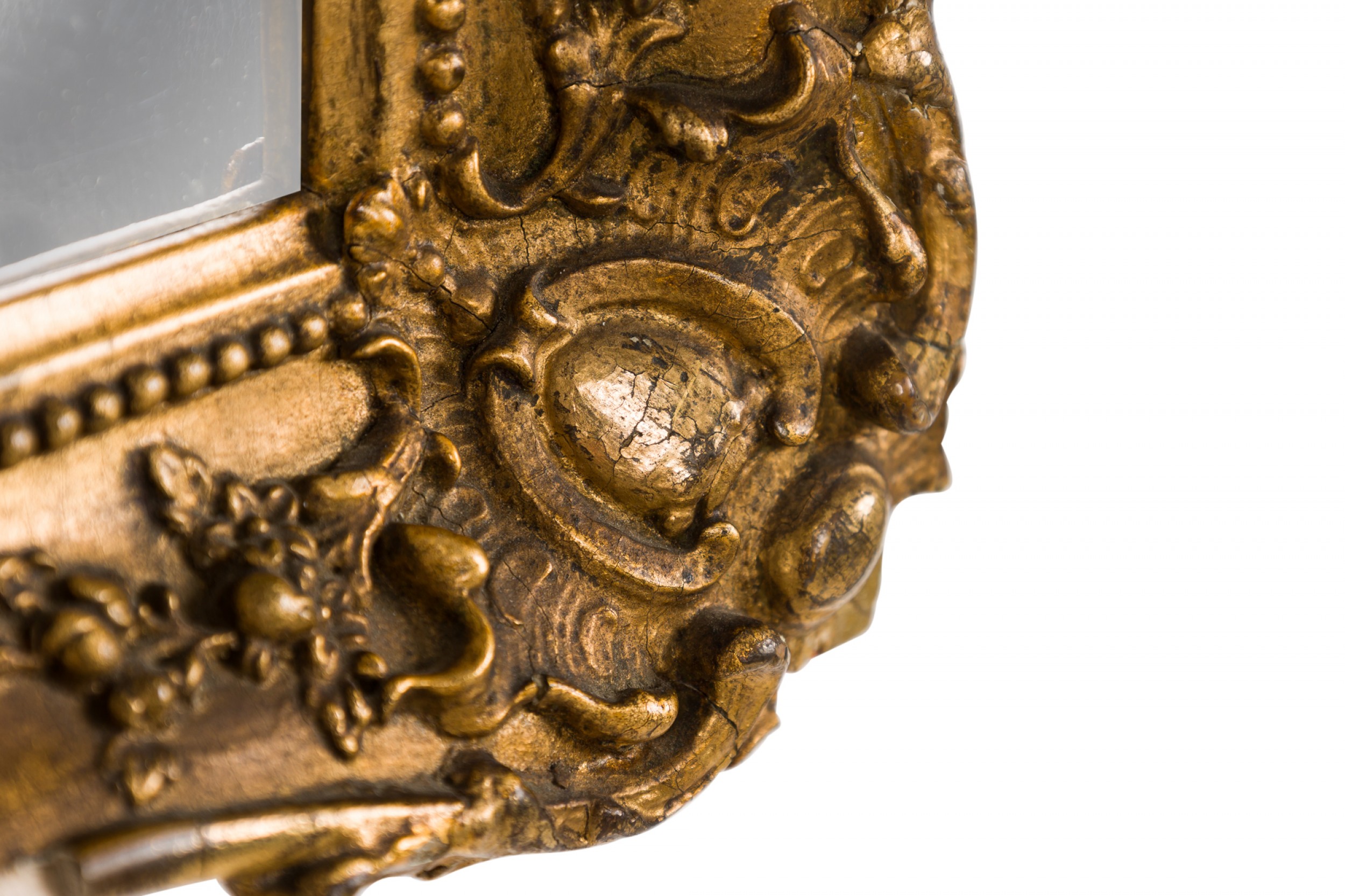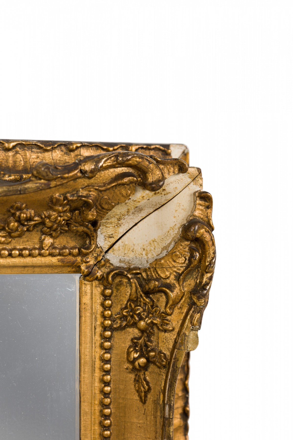 American Victorian style small mylar mirror mounted in a high relief scroll & foliate / beaded giltwood frame. (AS IS-damage to frame)