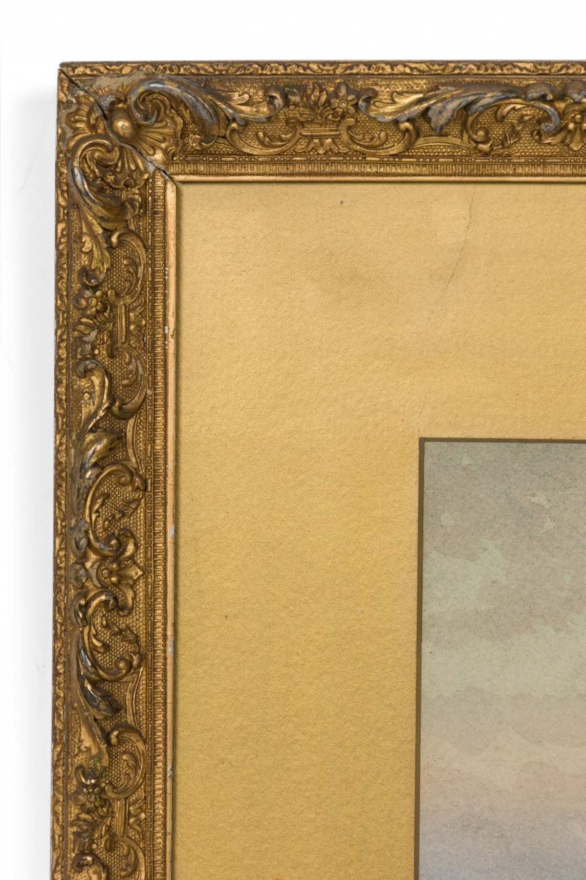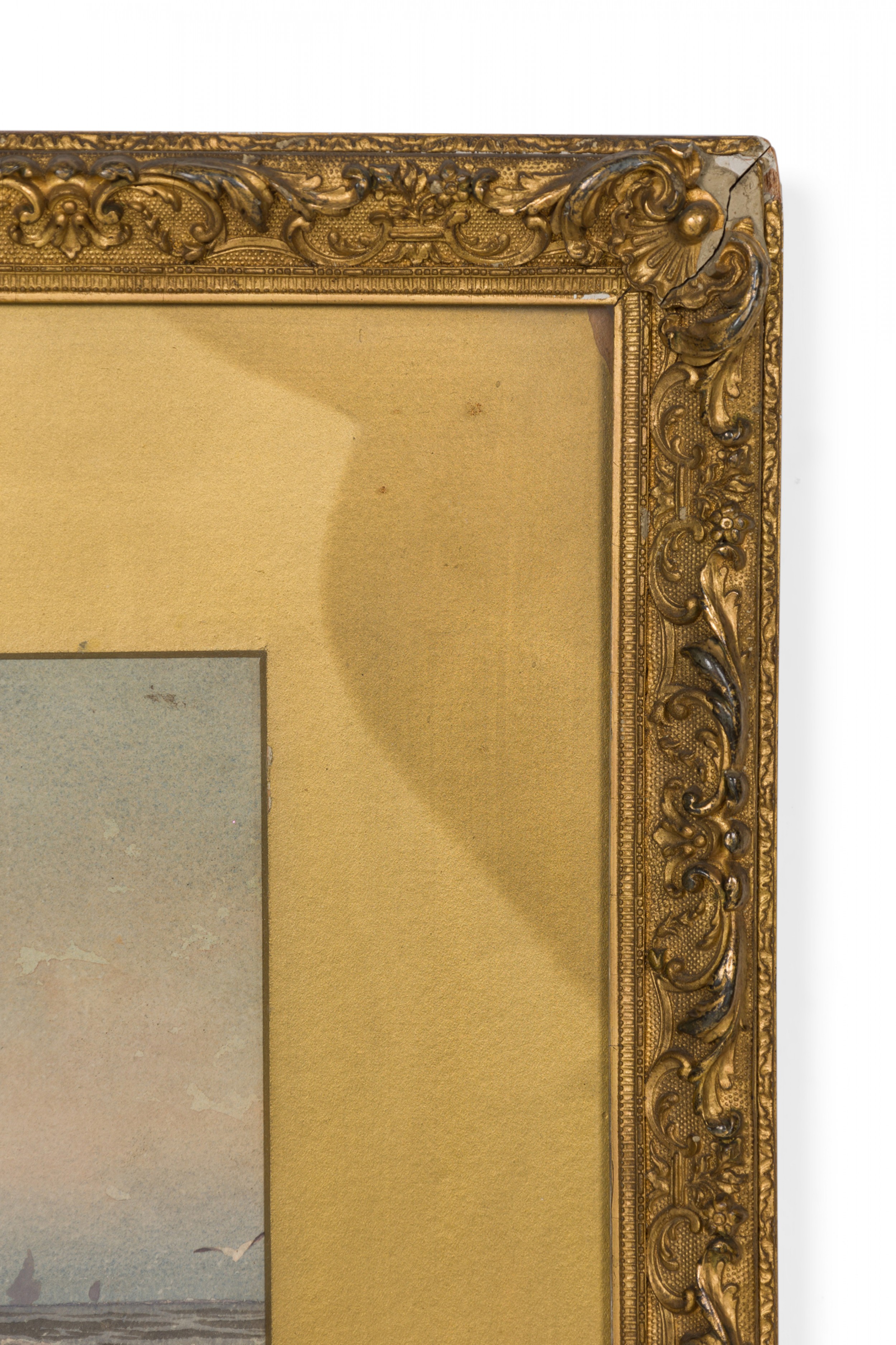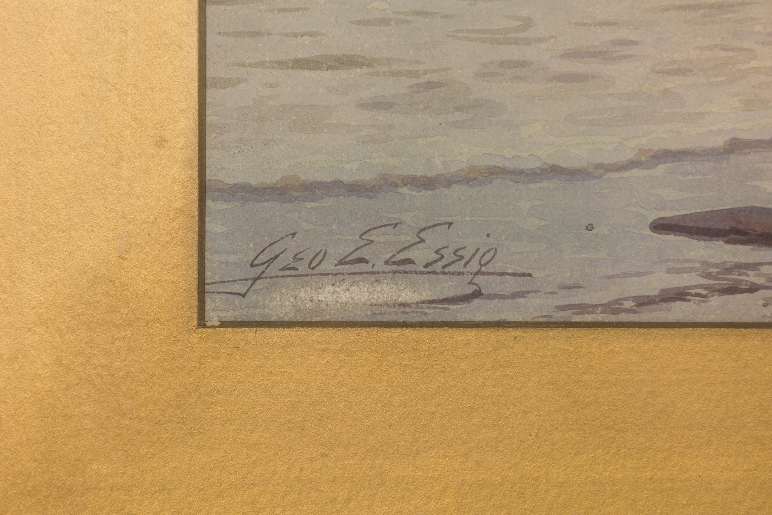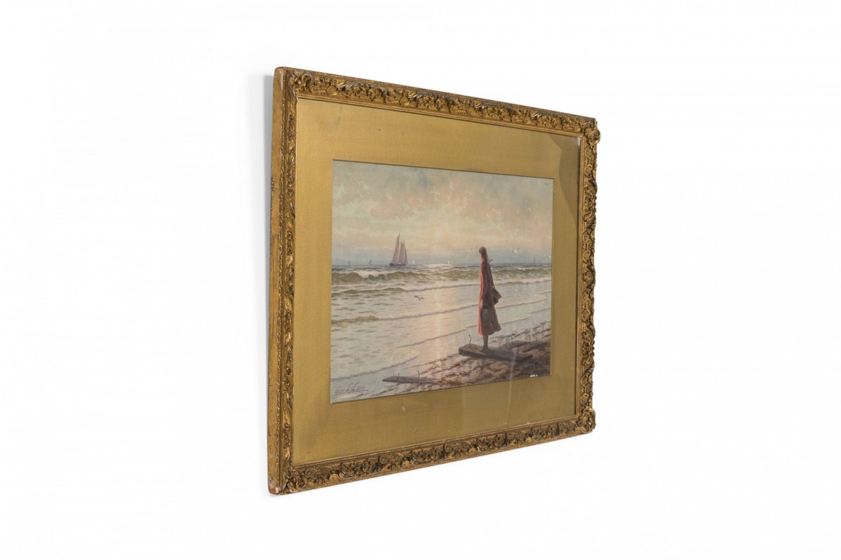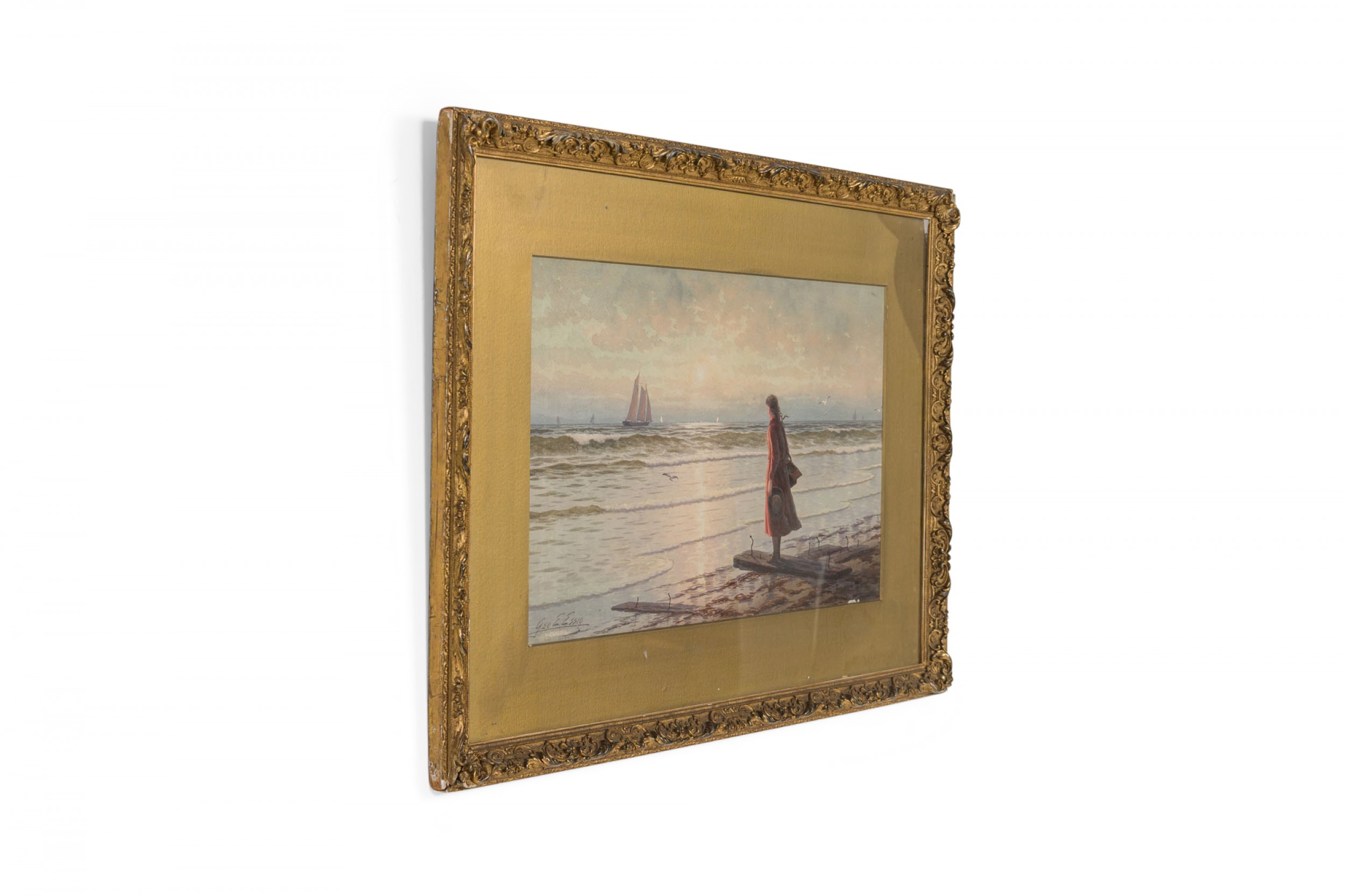 American Victorian 19th Cent watercolor of girl wearing red dress on shore with boats in background in gilt frame (signed George Essing)